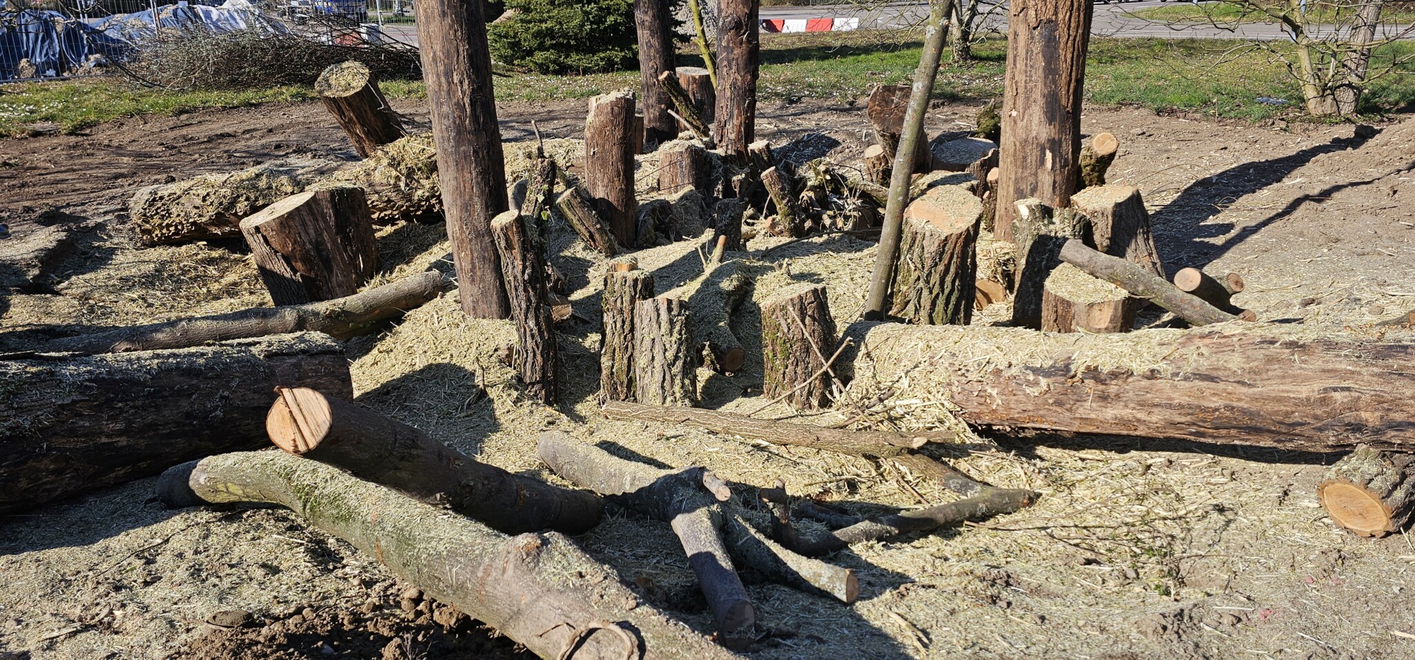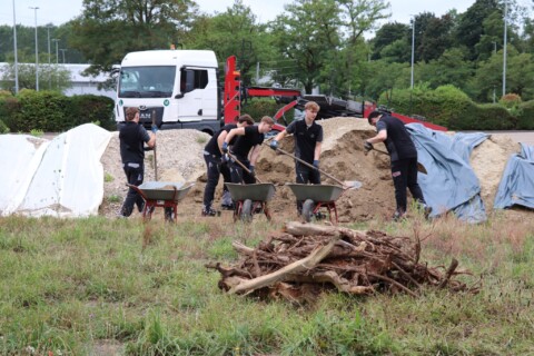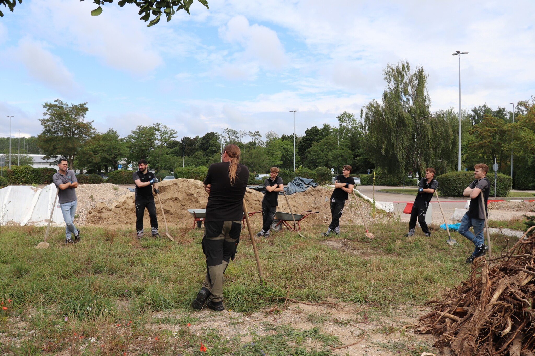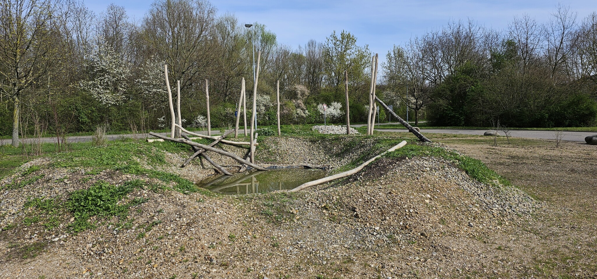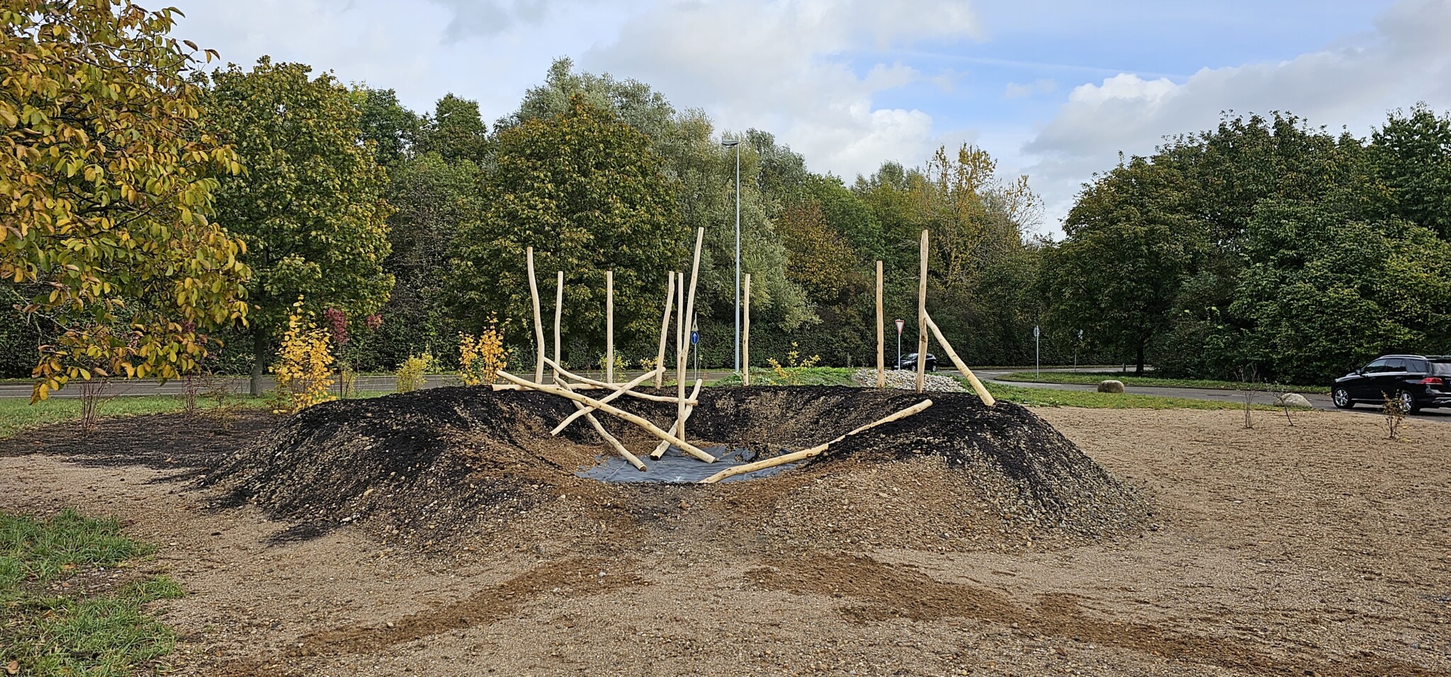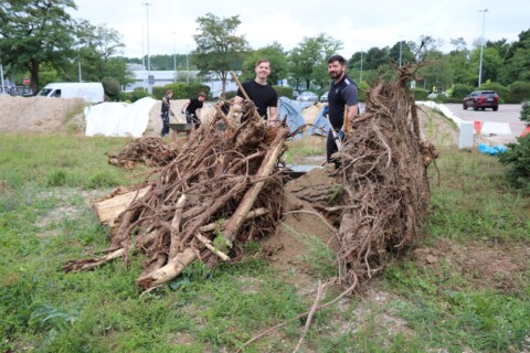 In drei Schritten wurden ca. 1400 m² der Rasenfläche entfernt und naturnah angelegt. Der Thymianrasen blieb unangetastet und 500 m² des Rasens rund um die Bäume blieb ebenfalls erhalten. Er wird jedoch nur noch 2 – 3 mal pro Jahr gemäht. Um unsere Projekte besser zu kommunizieren, teilen wir sie wenn notwendig bzw. möglich in Teilschritte auf, die jeweils einen Namen bekommen. Damit schaffen wir einen gewissen Wiedererkennungswert und fördern das Interesse – was steckt dahinter. Beim dargestellten Projekt wurde im ersten Schritt im Jahr 2023 auf ca. 500 m² eine Magerwiese geschaffen, die gestalterisch durch eine Hügellandschaft mit “Sandarium“ ergänzt wurde. Für den Hügel wurde das abgetragene Bodenmaterial der Rasenfläche verwendet und zusätzlich mit Schotter und Sand bedeckt. Der Hügel wurde teils mit Wildstauden bepflanzt, die Magerwiese stammt aus heimischem Saatgut. Im zweiten Schritt wurde Ende 2023/Anfang 2024 in direkter Nachbarschaft ein Vulkankegel errichtet, in dessen Zentrum ein kleiner, jedoch nicht dauerhaft gefüllter Teich mit Folie angelegt wurde. Aus dem Aushub entstand die Kraterwand mit einer Ausflussöffnung über die der mit Schotter belegte Teich sichtbar wird. Die umliegende Fläche wurde auf ca. 400 m² ebenfalls mager ausgebaut. Zwischen Krater und Baumreihe entlang der Straße wurde eine Gehölzsammlung als “Grüne Hölle“ gepflanzt. Hier wurde bereits Grünschnitt abgelagert, so dass er nicht extern entsorgt werden muss. Durch die Gehölze wird die “Grüne Hölle“ vom Rest der Magerwiese abgetrennt. Auch hier wurden heimische Stauden und heimische Saatgutmischungen verwendet. In einem dritten Schritt wurde im Jahr 2025 zwischen Vulkankegel und Thymianrasen auf ca. 500 m², nach dem Abtrag der umliegenden Grasnarbe, eine Käferburg als zentrales Element errichtet und die restliche Fläche mager ausgebaut. Die Käferburg besteht aus vielen Totholzelementen in unterschiedlicher Lage, im und über dem Boden eingebaut. Das ausgehobene Loch wurde mit Stroh und gehäckseltem Gehölzschnitt von anderen Grünflächen aufgefüllt. Zum Einsatz kam zusätzlich Schotter, Kies und Sand aus eigenen Baustellen (Bau von Gruben und Austrag von Bodenmaterial), die nicht extern entsorgt werden mussten. Als Abgrenzung zwischen Käferburg und Straße wurde mit zwei Wurzelstöcken von Robinien, die im Rahmen von Baumaßnahmen gefällt werden mussten, ein “Wurzelstockwall“ errichtet. Dieser besteht aus den besagten Wurzelstöcken, zwei größeren Stammteilen und weiteren Ästen, die mit Sand aus eigenen Baustellen angefüllt wurden und im Herbst bepflanzt werden. Grundsätzlich stammen sämtliche Materialien entweder vom Werksgelände bzw. aus dem näheren Umfeld, z.B. das Totholz teils von den zwei eigenen, gefällten Robinien bzw. Laubbäumen aus dem Rastatter Forst (angemodertes Holz aus dem Vorjahr, nach PEFC und FSC zertifiziert) und der Schotter/Sand der Bauabschnitte eins und zwei aus umliegenden Kiesgruben bzw. Steinbrüchen. Wie bei den beiden seit 1 – 2 Jahren blühenden ersten Teilflächen wurde auch bei der Käferburg auf heimisches Saatgut (Rieger-Hofmann Mischungen Blumenwiese, Schmetterlings- und Wildbienensaum, Sandmagerrasen und Verkehrsbegleitgrün) und heimische Wildstauden gesetzt. Die beiliegende NaturaDB Pflanzenliste umfasst alle drei beschriebenen Teilflächen.