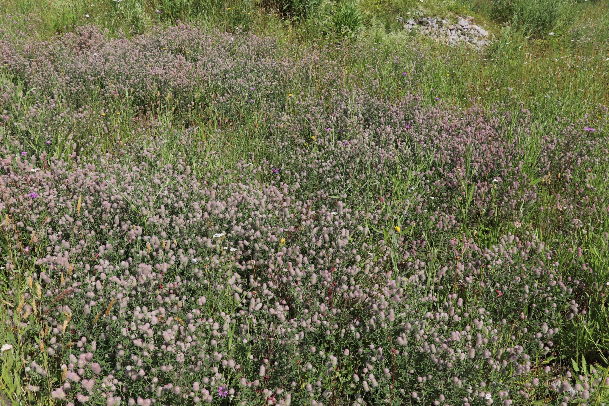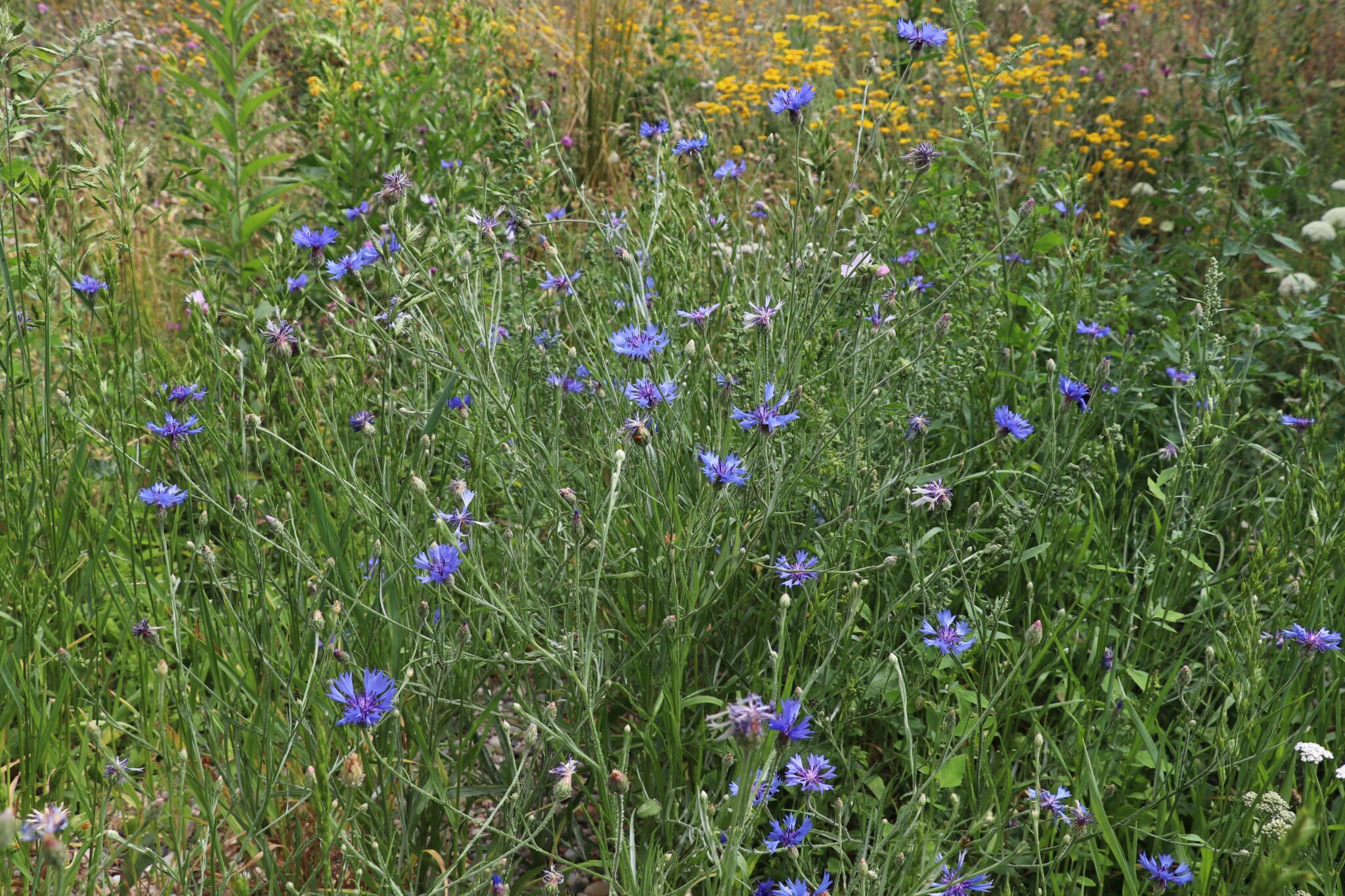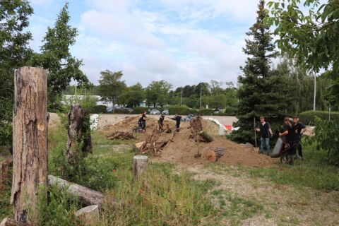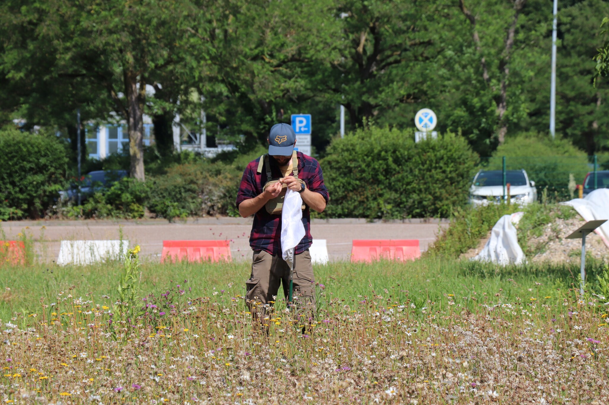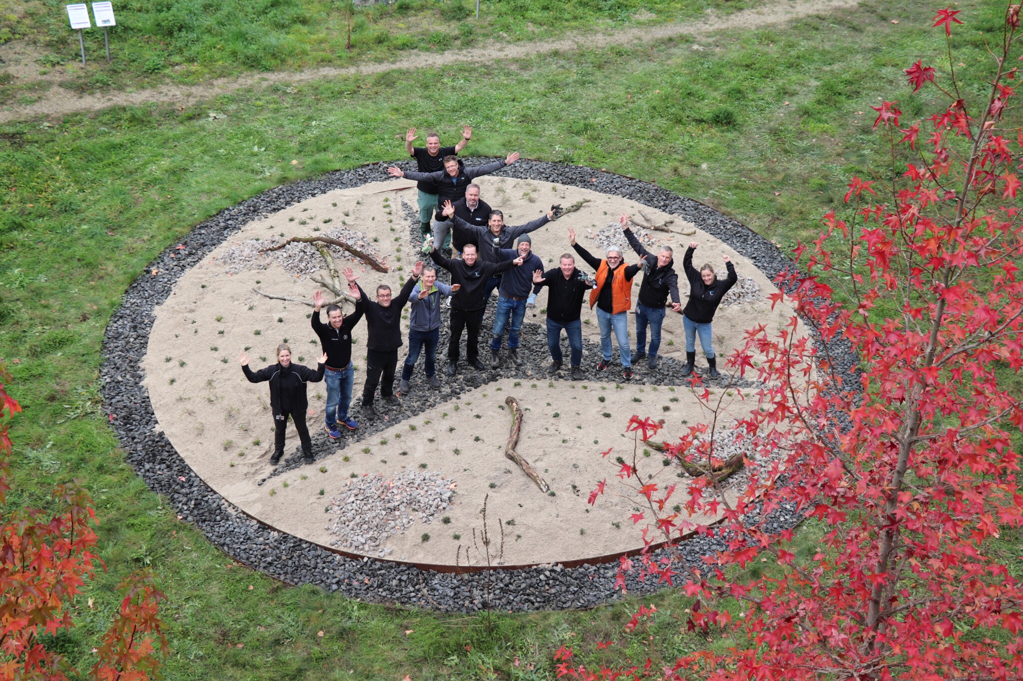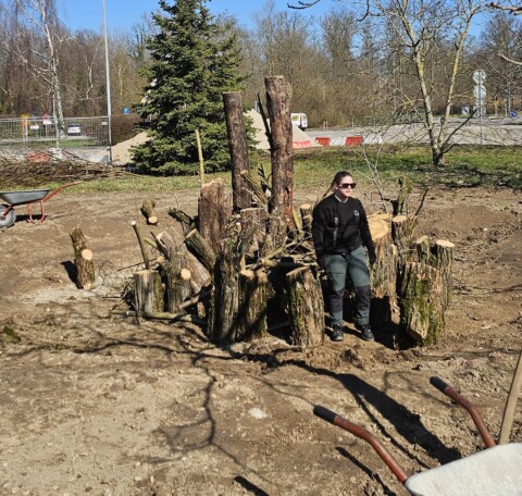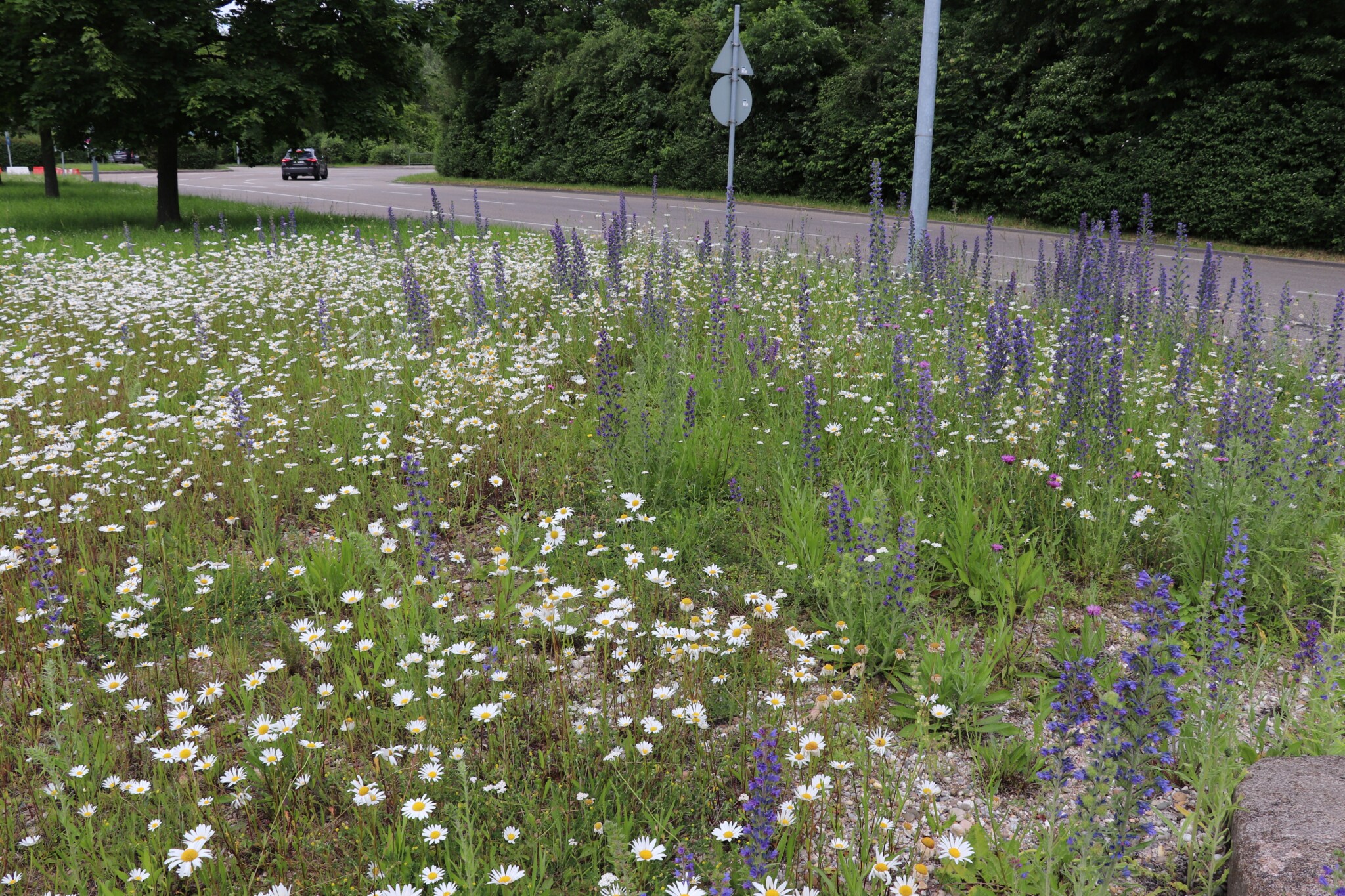 In drei Schritten wurden ca. 1400 m² der Rasenfläche entfernt und naturnah angelegt. Der Thymianrasen blieb unangetastet und 500 m² des Rasens rund um die Bäume blieb ebenfalls erhalten. Er wird jedoch nur noch 2 – 3 mal pro Jahr gemäht. Um unsere Projekte besser zu kommunizieren, teilen wir sie wenn notwendig bzw. möglich in Teilschritte auf, die jeweils einen Namen bekommen. Damit schaffen wir einen gewissen Wiedererkennungswert und fördern das Interesse – was steckt dahinter. Beim dargestellten Projekt wurde im ersten Schritt im Jahr 2023 auf ca. 500 m² eine Magerwiese geschaffen, die gestalterisch durch eine Hügellandschaft mit “Sandarium“ ergänzt wurde. Für den Hügel wurde das abgetragene Bodenmaterial der Rasenfläche verwendet und zusätzlich mit Schotter und Sand bedeckt. Der Hügel wurde teils mit Wildstauden bepflanzt, die Magerwiese stammt aus heimischem Saatgut. Im zweiten Schritt wurde Ende 2023/Anfang 2024 in direkter Nachbarschaft ein Vulkankegel errichtet, in dessen Zentrum ein kleiner, jedoch nicht dauerhaft gefüllter Teich mit Folie angelegt wurde. Aus dem Aushub entstand die Kraterwand mit einer Ausflussöffnung über die der mit Schotter belegte Teich sichtbar wird. Die umliegende Fläche wurde auf ca. 400 m² ebenfalls mager ausgebaut. Zwischen Krater und Baumreihe entlang der Straße wurde eine Gehölzsammlung als “Grüne Hölle“ gepflanzt. Hier wurde bereits Grünschnitt abgelagert, so dass er nicht extern entsorgt werden muss. Durch die Gehölze wird die “Grüne Hölle“ vom Rest der Magerwiese abgetrennt. Auch hier wurden heimische Stauden und heimische Saatgutmischungen verwendet. In einem dritten Schritt wurde im Jahr 2025 zwischen Vulkankegel und Thymianrasen auf ca. 500 m², nach dem Abtrag der umliegenden Grasnarbe, eine Käferburg als zentrales Element errichtet und die restliche Fläche mager ausgebaut. Die Käferburg besteht aus vielen Totholzelementen in unterschiedlicher Lage, im und über dem Boden eingebaut. Das ausgehobene Loch wurde mit Stroh und gehäckseltem Gehölzschnitt von anderen Grünflächen aufgefüllt. Zum Einsatz kam zusätzlich Schotter, Kies und Sand aus eigenen Baustellen (Bau von Gruben und Austrag von Bodenmaterial), die nicht extern entsorgt werden mussten. Als Abgrenzung zwischen Käferburg und Straße wurde mit zwei Wurzelstöcken von Robinien, die im Rahmen von Baumaßnahmen gefällt werden mussten, ein “Wurzelstockwall“ errichtet. Dieser besteht aus den besagten Wurzelstöcken, zwei größeren Stammteilen und weiteren Ästen, die mit Sand aus eigenen Baustellen angefüllt wurden und im Herbst bepflanzt werden. Grundsätzlich stammen sämtliche Materialien entweder vom Werksgelände bzw. aus dem näheren Umfeld, z.B. das Totholz teils von den zwei eigenen, gefällten Robinien bzw. Laubbäumen aus dem Rastatter Forst (angemodertes Holz aus dem Vorjahr, nach PEFC und FSC zertifiziert) und der Schotter/Sand der Bauabschnitte eins und zwei aus umliegenden Kiesgruben bzw. Steinbrüchen. Wie bei den beiden seit 1 – 2 Jahren blühenden ersten Teilflächen wurde auch bei der Käferburg auf heimisches Saatgut (Rieger-Hofmann Mischungen Blumenwiese, Schmetterlings- und Wildbienensaum, Sandmagerrasen und Verkehrsbegleitgrün) und heimische Wildstauden gesetzt. Die beiliegende NaturaDB Pflanzenliste umfasst alle drei beschriebenen Teilflächen.