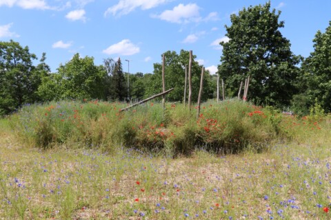 Eine ca. 2300 m² große Grünfläche sollte Anfang 2023 entsprechend bereits in den letzten Jahren umgesetzter Projekte naturnah gestaltet werden. Die relevante Rasenfläche beheimatet heute noch 7 Laubbäume unterschiedlicher Größe und einen Nadelbaum, der jährlich auch als Weihnachtsbaum genutzt wird. Im Randbereich hat sich auf ca. 400 m² ein Thymianrasen etabliert, der wie die Bäume erhalten wurde. Die gesamte Grünfläche wurde in der Vergangenheit monatlich gemäht und diente im Rahmen von Baumaßnahmen mehrfach als Abladefläche für Baufahrzeuge und -material.