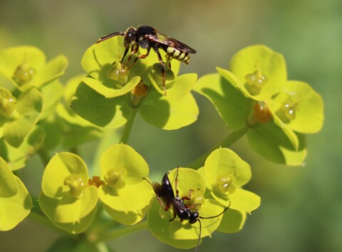 - Wildbienenmonitoring durch NABU-Waldinstitut (jährlich eine festgelegte naturnahe Fläche). Auf einzelnen Flächen konnten zwischen 35 und 68 Wildbienenarten bestimmt werden. Auf dieser Ergebnisbasis konnten die untersuchten Flächen in Anlehnung an Schwenninger & Wolf-Schwenninger (2004) in die Wertstufen 6 (hohe bzw. lokale Bedeutung) bis 8b (sehr hohe bzw. überregionale Bedeutung) eingestuft werden. Auf der vorgestellten Fläche findet das Wildbienen- und Tagfaltermonitoring durch das NABU Waldinstitut im laufenden Jahr 2025 statt. Bereits heute rechnet man damit, dass sich zahlreiche Wildbienenarten u.a. Insekten hier niedergelassen haben.