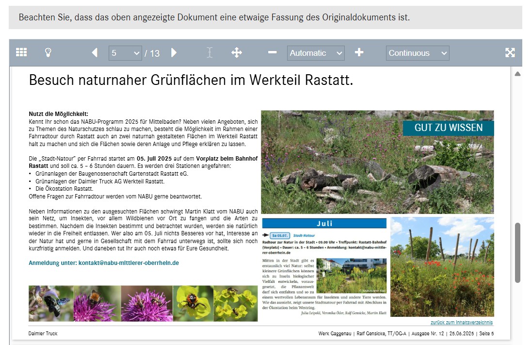 - Als EMAS zertifizierter Betrieb veröffentlichen wir jährlich unsere Umwelterklärung (neueste Version: Aktualisierte Umwelterklärung 2025 Werk Gaggenau) in der wir auch ausführlich über die Maßnahmen zur Förderung der Biodiversität an unseren Standorten berichten. Die letzte ausführliche Umwelterklärung stammt aus dem Jahr 2023.
