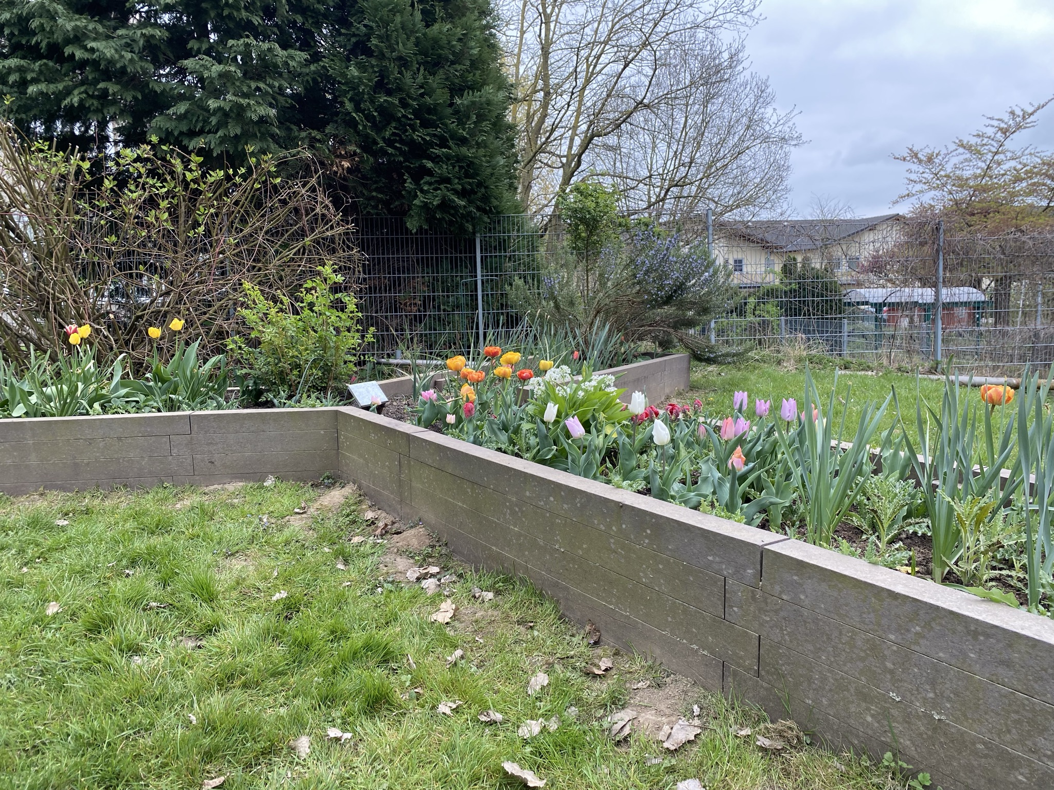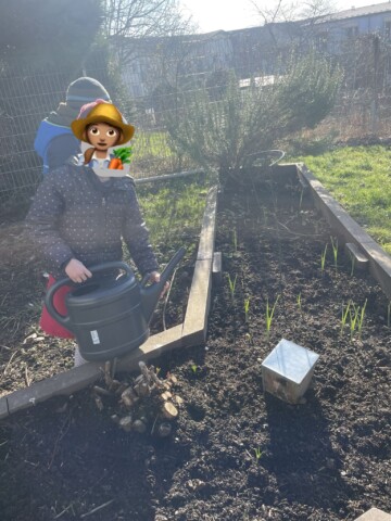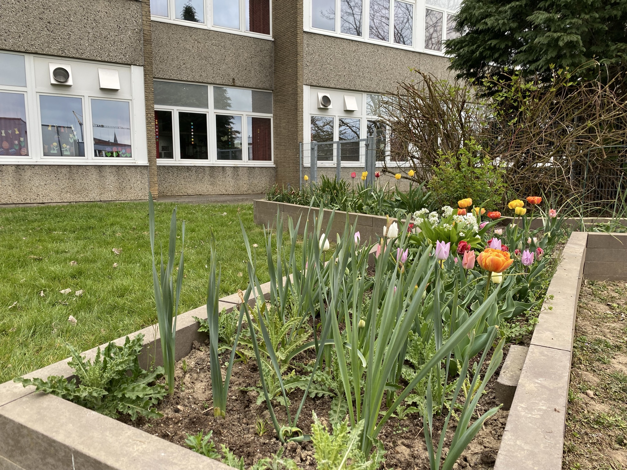 Ein Teil unseres Außengeländes wurde in ein insektenfreundliches Biotop verwandelt. Hier finden Bienen, Schmetterlinge und andere nützliche Insekten einen wertvollen Lebensraum. Besonders stolz sind wir auf unsere Erstklässlerinnen und Erstklässler: Mit großer Begeisterung haben sie unser Hochbeet vorbereitet und bepflanzt – ein sichtbarer Erfolg! Es ist eine Freude zu beobachten, wie sich bereits die ersten Insekten auf den frisch sprießenden Pflanzen tummeln. Es summt und brummt auf unserem Schulgelände!