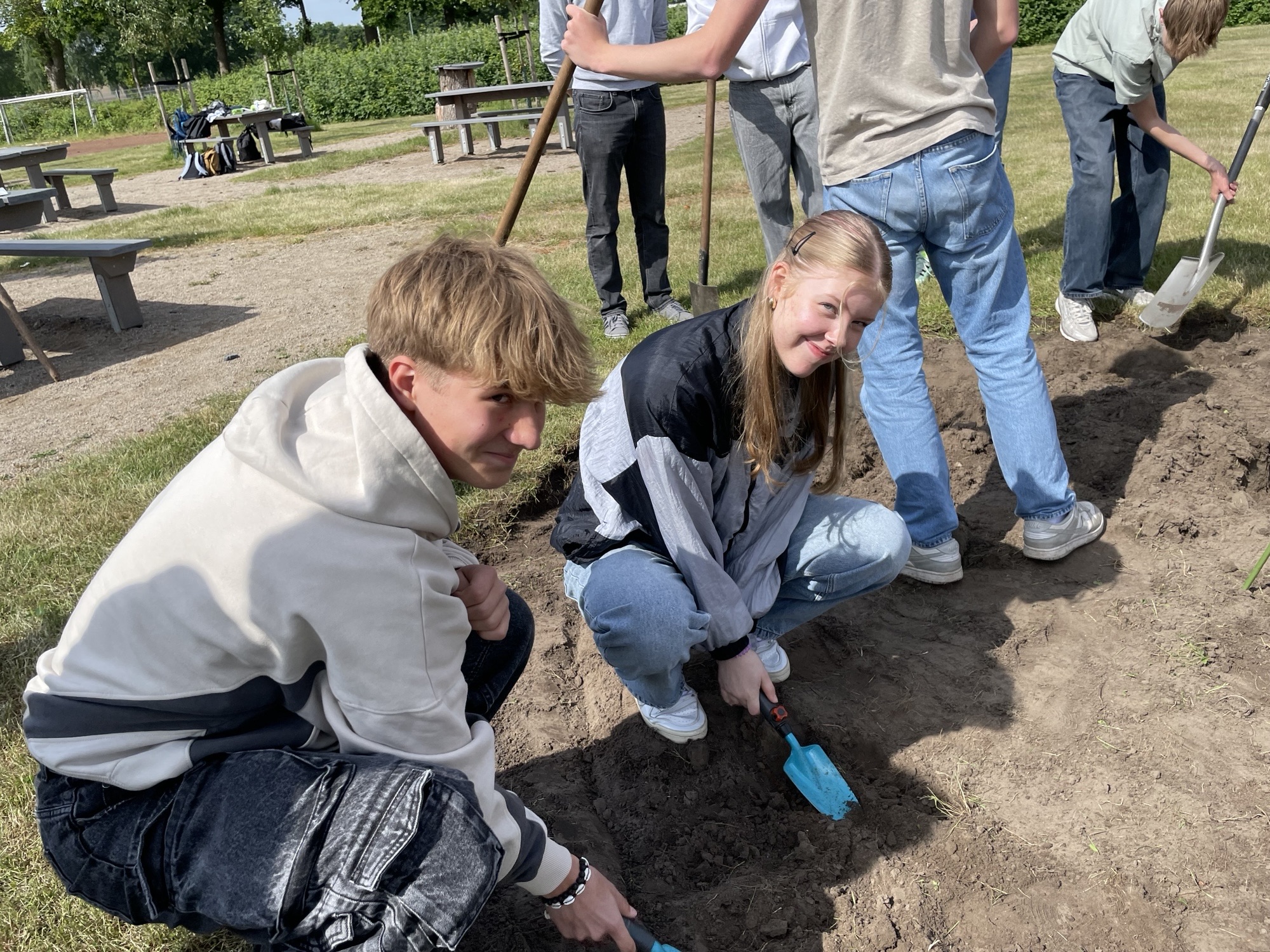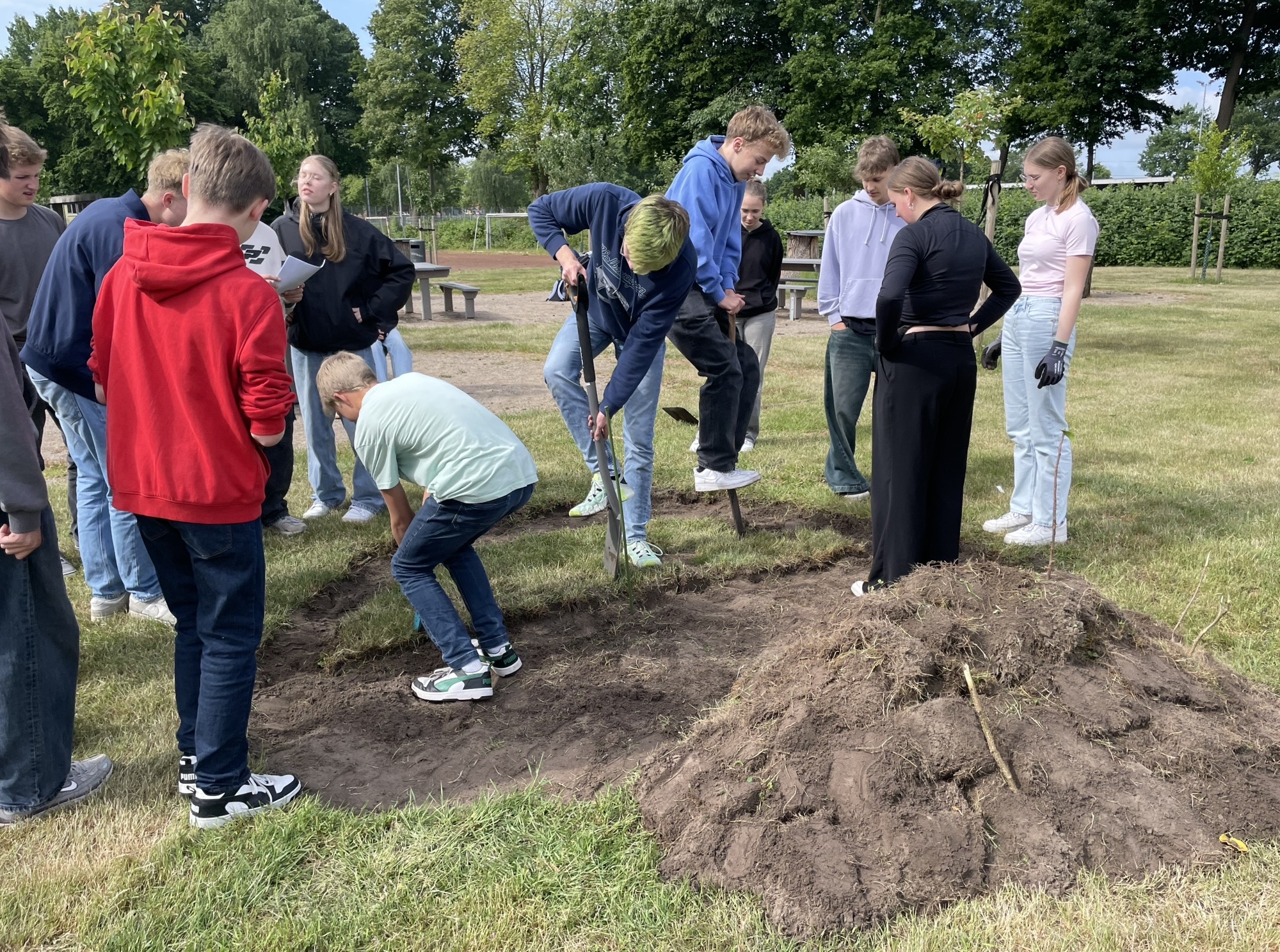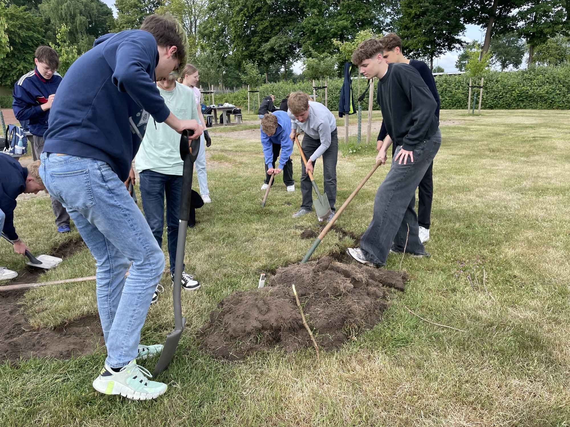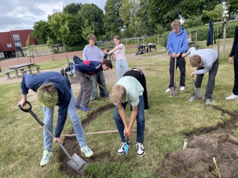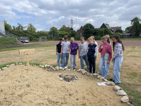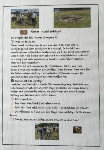 Als Beitrag zum Umwelt- und Artenschutz haben die Schülerinnen und Schüler des fächerverbindenden Unterrichts der Jahrgangsstufe 10 am Gymnasium Laurentianum in Warendorf einen Insektenhügel auf dem Schulgelände angelegt. Dieser wurde mit einer sorgfältig ausgewählten Blühsamen-Mischung (“Warendorfer Mischung“) eingesät. Die Blühsamen-Mischung wurde in Zusammenarbeit mit der NABU-Naturschutzstation Münsterland e. V. entwickelt und ist speziell auf die Bedürfnisse heimischer Insekten wie Wildbienen, Hummeln und Schmetterlinge abgestimmt und enthält besonders blütenreiche einjährige, zweijährige und mehrjährige Arten für Insekten. Der Insektenhügel wird von einer Naturstein-Trockenmauer eingefasst. Die Trockenmauer erhöht die Strukturvielfalt im Lebensraum und schafft zusätzliche ökologische Nischen. Insektenarten, wie Wildbienen, Grabwespen, Käfer oder Schmetterlingsraupen finden z. B. hier Unterschlupf. Die Steine der Trockenmauer nehmen Sonnenwärme auf und geben sie langsam wieder ab. So entsteht ein geschütztes Mikroklima, das wärmeliebenden Insekten hilft, sich zu entwickeln. Auch Honigbienen lieben Blühflächen/Bienenweiden. Die eigenständige Anlage des neuen Lebensraums Insektenhügel, die Weitergabe von Wissen an unsere jüngsten Schülerinnen und Schüler sowie auch ein Besuch bei den Bienenvölkern der Lehrkraft und eine Honigprobe wecken Neugier und Begeisterung aller Lernenden nachhaltig. Wir freuen uns riesig über das Ergebnis!
