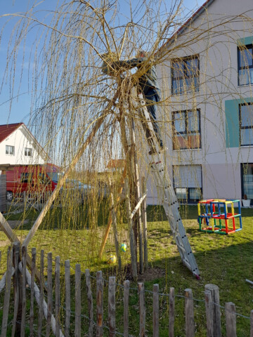 Der große Nistkasten für Stare wird aufgehängt.