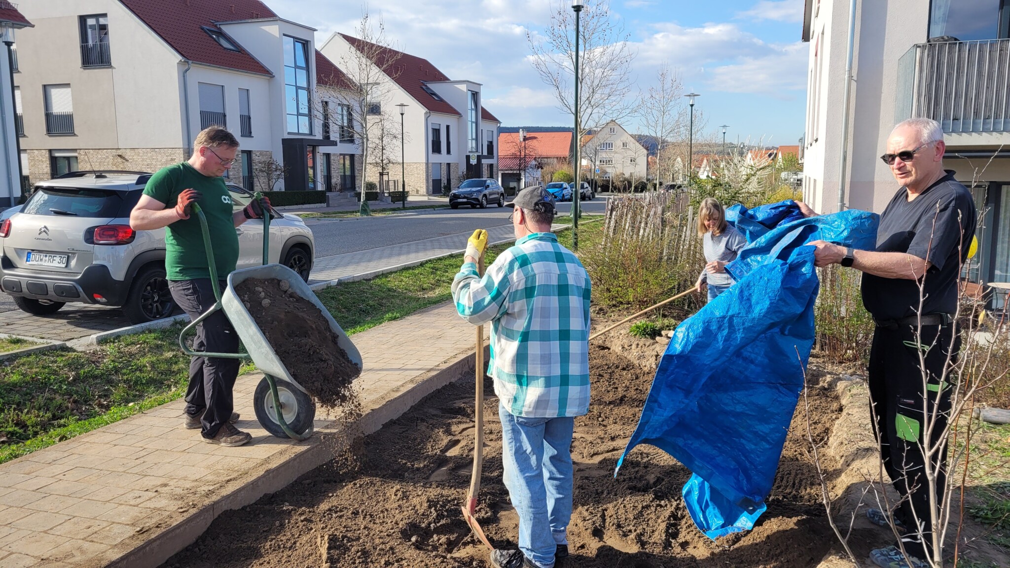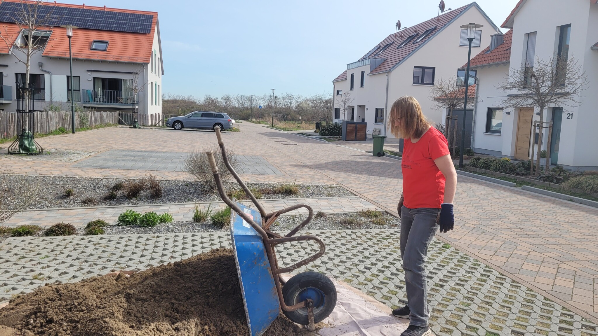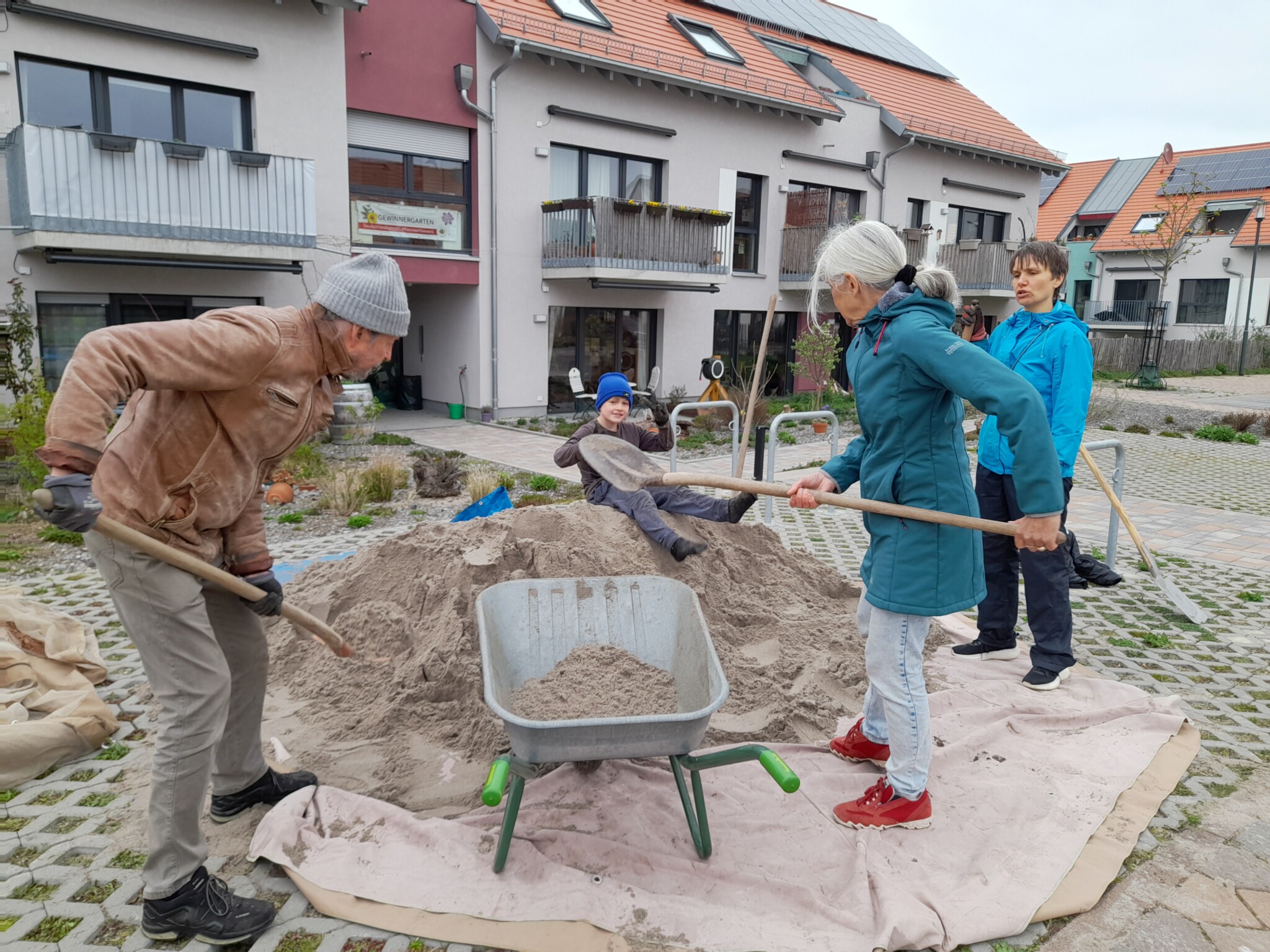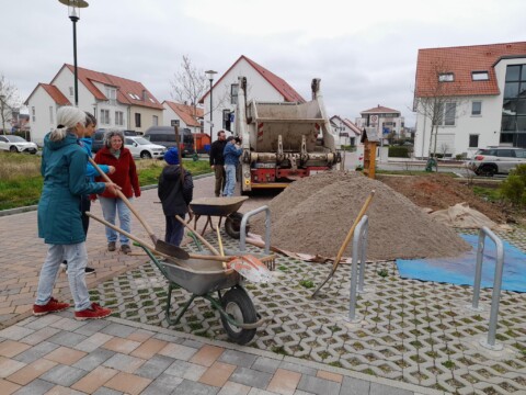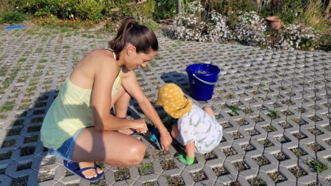 Bei Aufrufen zu Jät-Aktionen bekommen wir Hilfe von kleinen und großen Bewohnern. Neben den Beeten muss auch der Bewuchs auf den Parkplätzen von Zeit zu Zeit ausgedünnt werden,damit das Sedum nicht überwuchert wird.