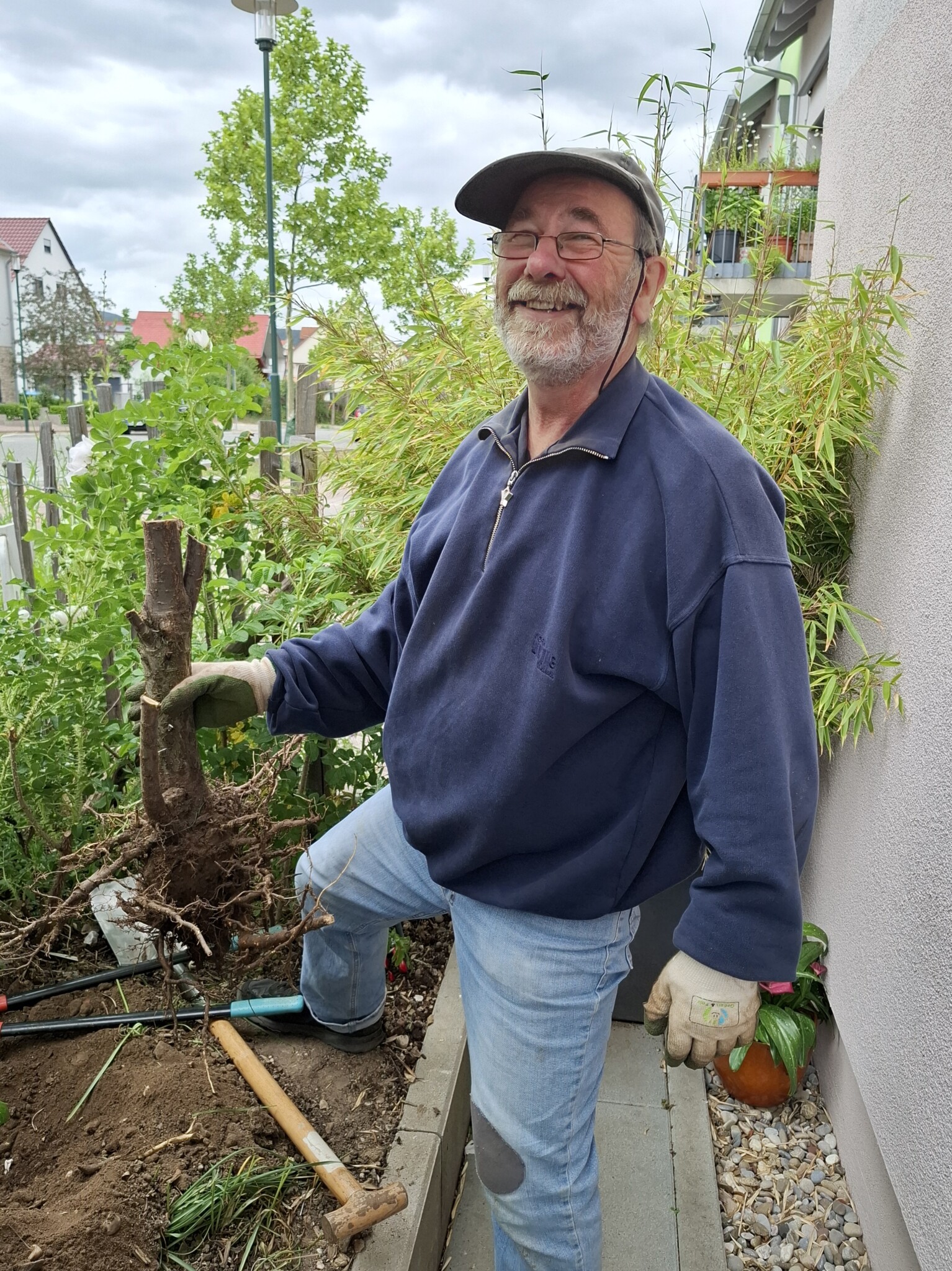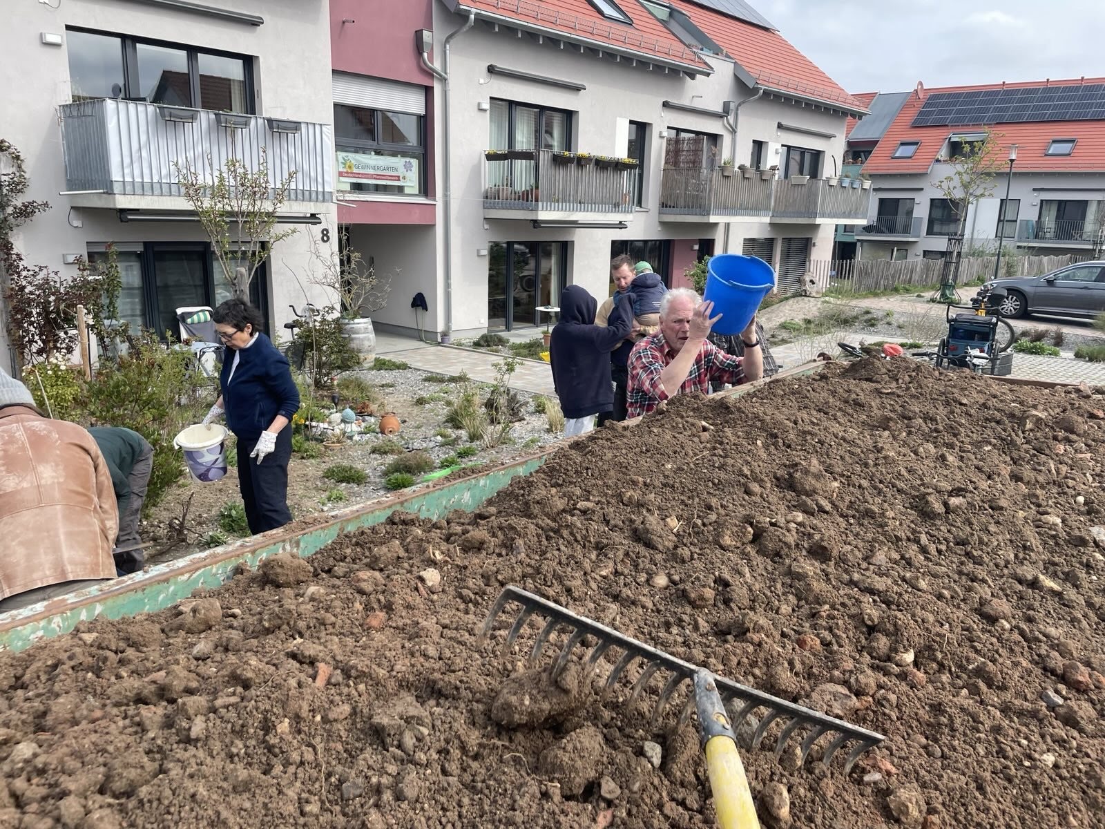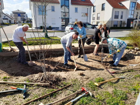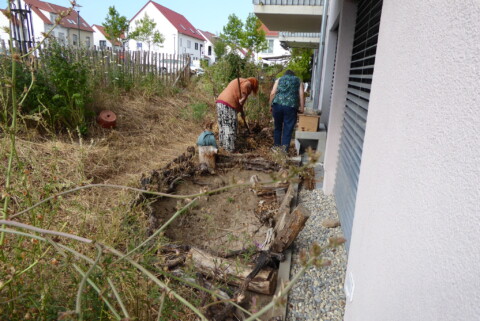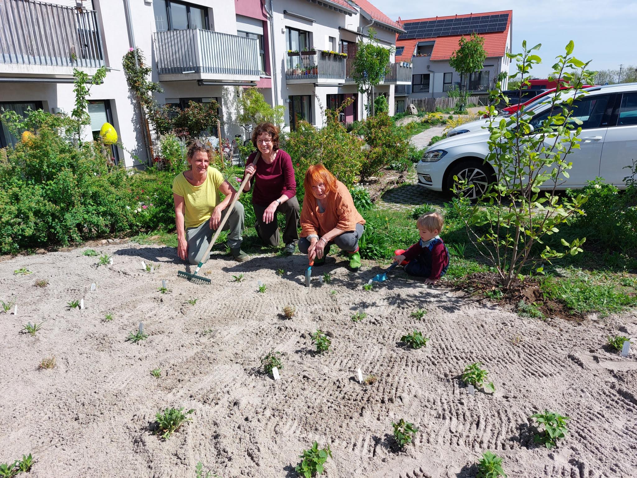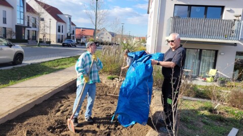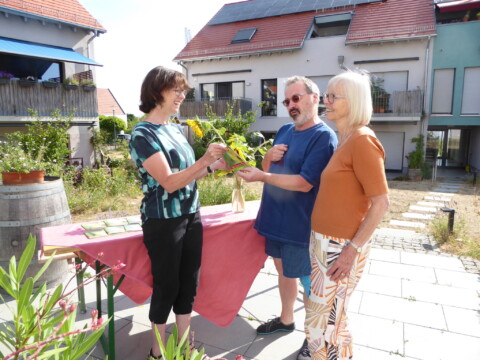 Unsere Gruppe besteht aus 14 Personen und kümmert sich um die Pflege der Außenanlage. Wir treffen uns in regelmäßigen Abständen, um zu beraten was in der nächsten Zeit anliegt, wie z. B. Neubepflanzungen, wann mähen wir die Blühwiesen, an welchen Standorten gedeihen die verschiedenen Pflanzen und Stauden am besten, wo hängen wir die Nistkästen auf, welche neuen Projekte gehen wir an und vieles mehr. Beratung holen wir uns von erfahrenen Fachleuten, die zum Teil auch hier wohnen oder vom NABU; sowie aus den Newslettern „Deutschland summt“, Garten-Ratgebern und Infos von „Birgit Schattling Bio-Balkone“. Bei größeren Gartenaktionen erhalten wir tatkräftige Unterstützung von den anderen Mitbewohnern.