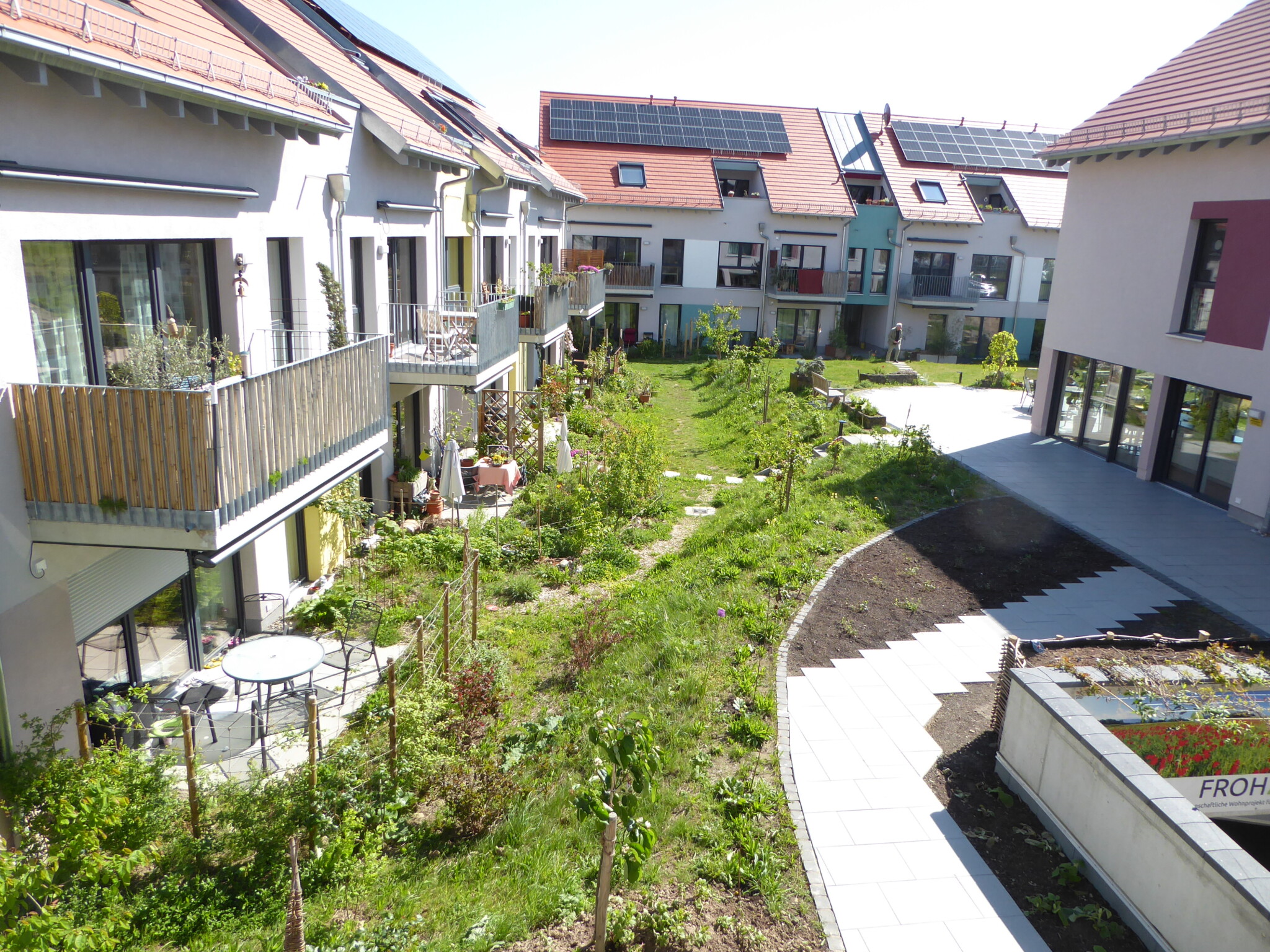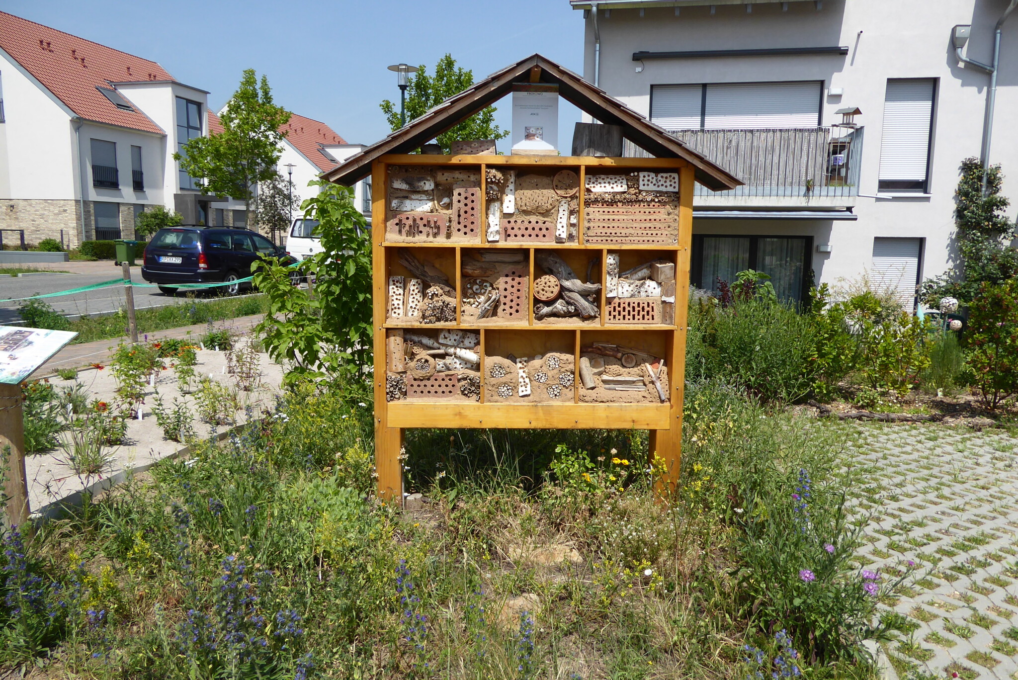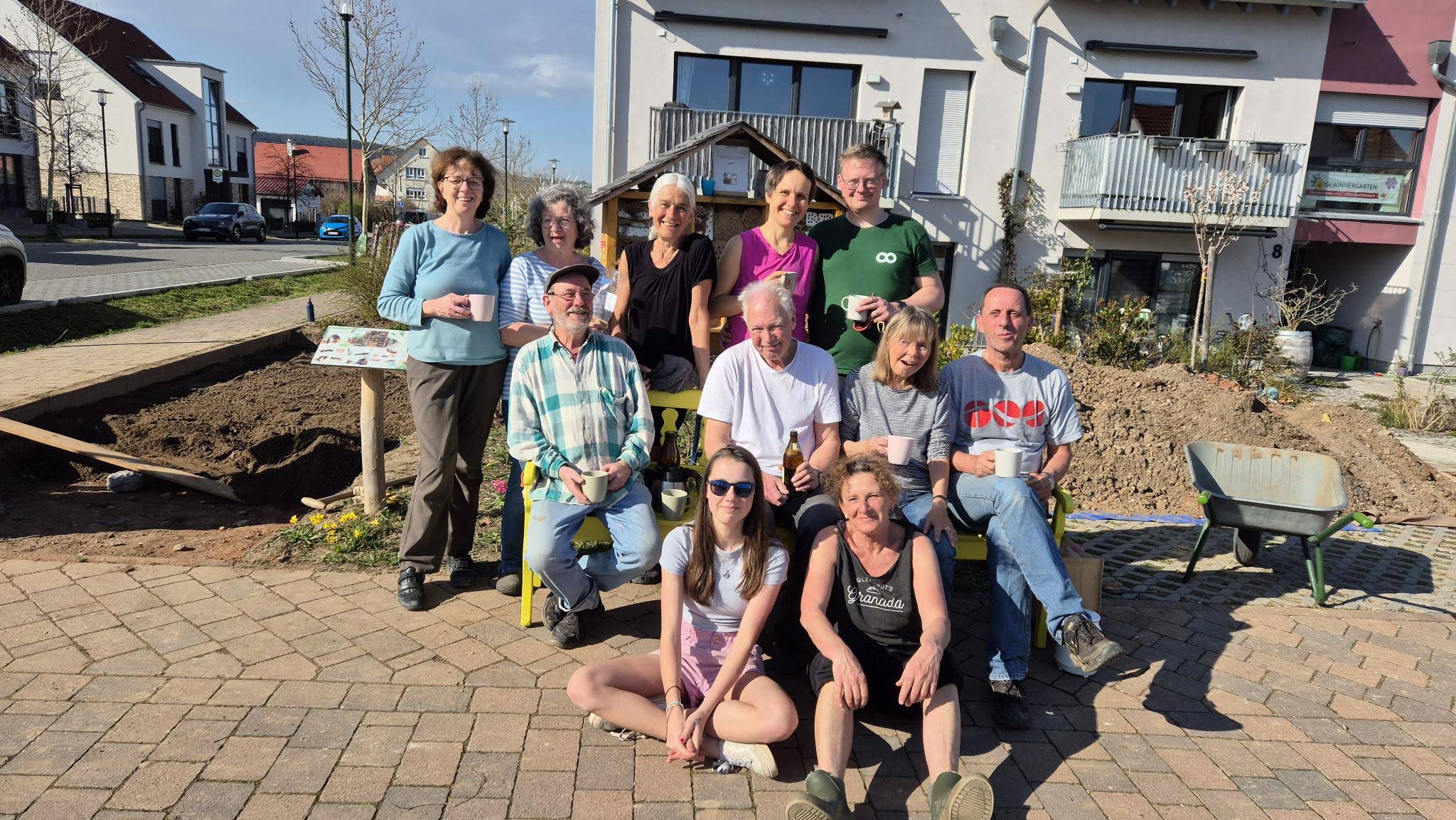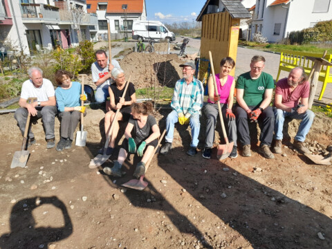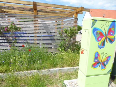 Seit 2021 leben wir in dem genossenschaftlichen Mehrgenerationenprojekt „Froh2Wo“ in Bad Dürkheim. Es besteht aus 4 Häusern mit 2000m² Außengelände und 74 Bewohnern zwischen 3 und 87 Jahren. Von Anfang an machen sich die 14 Mitglieder unserer Arbeitsgruppe „Wilde Wiese“ Gedanken, um unser Gelände so naturnah und insektenfreundlich wie möglich zu gestalten. Es wurden von uns Bäume und Büsche gepflanzt, verschiedene Beete und Blühwiesen angelegt und Strukturen wie Totholzstellen, zwei Sandarien, Wasserstellen und ein Steinhaufen geschaffen. So finden verschiedene Tiere Lebensraum und die Artenvielfalt wird gefördert. Ein Jahresplan mit unseren gesammelten Ideen und Aufgaben hilft uns, das kommende Jahr zu strukturieren. Das Ziel ist, unsere Umgebung sowohl für die Tiere als auch für die Menschen lebenswerter zu machen. Die meisten Punkte setzen wir sogar um, oft mit der Hilfe vieler Mitbewohner.