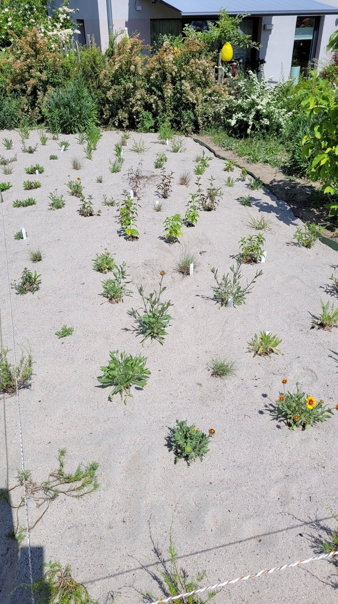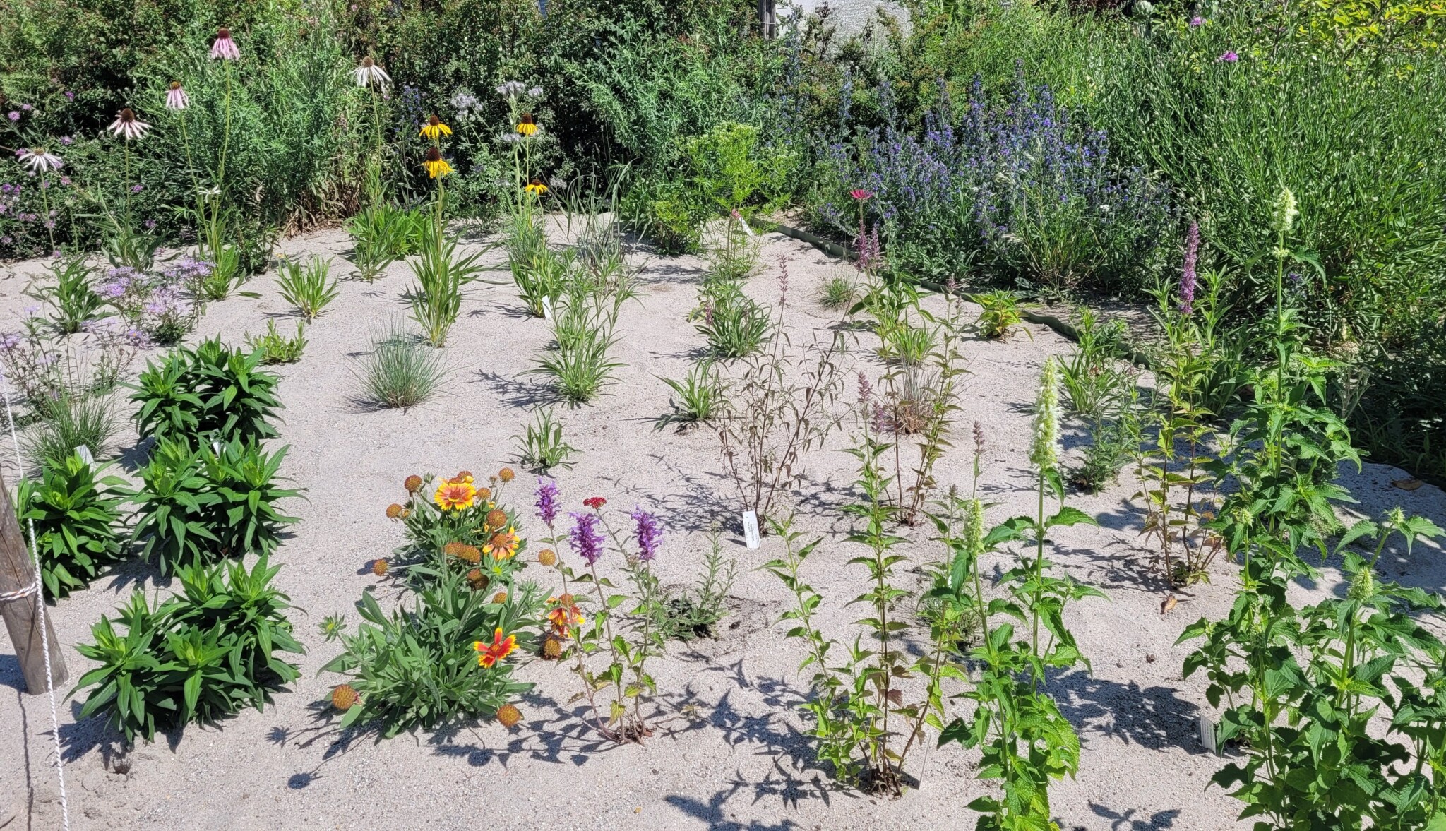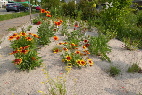 In einer Zeitschrift stießen wir auf einen Artikel über Präriepflanzen im Sandbeet. Die Pflanzen sind bienen- und insektenfreundlich, wie auch sehr viele einheimische Wildpflanzen auf unserem Gelände. Außerdem vertragen sie Sonne, Wind und auch mal Starkregen – perfekt für unser Beet. Auch das Experiment Sandbeet wollten wir wagen; durch die 20 cm dicke Sand-Mulchschicht versprechen wir uns weniger Gießen und Jäten.
