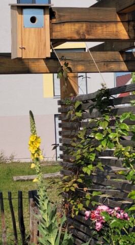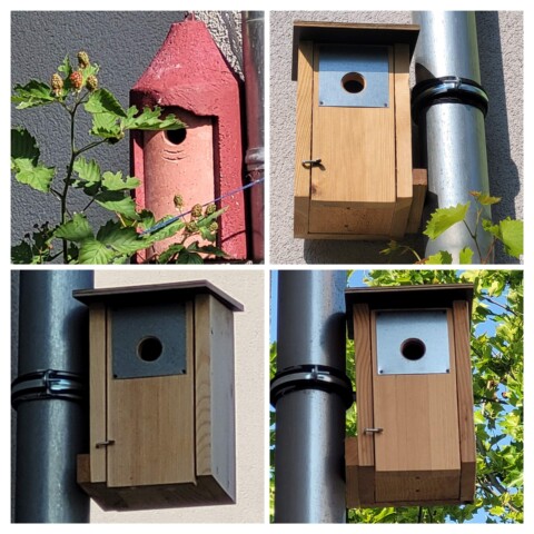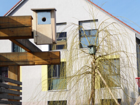 Da die meisten Bäume auf unserem Gelände noch zu klein sind um Nistkästen daran aufzuhängen, hatten wir eine Beratung durch einen Naturschutzbeauftragten und Vogel-Experten vom NABU mit Ortsbegehung. Die empfohlenen Kästen haben wir teilweise selbst zusammengebaut und ein Mitglied unserer Gruppe übernahm das Aufhängen der sechs Kästen. So standen die „Wohnungen“ ab März für die Vögel bereit und ein Kohlmeisen-Pärchen war auch gleich interessiert.