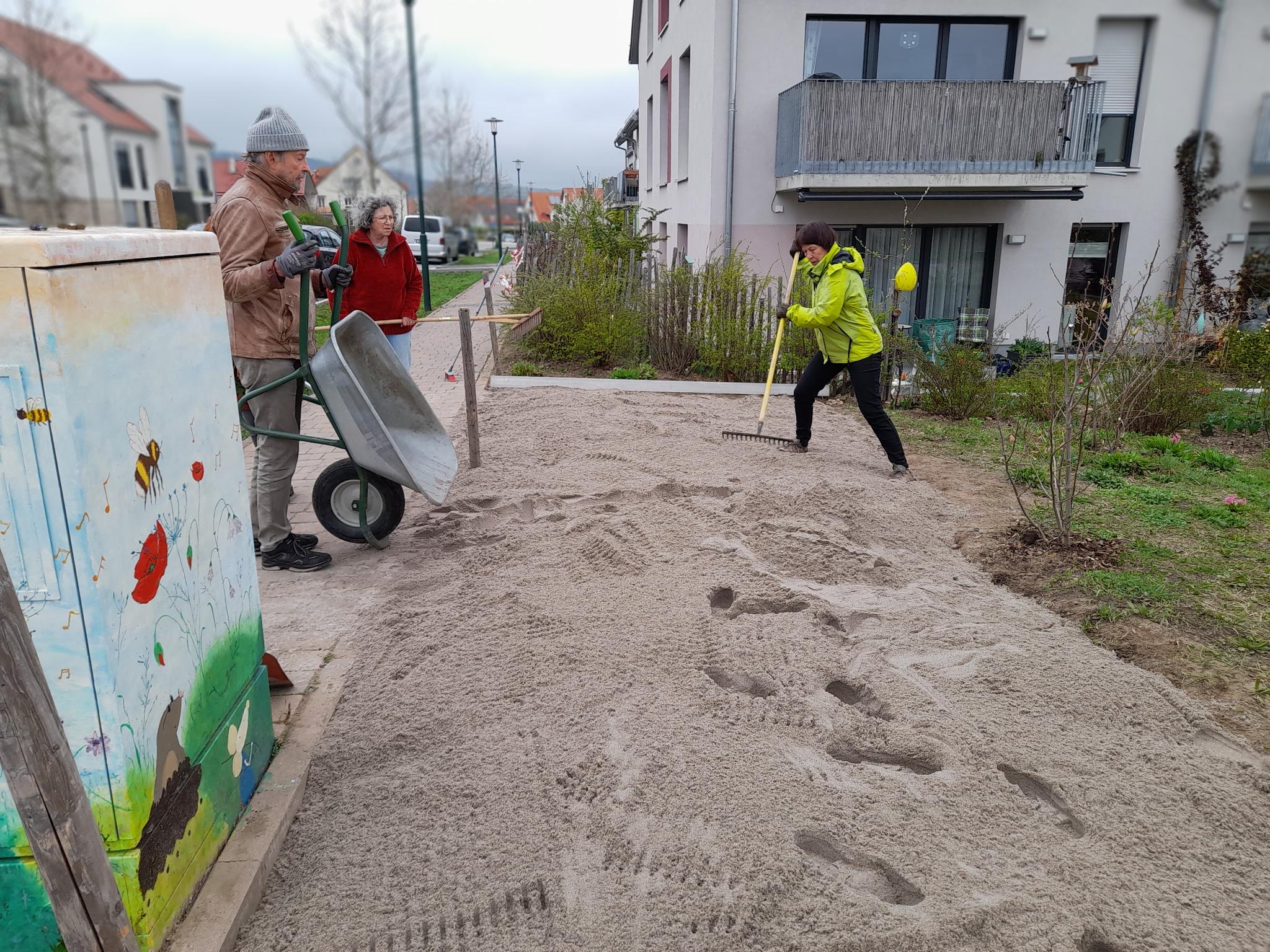Mit fünf Einsätzen, die uns viel Arbeit und Kraft gekostet haben, bereiteten wir im März das Beet vor. Zuerst musste der Boden ausgehoben werden, damit die 20 cm Sand ins Beet passen. Dazu haben wir die verbesserte Erde zur Wiederverwendung zur Seite geschaufelt. Danach wurden 30 cm alte, sehr harte und steinige Erde abgetragen und gelagert. Um die richtigen Voraussetzungen für den Pflanzenwuchs zu schaffen, wurde die gute Erde mit einer Schicht Kompost vermischt wieder ins Beet eingefüllt. Schließlich konnten die 5 Tonnen Sand im Beet verteilt werden. Den großen Berg alte Erde nahm uns ein Winzer ab, der durch Anpflanzung von Bäumen seine genossenschaftlichen Bio-Weinflächen von einer Monokultur in Biotope zur Verbesserung des Ökosystems umwandeln will.
