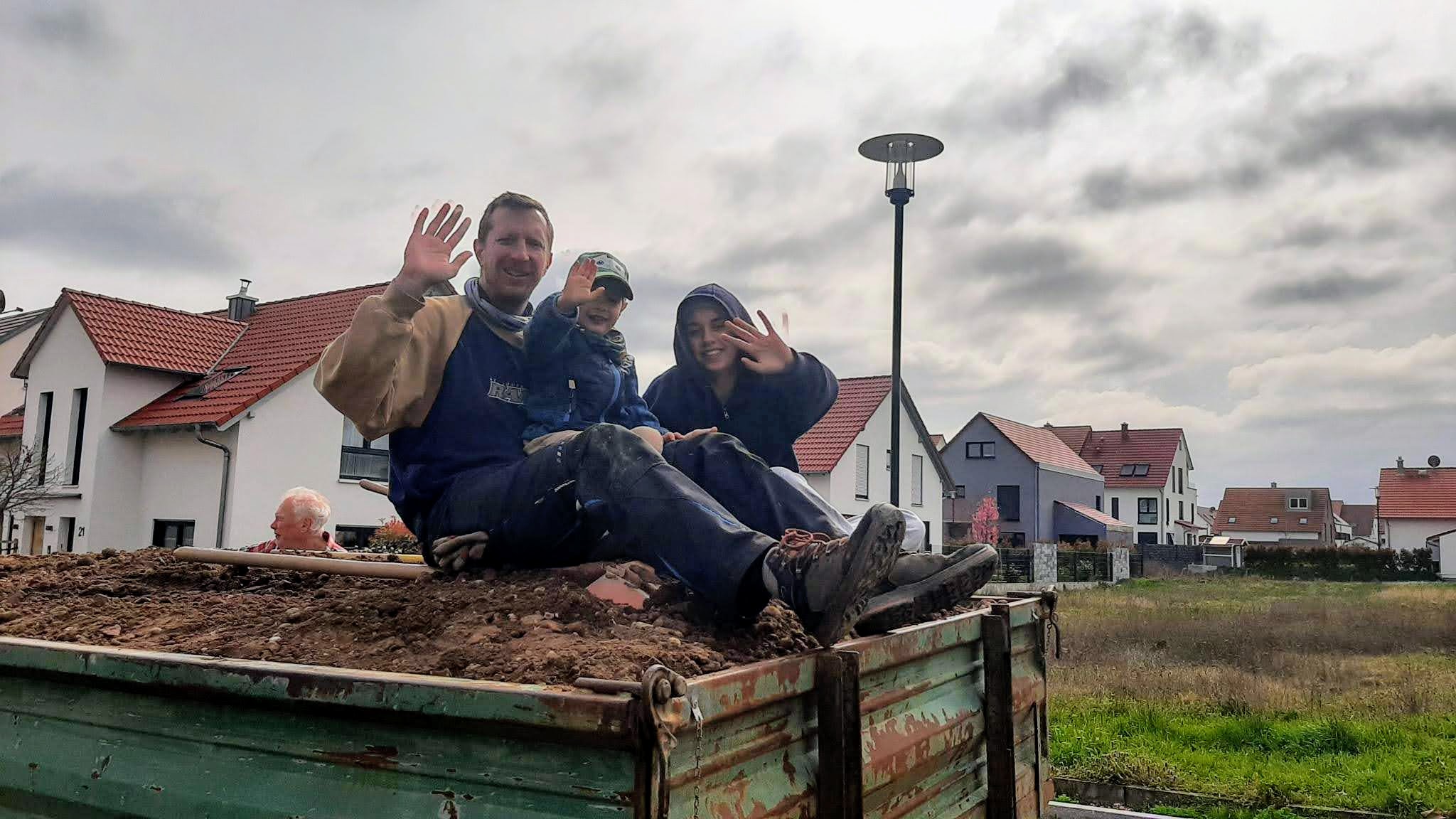 Einige Tonnen Lehm/Sand/Stein-Gemisch landen auf der Ladefläche des Anhängers. Ein Winzer nimmt sie uns ab.