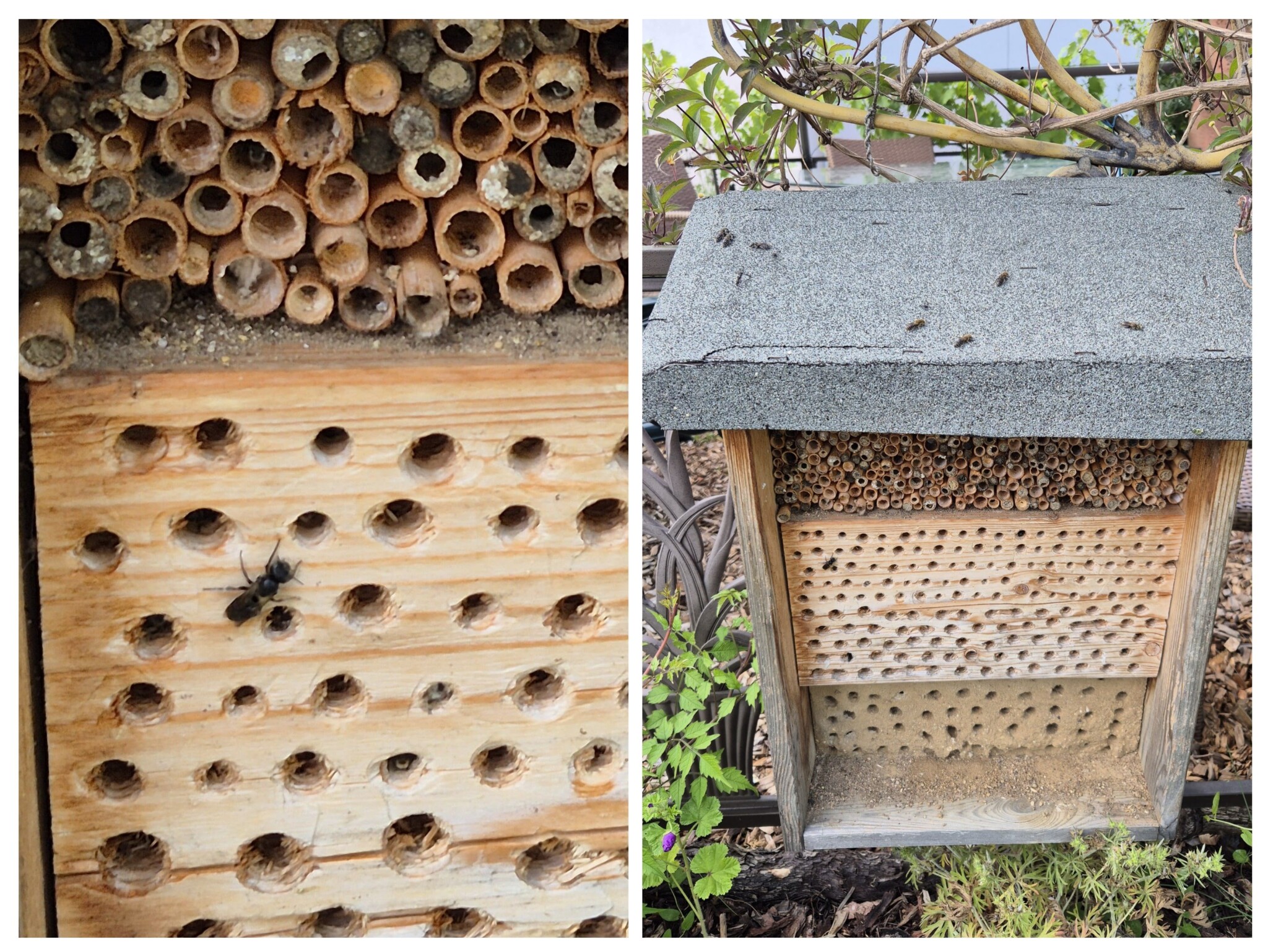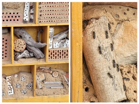 In unserem selbst angefertigten Insektenhaus tummeln sich viele verschiedene Insekten und Wildbienen.