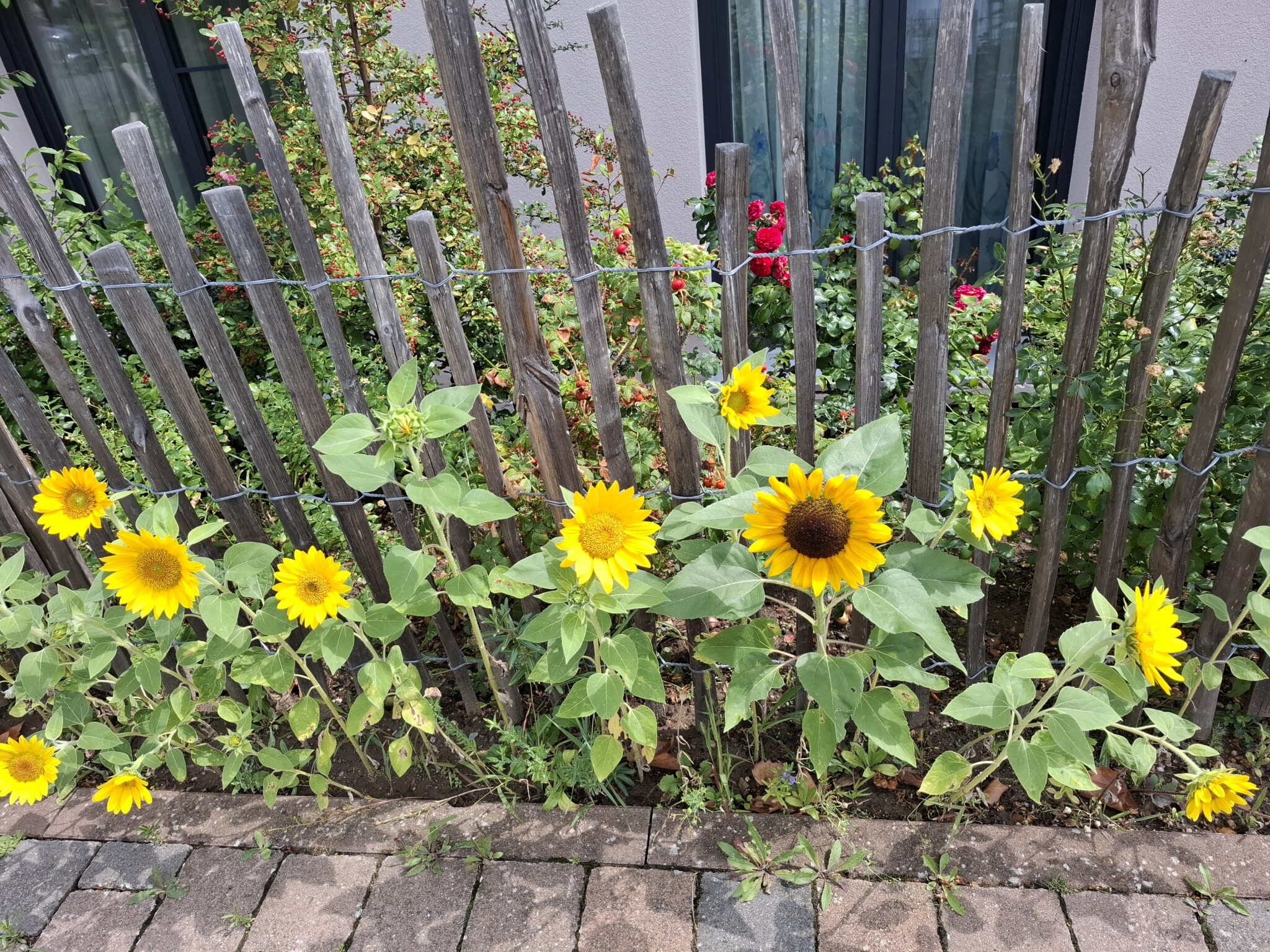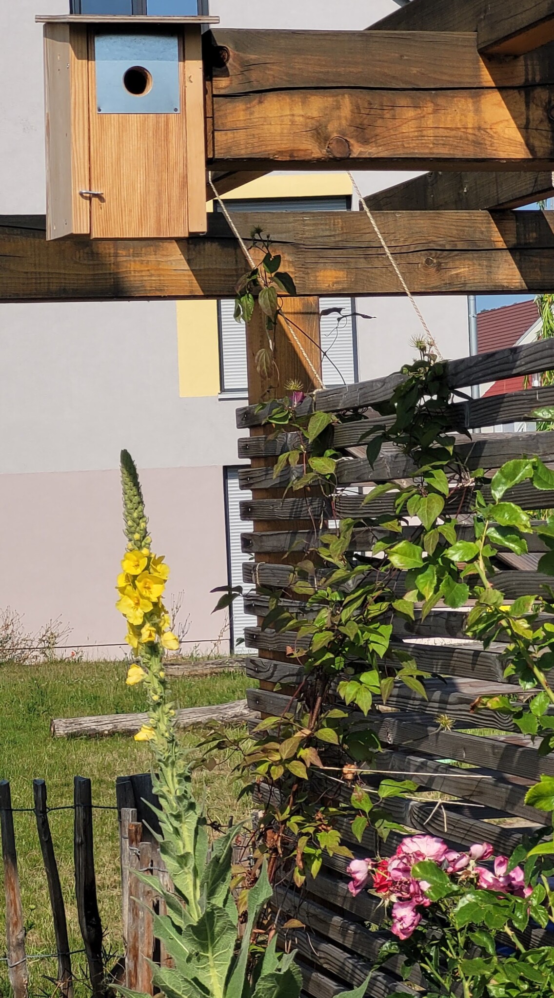Die Glyzine und die Kletterrose am Regenrohr sehen schön aus. Als vertikale Begrünung wird die Glyzine an Seilen über den südlichen Eingang gezogen.