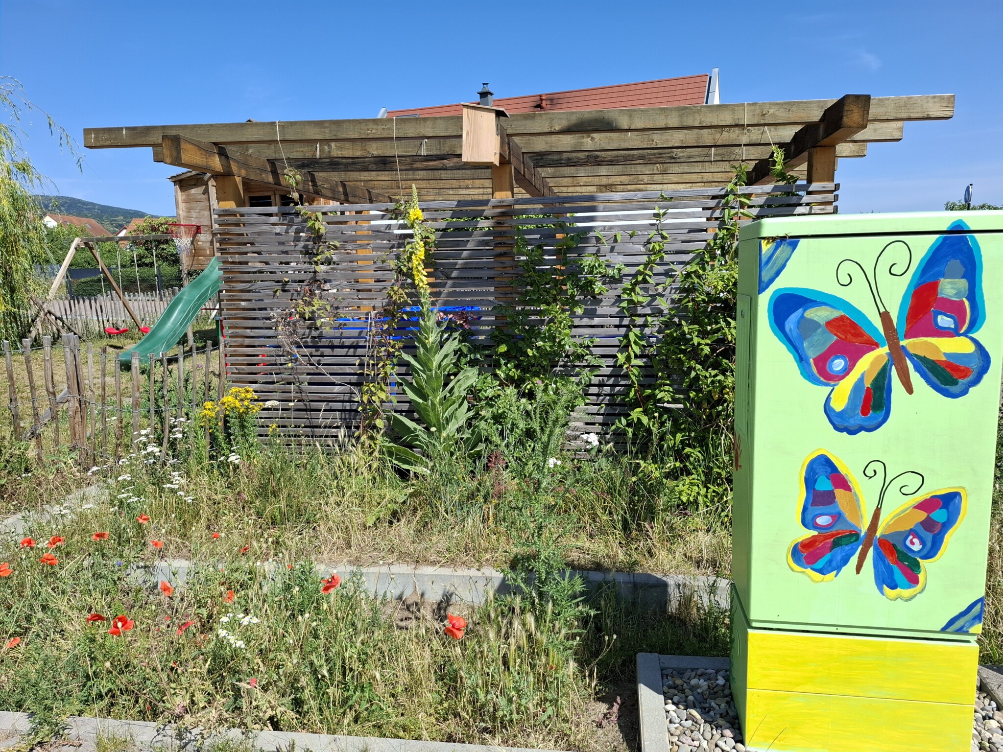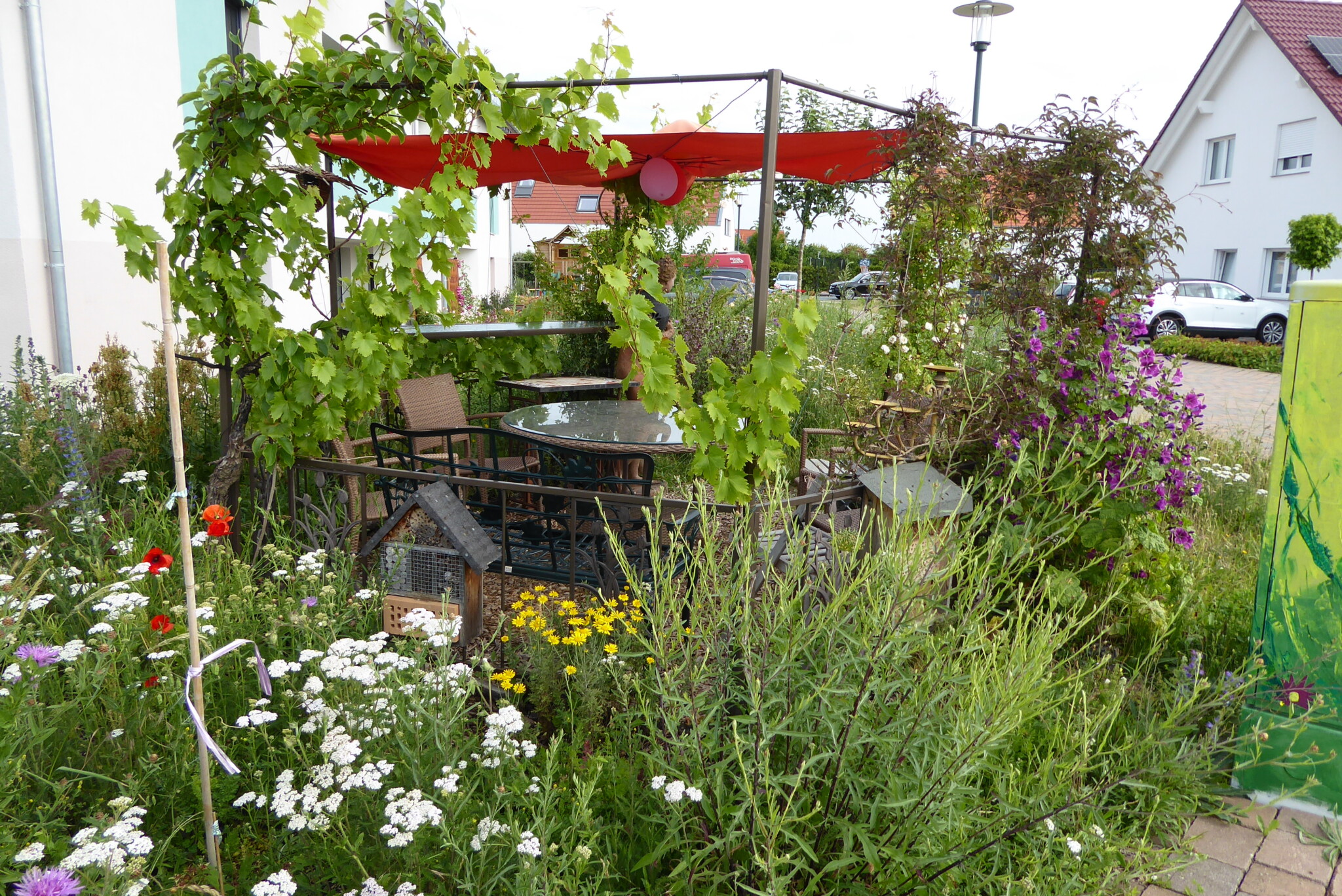 Weinreben und Clematis begrünen unseren Pavillon und sorgen so hoffentlich im nächsten Jahr für eine schattenspende Überdachung. Rundherum wachsen viele verschiedene Wildblumen.