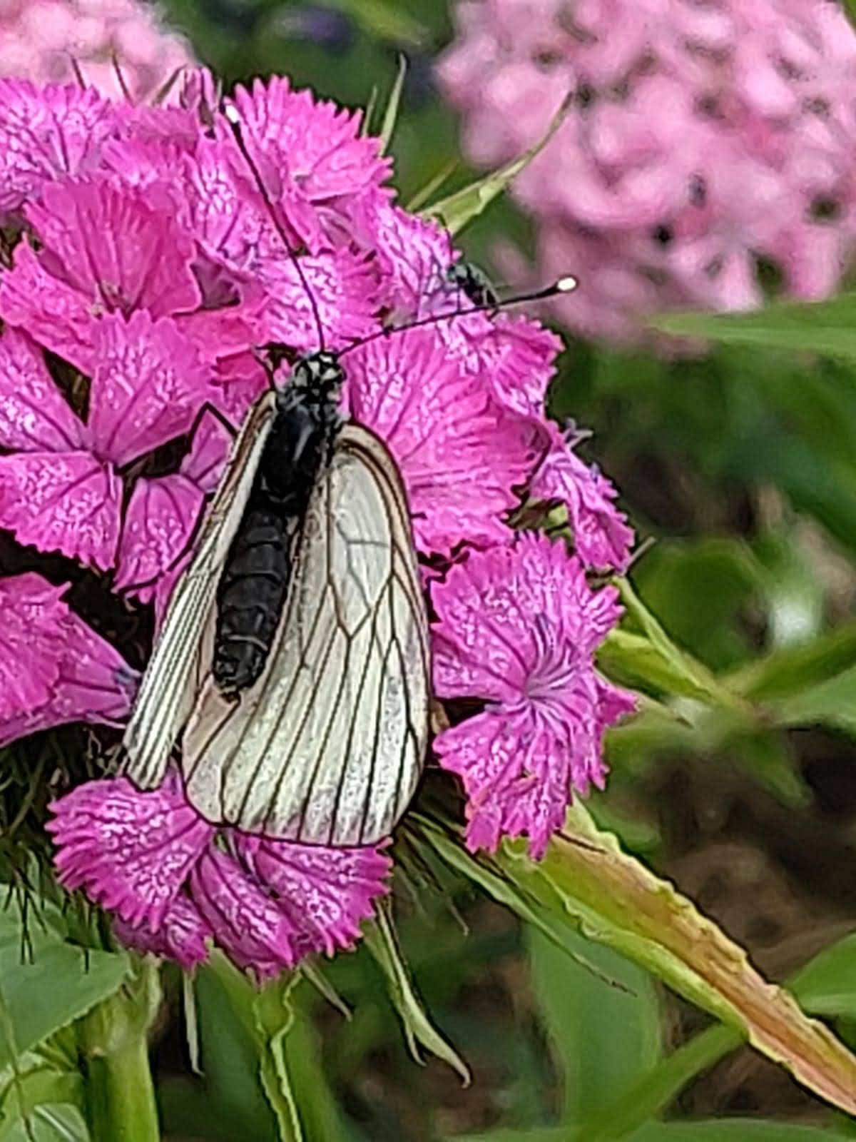 Der Baumweißling ist ein Schmetterling, der gerne an der Bartnelke Nektar saugt.