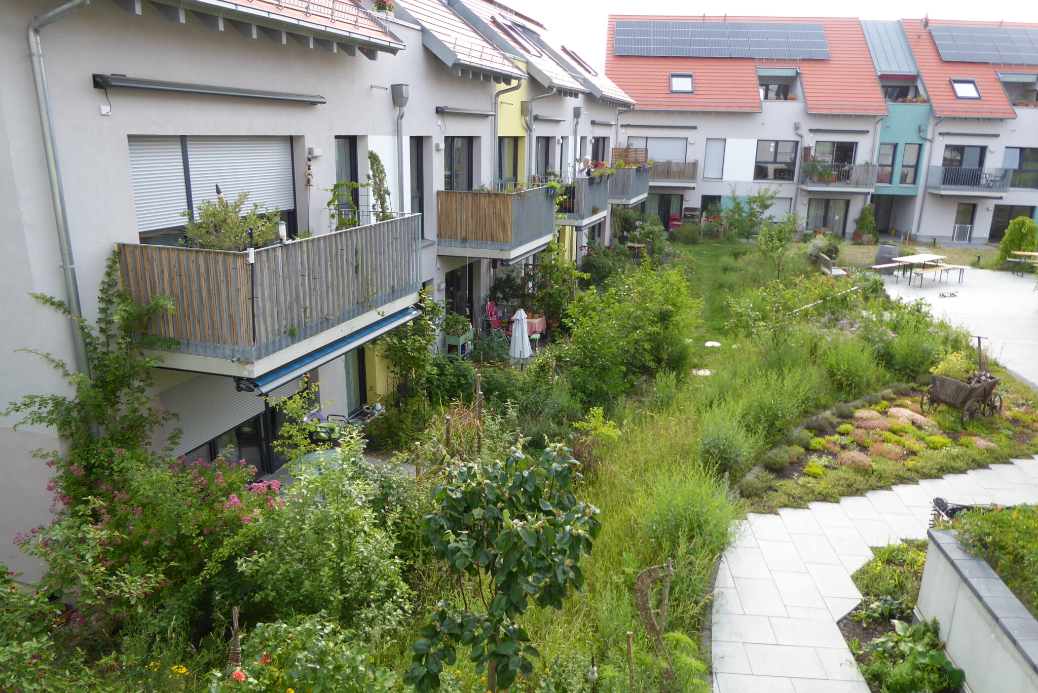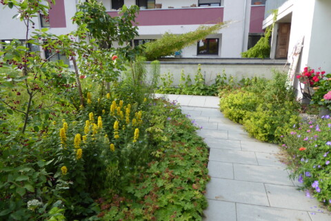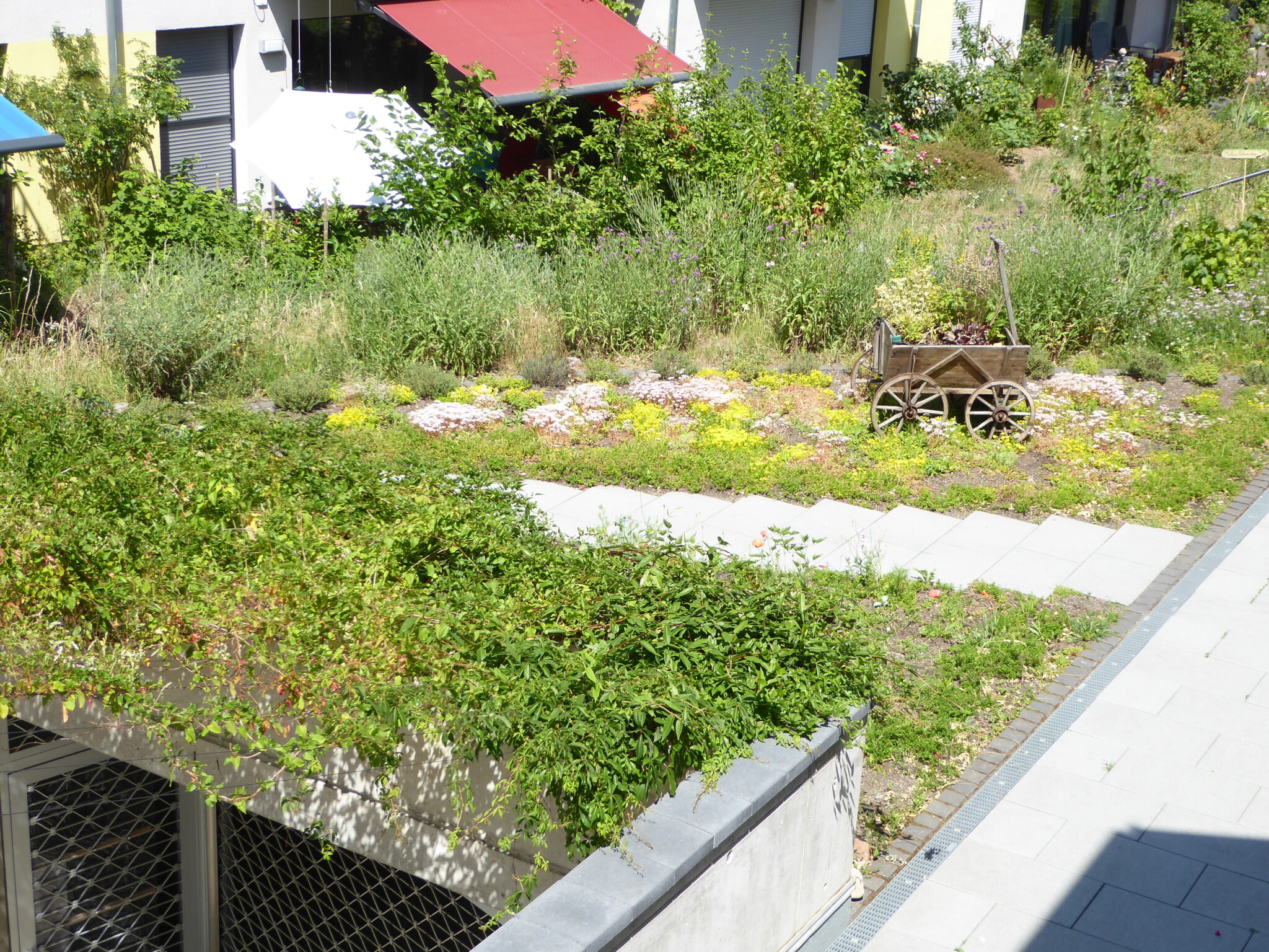 Die vertikale Begrünung über der Tiefgarageneinfahrt ist im Hintergrund zu sehen. In diesem Bereich stehen außerdem ein Quittenbaum, eine Kornelkirsche sowie rote und schwarze Johannisbeeren. Es wachsen Brandkraut, Storchschnabel und vieles mehr.