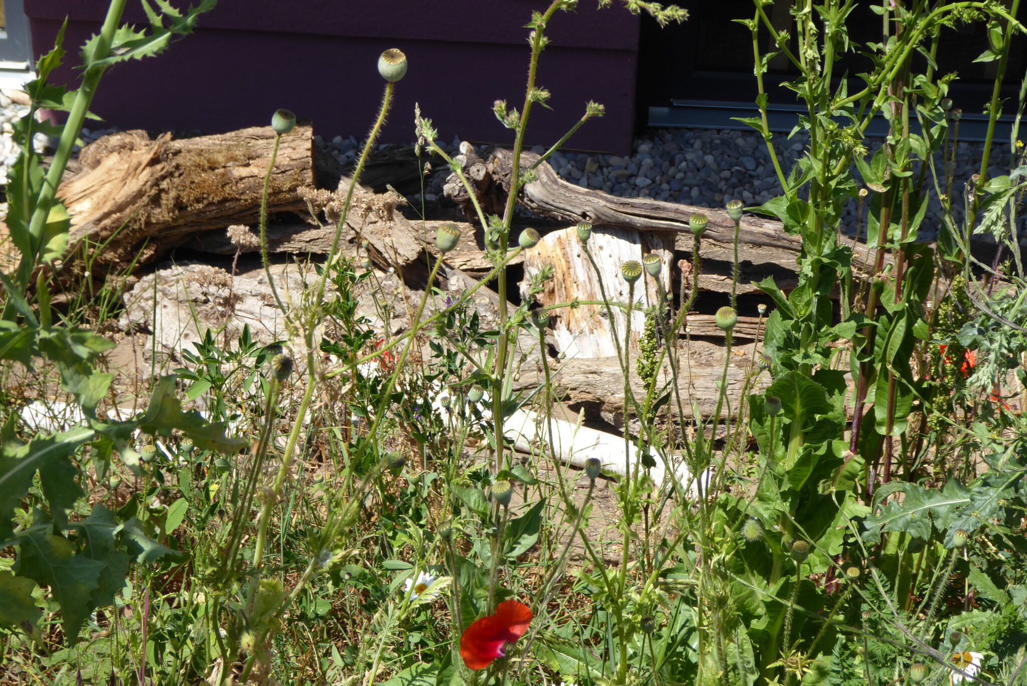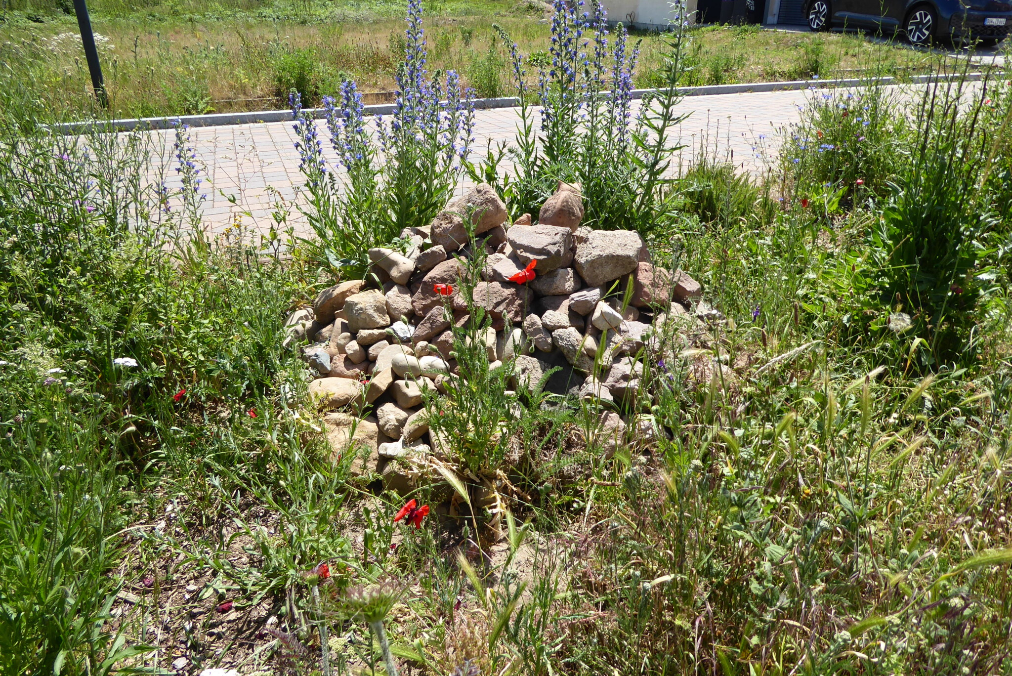 Um den vergrößerten Steinhaufen wächst der Natternkopf und wilde Blumen, die wir letztes Jahr gesät und gepflanzt haben.