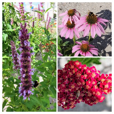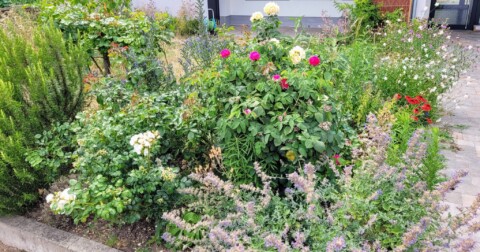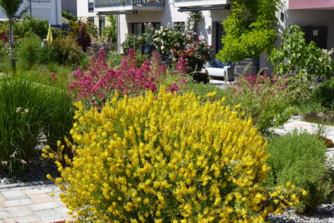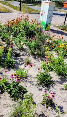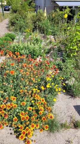 Diese Beete wurden im Herbst 2024 neu angelegt und zeigen nun reichlich Blüten. Unter anderem wachsen dort Storchschnabel, Frauenmantel, Gilbweiderich, Leinkraut, Blutweiderich und Weidenblättrige Sonnenblume.
