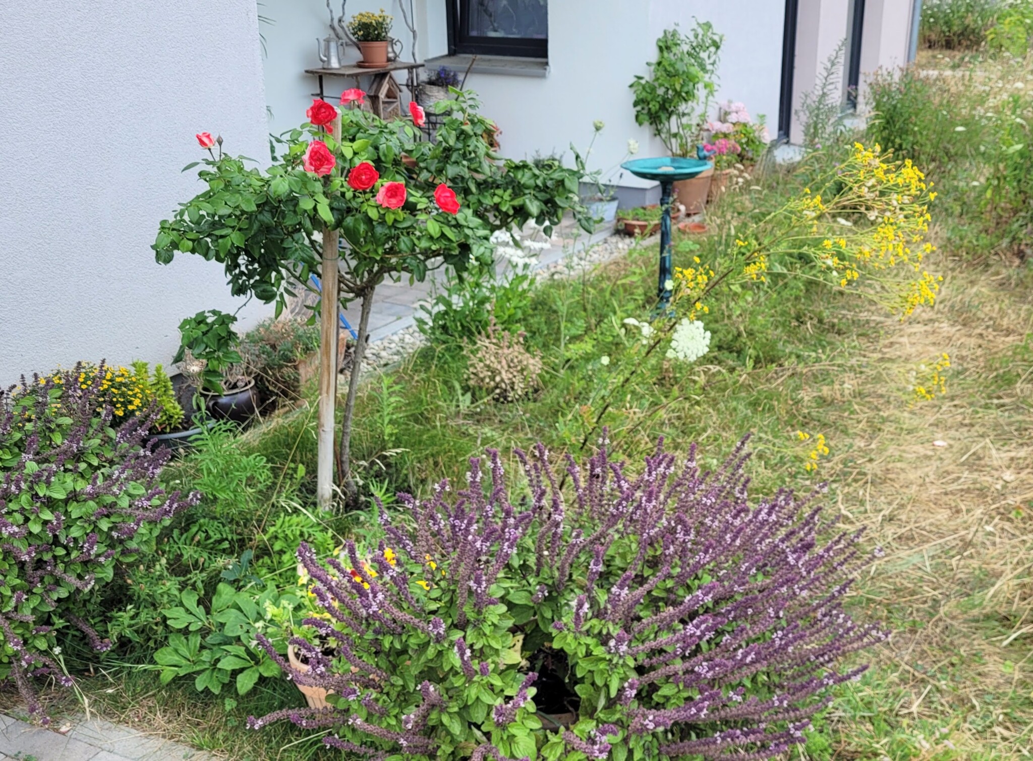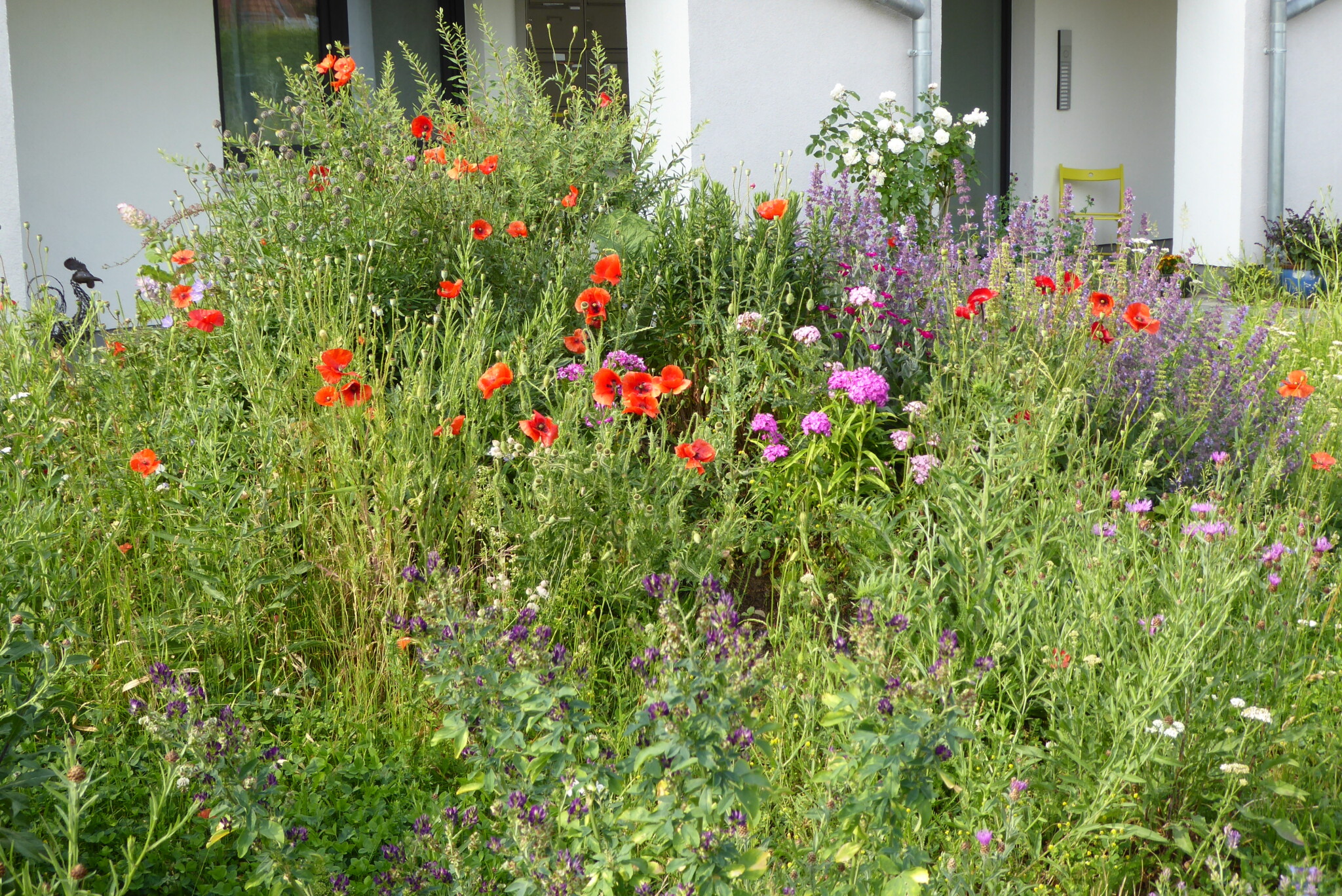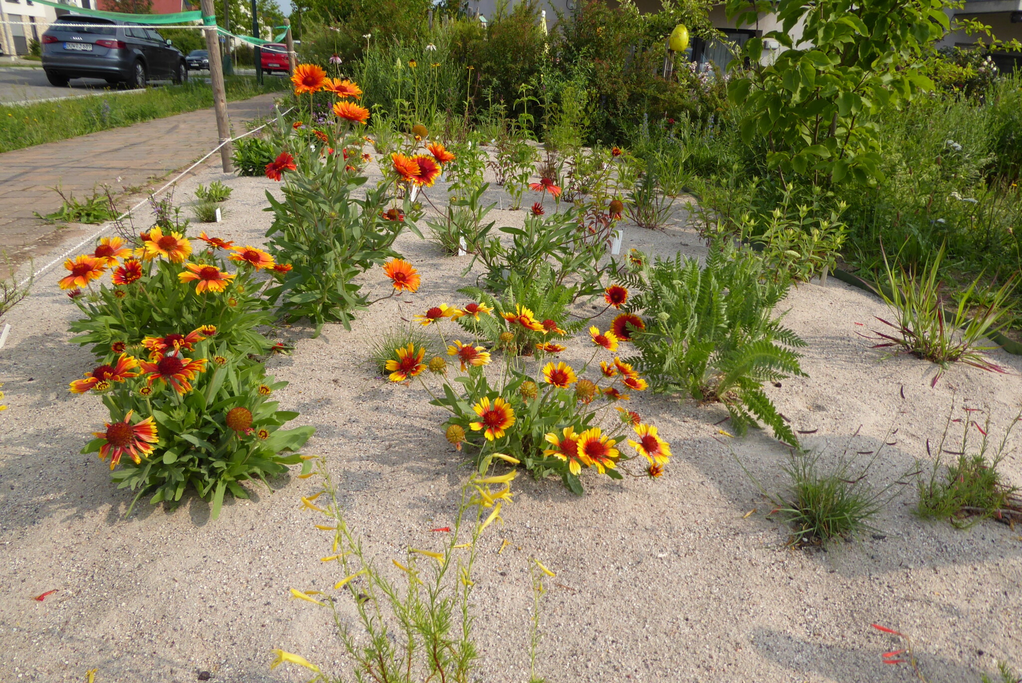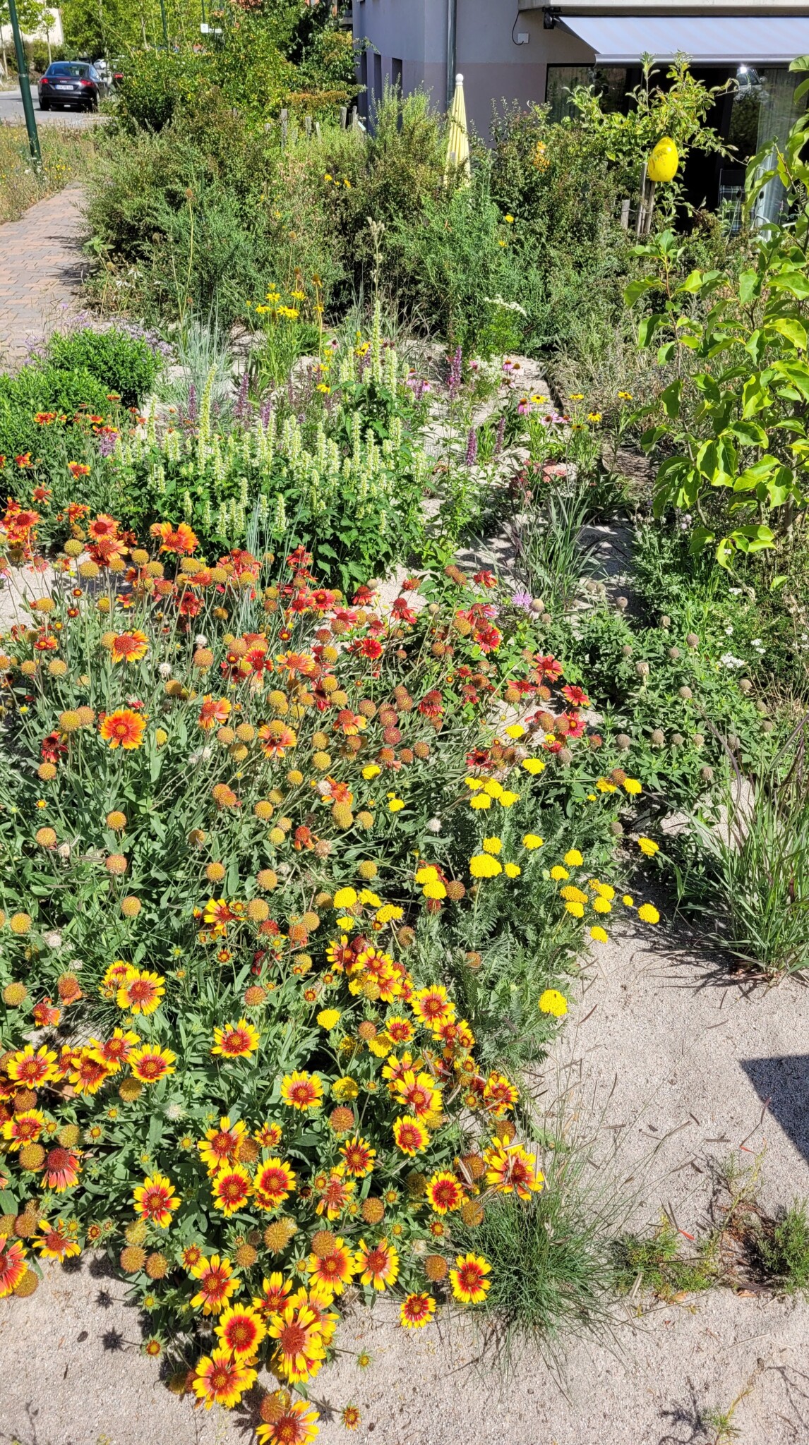 Ansicht Mitte Juli 2025. Die Kokardenblumen vorn haben sich als erste Pflanzen phänomenal ausgebreitet.