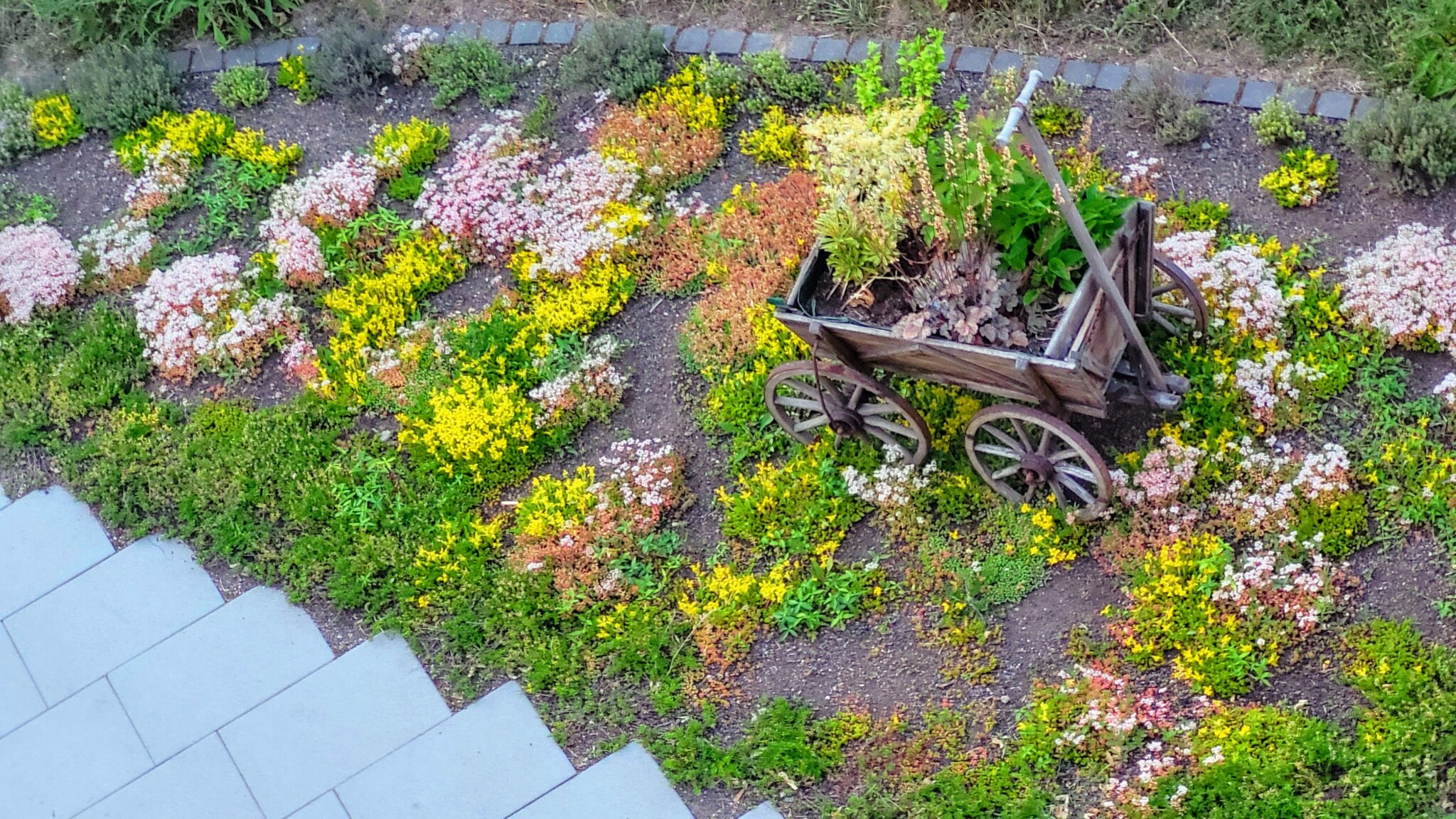 Nach der neuen Bepflanzung mit Mauerpfeffer, Kaskadenthymian, Zitronenthymian, Vinca Minor(kleinblütiges Immergrün) blüht es endlich im ehemaligen Sedumbeet.