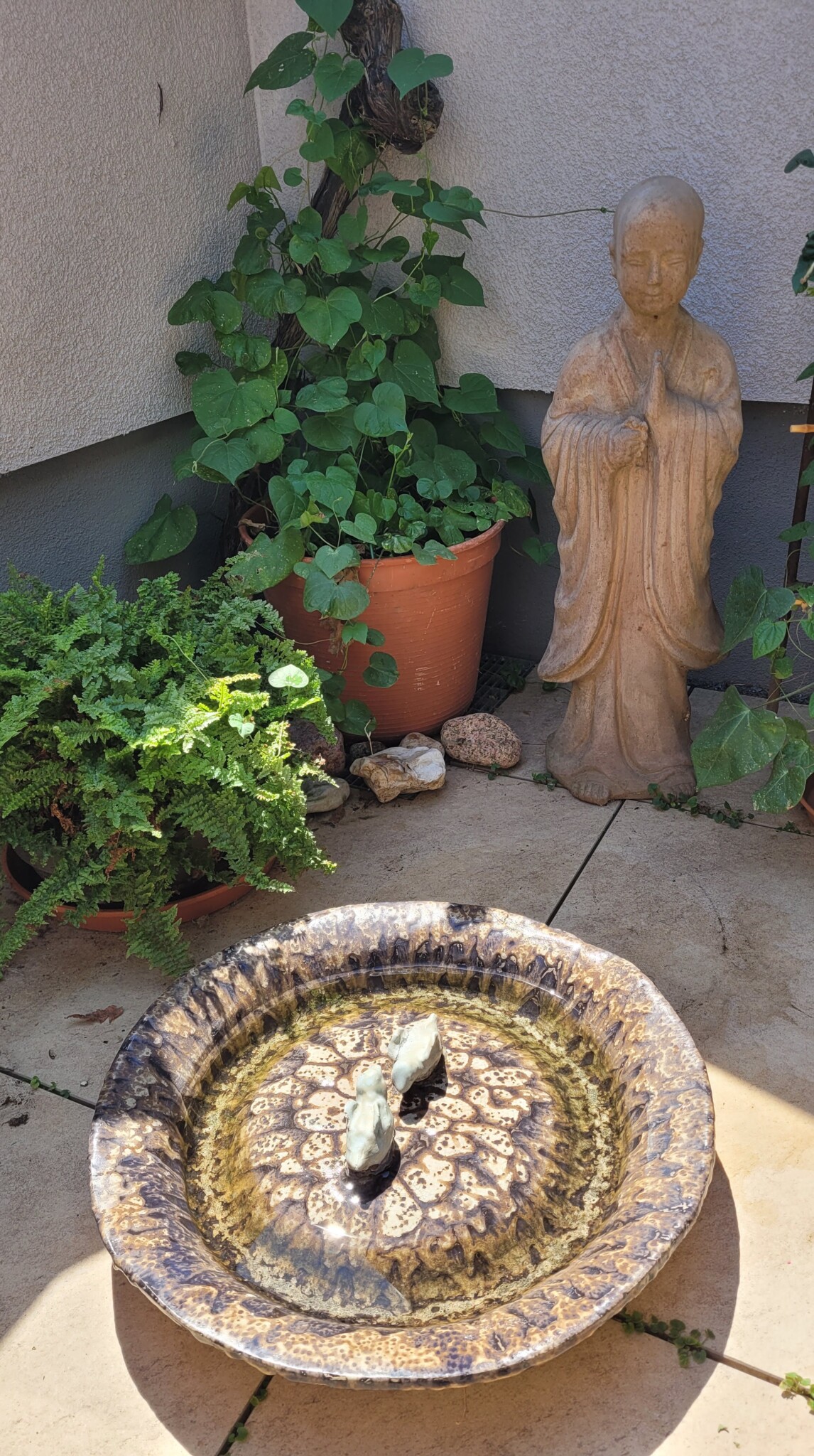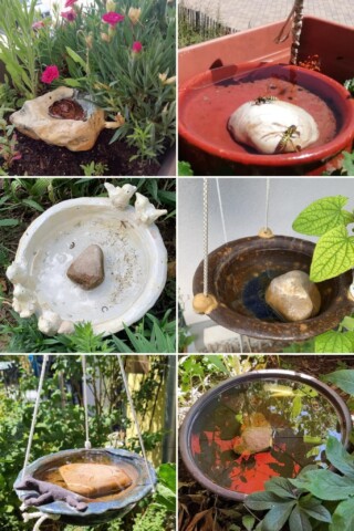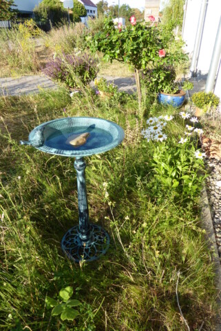 Da wir durch die baulichen Gegebenheiten keinen Miniteich im Erdreich anlegen können, haben viele Bewohner kleinere Wasserstellen auf den Balkonen und Terrassen aufgestellt oder aufgehängt.