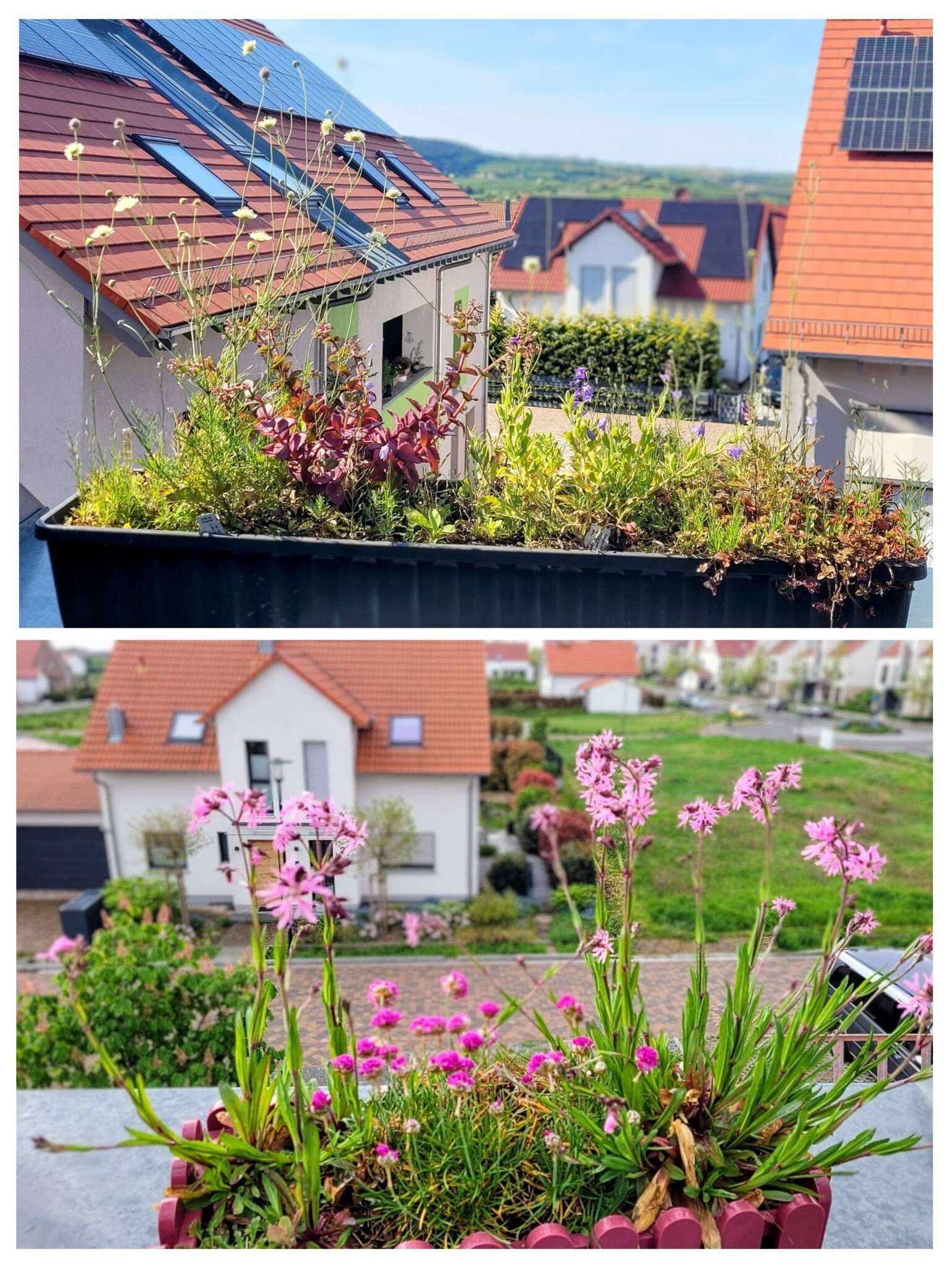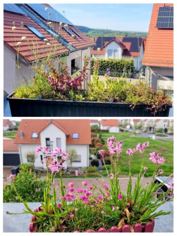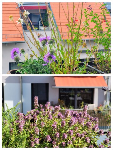 Auf den Balkonen, Laubengängen und Terrassen unserer 4 Häuser hängen und stehen überall Kästen und Töpfe mit meist einheimischen Wildpflanzen und Kräutern.