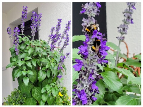 Ein großer Salbei im Topf hat Besuch von gleich 3 Hummeln.