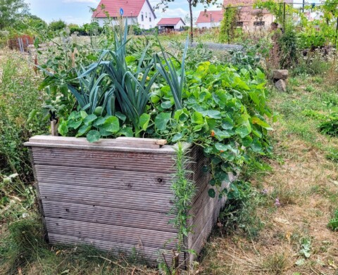 in diesem Jahr wachsen im Hochbeet Lauch, Tomaten, Bohnen, Rote Beete, Mangold und Kapuzinerkresse