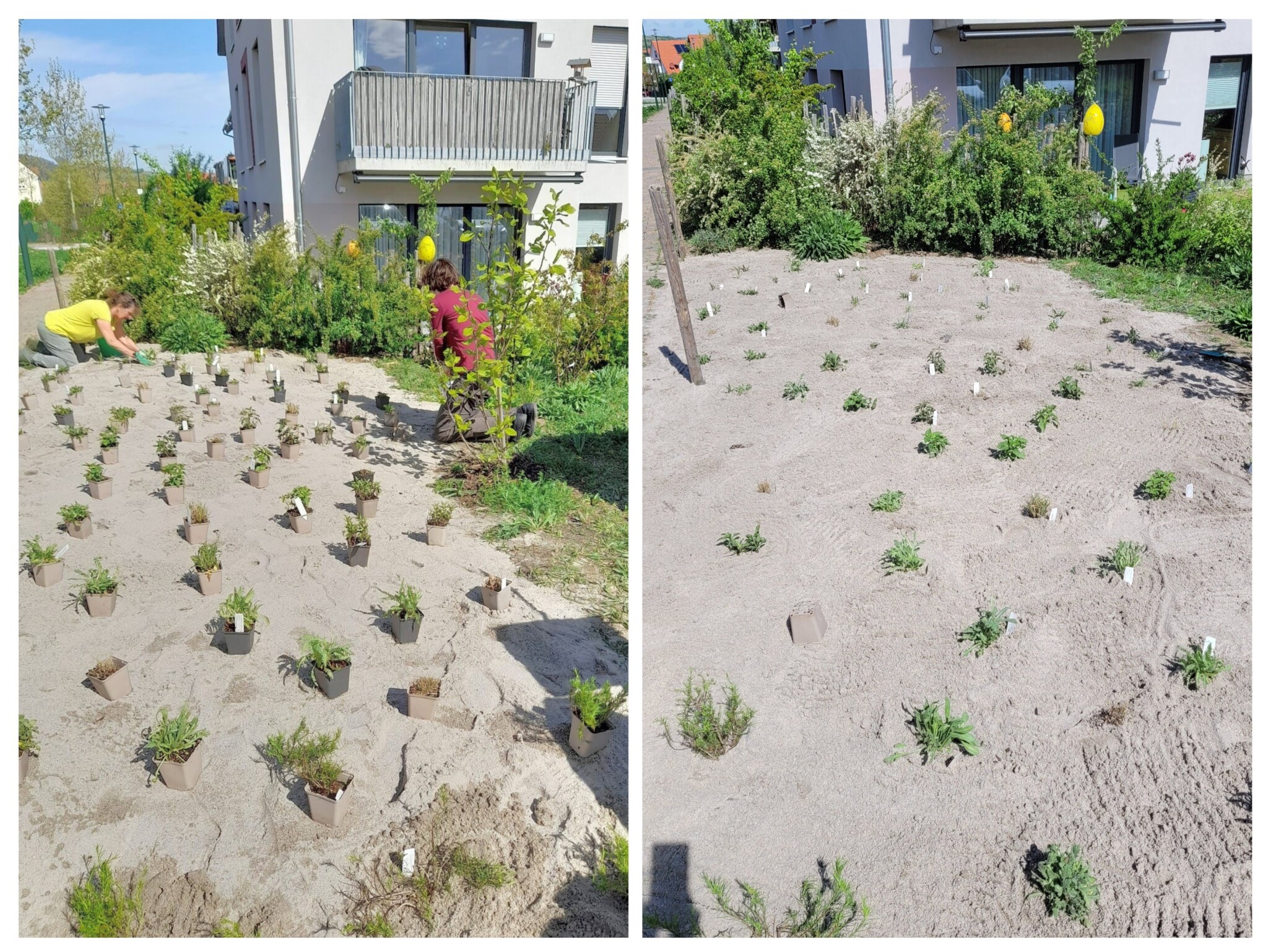 Im April konnten wir die bestellten Pflanzen endlich setzen und einpflanzen. Das ging im Sand erstaunlich schnell und einfach. Das alles hätten wir ohne die großartige Hilfe vieler Mitbewohner nicht geschafft. Jetzt muss die bunt-blühende Mischung von Pflanzen nur noch wachsen und gedeihen. Im Herbst wollen wir Blumenzwiebeln setzen, damit es im Beet schon im Frühling blüht. Dann können sich Bienen, Schmetterlinge und andere Insekten auf ein weiteres Nahrungsangebot freuen!