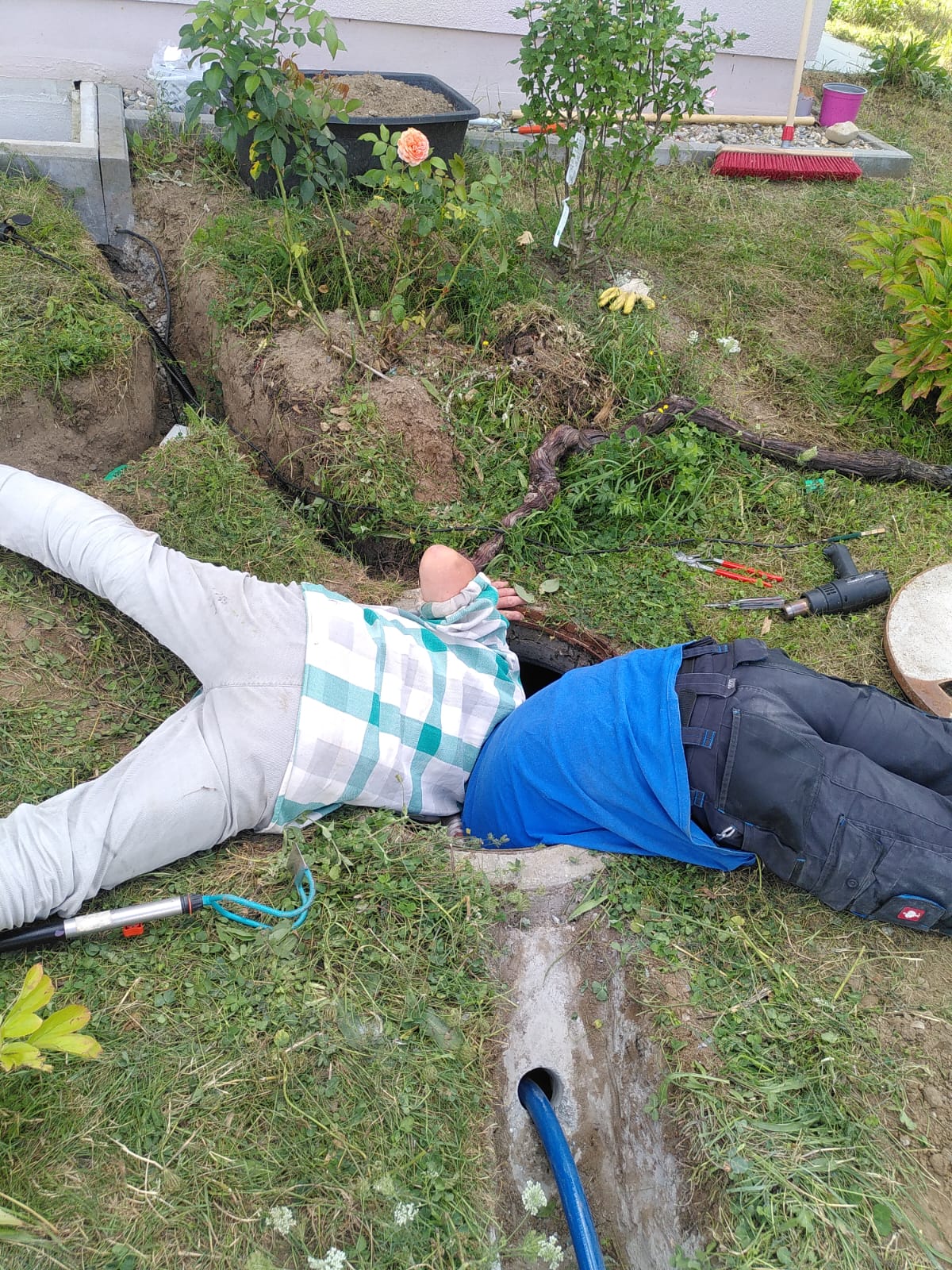 Zwei Mitbewohner säubern kopfüber den Filter der Zisterne. In den 12 Zisternen auf unserem Gelände mit einem Gesamtvolumen von 120.000 Liter sammeln wir Regenwasser, unter anderem für die Pflanzenbewässerung. Das ist umweltfreundlich und spart Kosten.