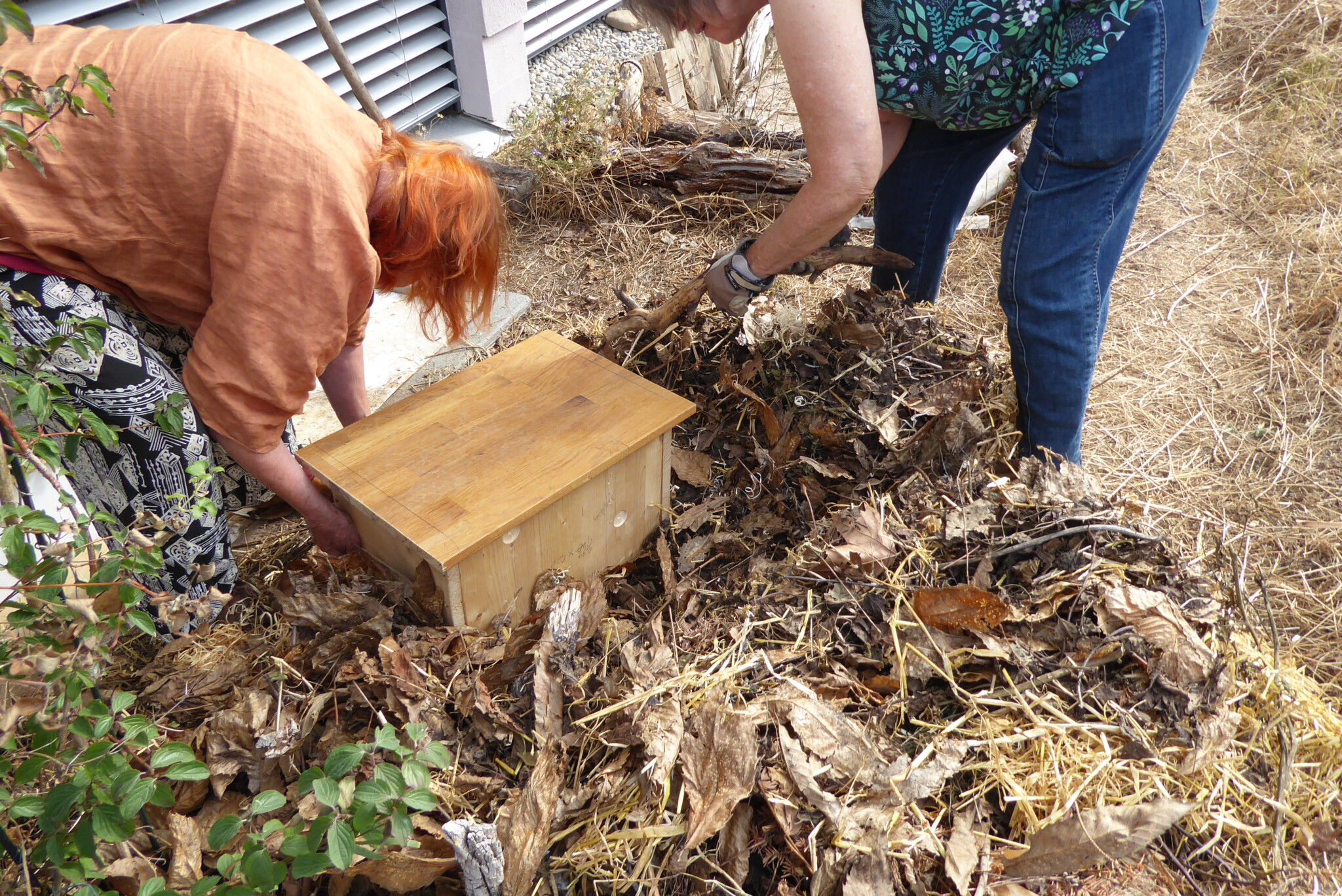 Im Herbst wird das Igelhaus nochmal mit viel Laub dick zugedeckt. Es dient als Isolierung und schützt vor Kälte und Feuchtigkeit. Dann ist das Winterquartier für den Igel fertig.