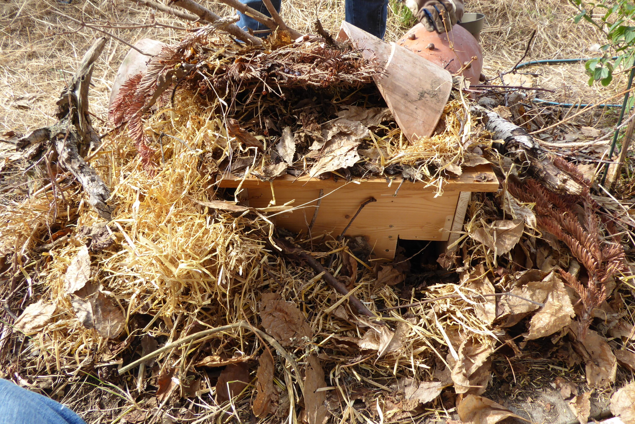 Vorbereitung des Standortes mit Laub, Ästen, getrocknetes Gras und Totholz.
