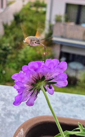 Ein seltener Anblick! Ein Taubenschwänzchen besucht eine Skabiose.