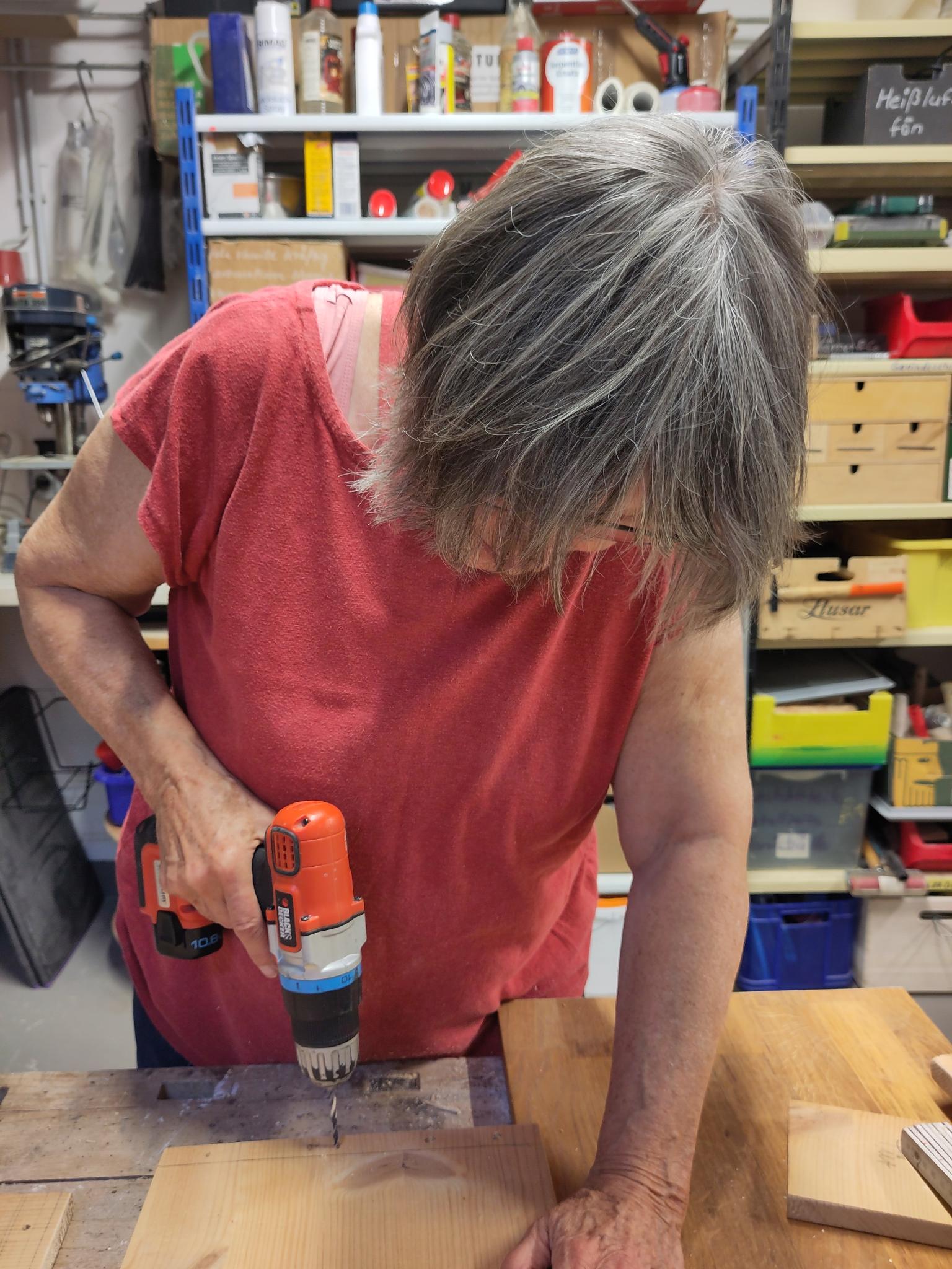 Wir hatten die Idee, nach Anleitung des NABU einen geschützten Unterschlupf für Igel zu bauen. Dafür haben wir gebrauchte Holzbretter neu genutzt. Hier wird genagelt und geschraubt.
