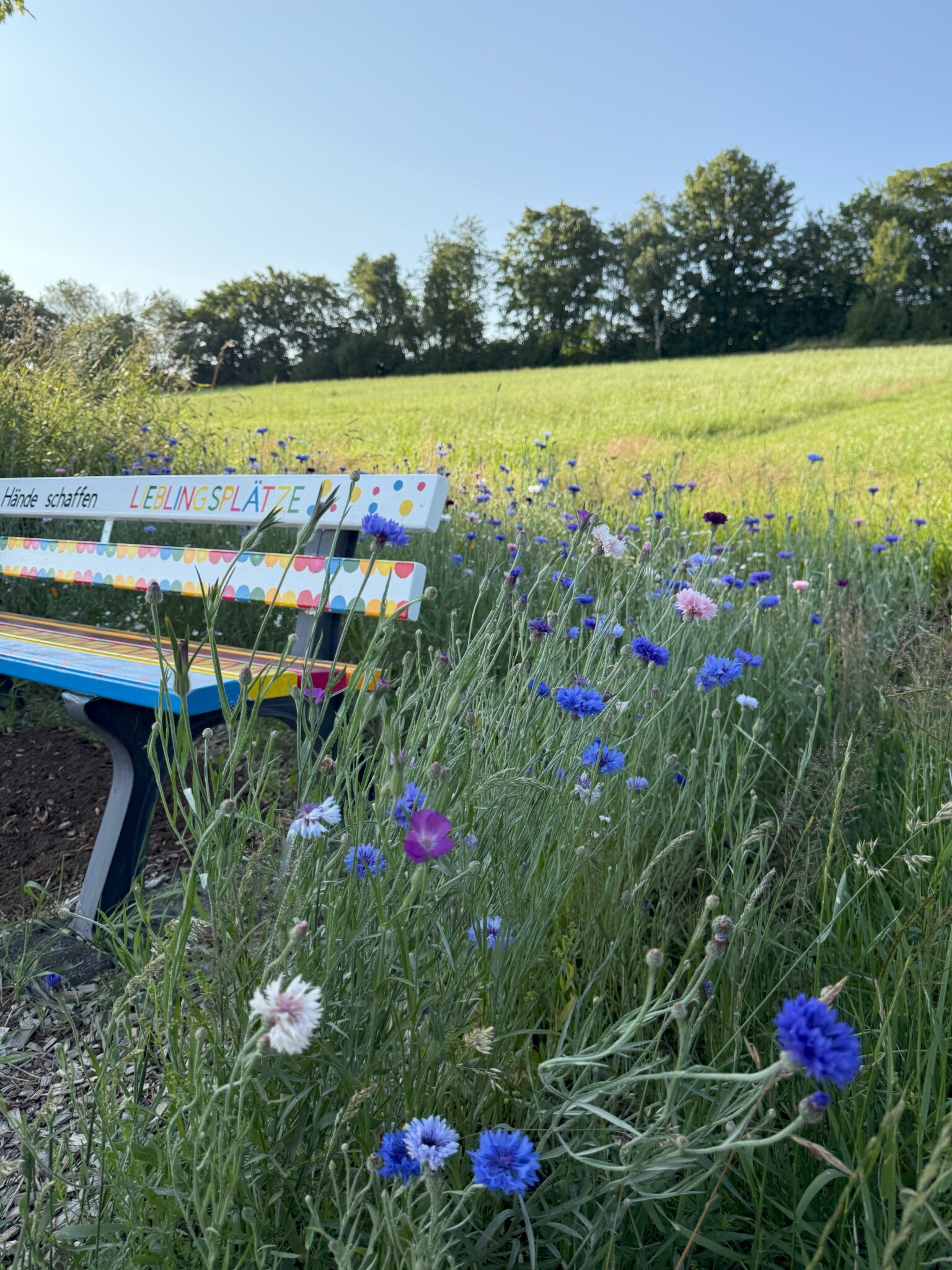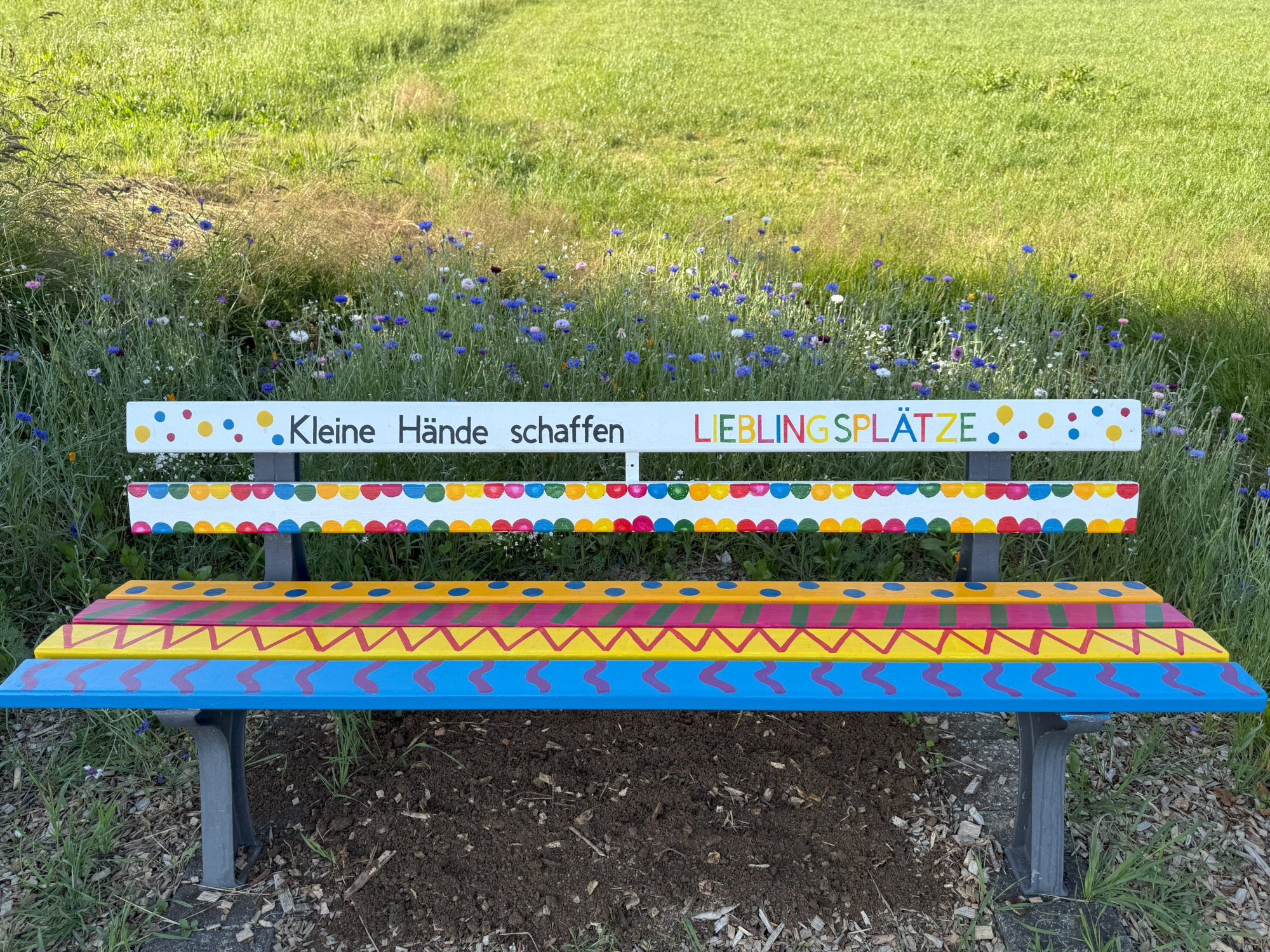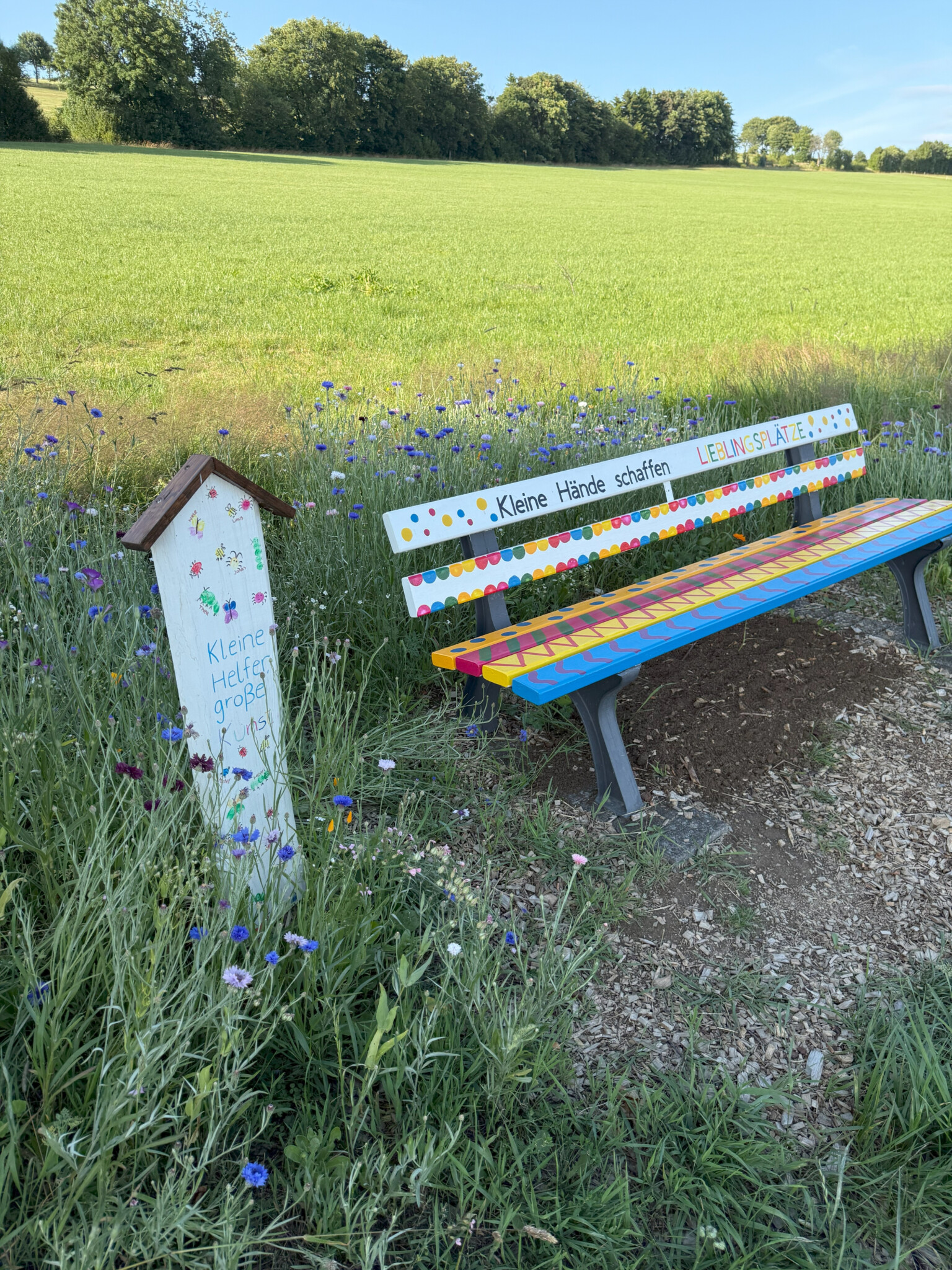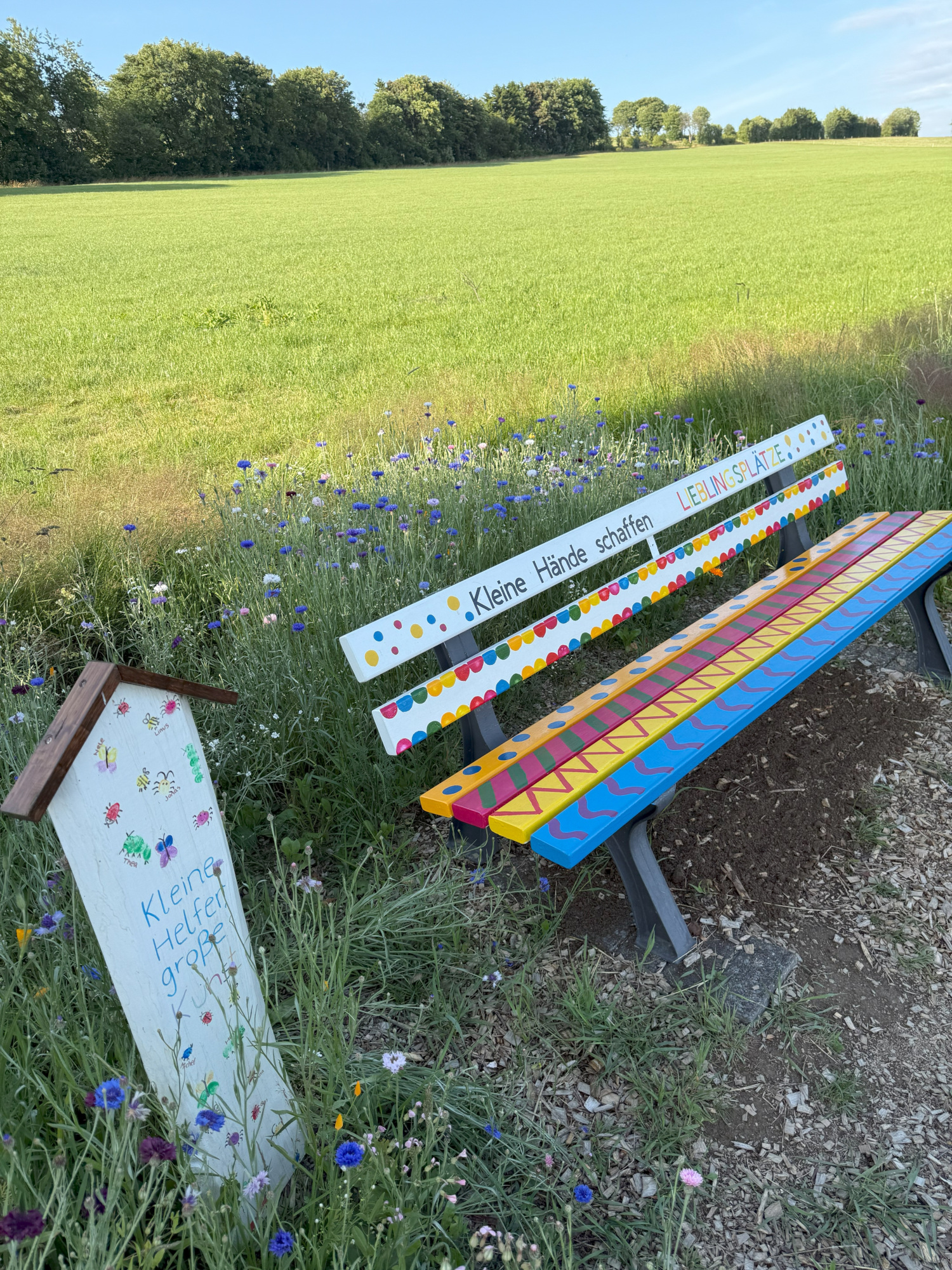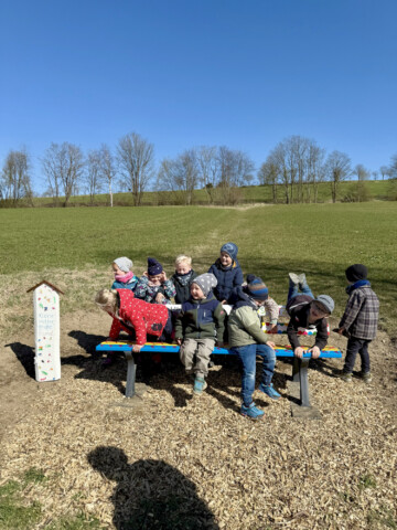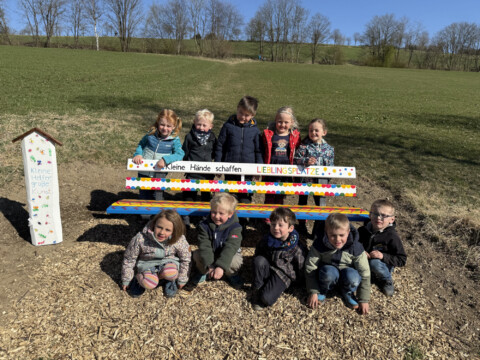 Zu aller erst haben die Kinder ihren Heimatort auf kreative Weise entdeckt und gemeinsam eine Holzbank bemalt. Diese wurde zum Mittelpunkt der neuen grünen Umgebung, um der eine Blumenwiese gepflanzt wurde, ganz nach dem Motto: „Ein Platz für Mensch und Tier.“ Die Kinder stellten fest, dass es auf dem Weg für Spaziergänge wenig Rastplätze für die Menschen sind. Ein weiteres Kind sagte, aber die Bienen und Schmetterlinge haben auch keinen Platz um eine Pause zu machen. Mit diesen zwei Gedanken entschieden wir uns dafür einen Ort für beide zu gestalten, an dem die Menschen und Tiere gleichzeitig zur Ruhe kommen können. Wir suchten uns einen geeigneten Ort, klärten die Nutzung und starteten voller Begeisterung sofort mit der Umsetzung. Jedes Kind bekam eine Harke und Blumensamen in die Hand, nach und nach haben alle Samen ihren Platz in der Erde gefunden. Dieser grüne Ort findet seinen festen Platz in dem “Stationsweg“ in Grönebach, der wohl beliebteste Weg für Spaziergänge. Die Kinder pflanzten eine bunte Blumenvielfalt um die Bank herum und pflegen diese regelmäßig mit mir. Egal ob Unkraut in der Erde zwischen den Blumen oder das Gießen, an trockenen Tagen. Es sind schon so viele Tiere dort auf den Blumen gelandet, besonders viele Hummeln und Bienen fliegen herum und genießen die bunten vielfältigen Blumen. Die Kinderaugen strahlten als sie die Pflanzen und Wachsfortschritte der Blumenwiese sahen. Neben der Bank, zwischen den bunten Blumen für Insekten, stellten wir ein Schild auf, auf denen die Kinder sich in Form eines Fingerabdrucks als Tier verewigt haben. Die bunt bemalte Bank und die bunten Blumen drum herum schaffen einen Lieblingsplatz für viele Dorfbewohner als auch Wandergäste. Das bereits angekommen Lob bei den Kindern und mir sorgt für Ehrgeiz und Neugierde sich um den Platz zu kümmern. Ein gelungenes Beispiel dafür, was entsteht, wenn die Kinder aktiv in gestaltende Angebote einbezogen werden und so umwelt- und tierbewusster durch die Natur gehen.