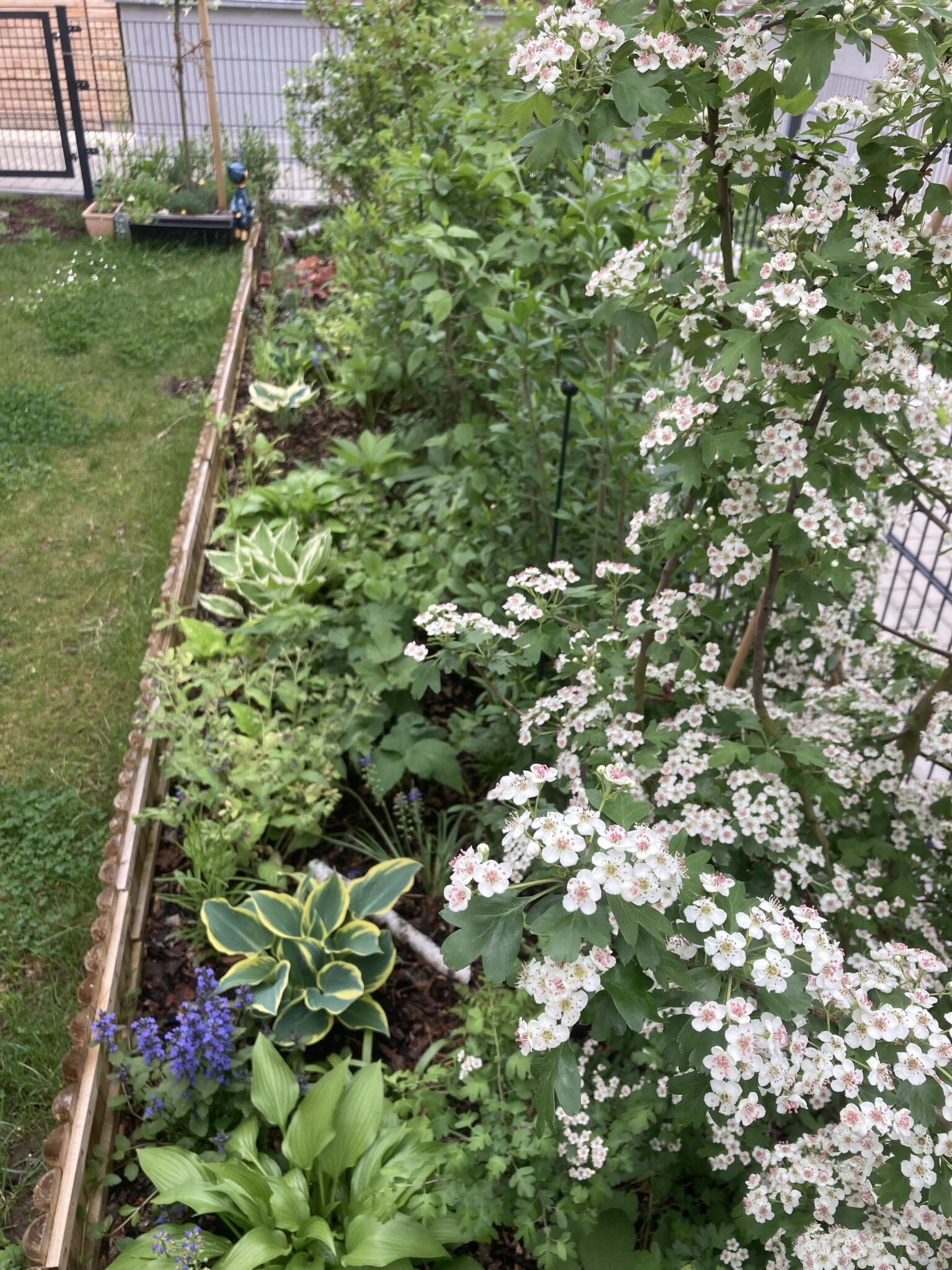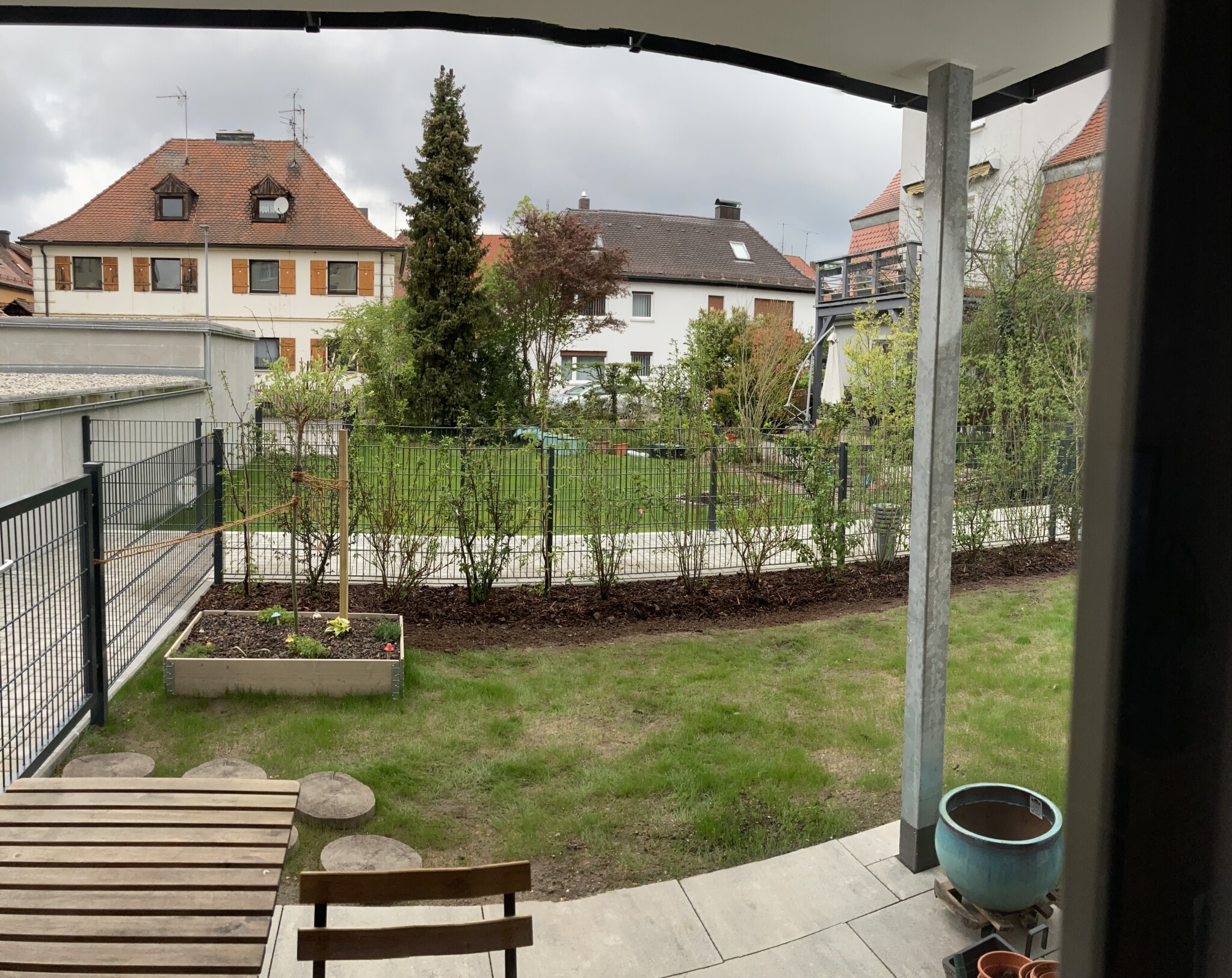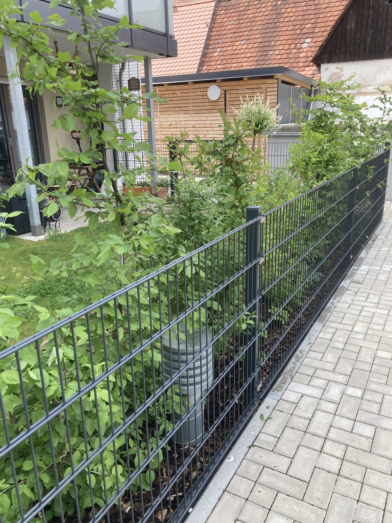 Unser kleiner Garten liegt 80% auf der Tiefgarage mit ca. 20cm(teilweise 15cm) Substratschicht. Die Wohnung ist ein Neubau, wir sind mit meinem Mann im März 2024 eingezogen, 2,5 halb Wochen vor dem Geburt unseres Sohnes. In der 37. SS-Woche habe ich noch den ersten Baum, eine Harlekinweide gepflanzt in einem Beet mit zusätzlich 18cm Substraterhöhung 😊 Am Rand des Gartenteils A gibt es einen ca. 0,5-1m breiten Saum, wo es freie Erde gibt(weiter eingeengt durch Betonteile zur Fixierung des Laufweges). Hier wurde im Mai 2024 eine Hecke durch die Gartenfirma gepflanzt die bei der Konstruktion des Gebäudes ebenfalls beteiligt war.