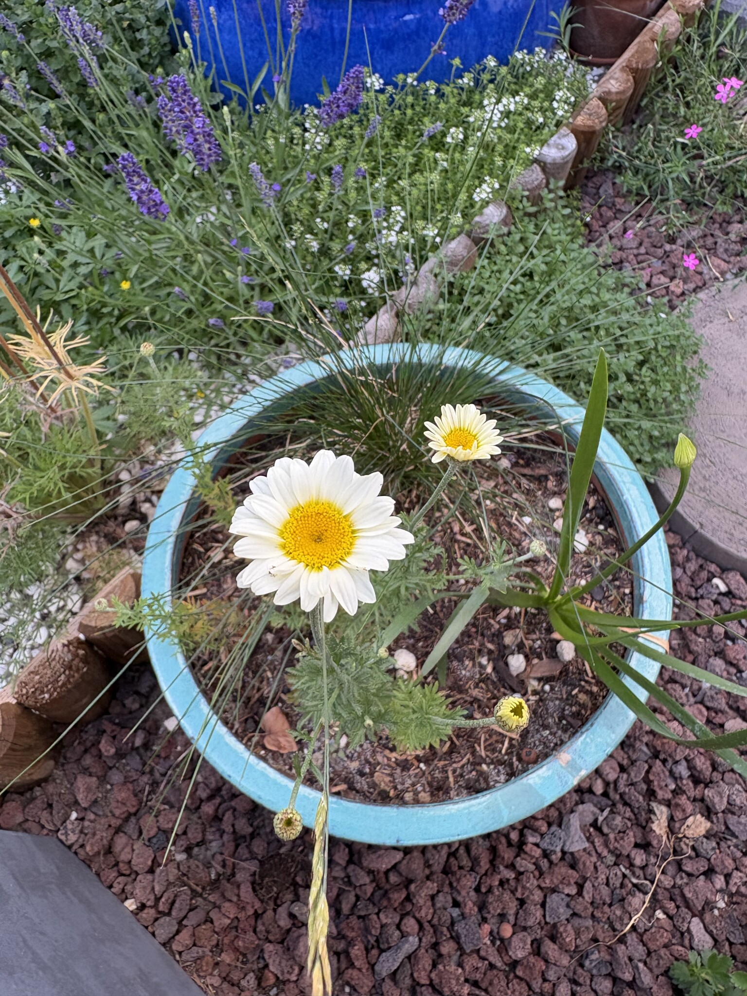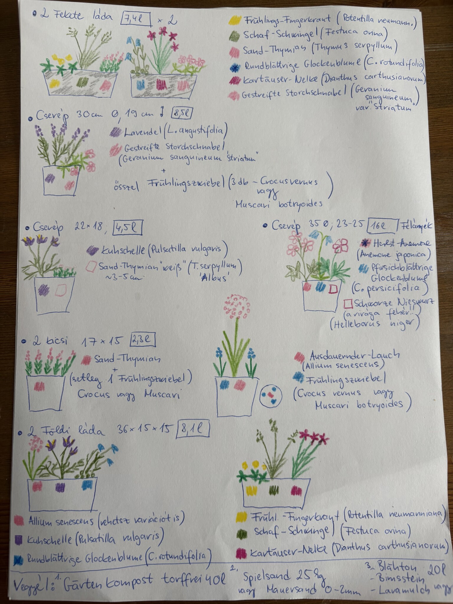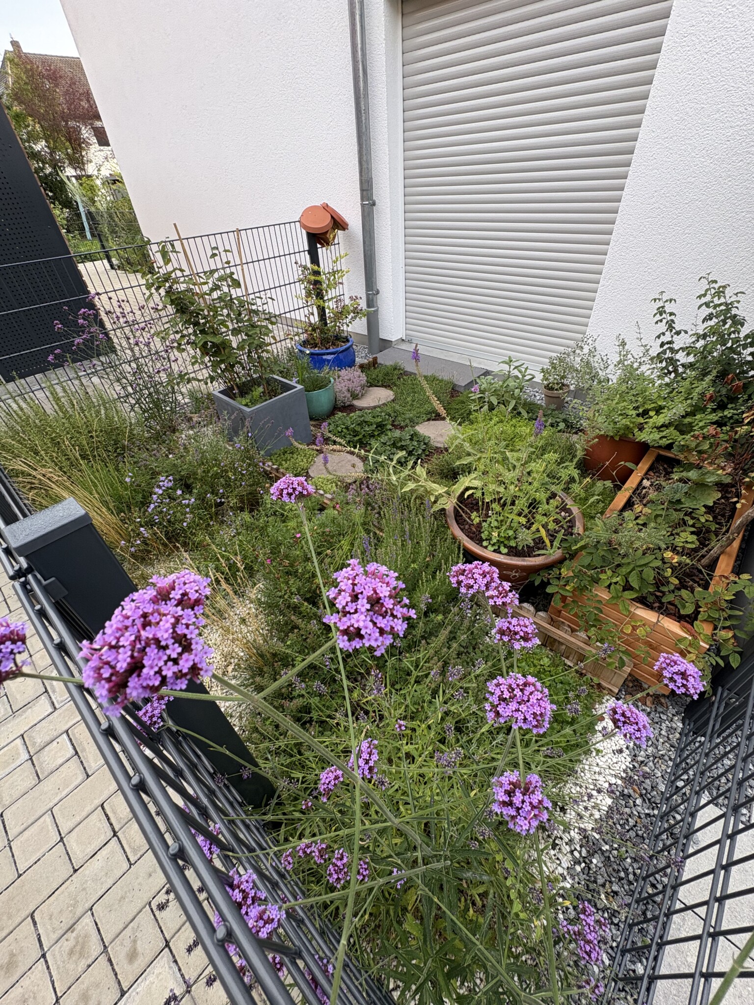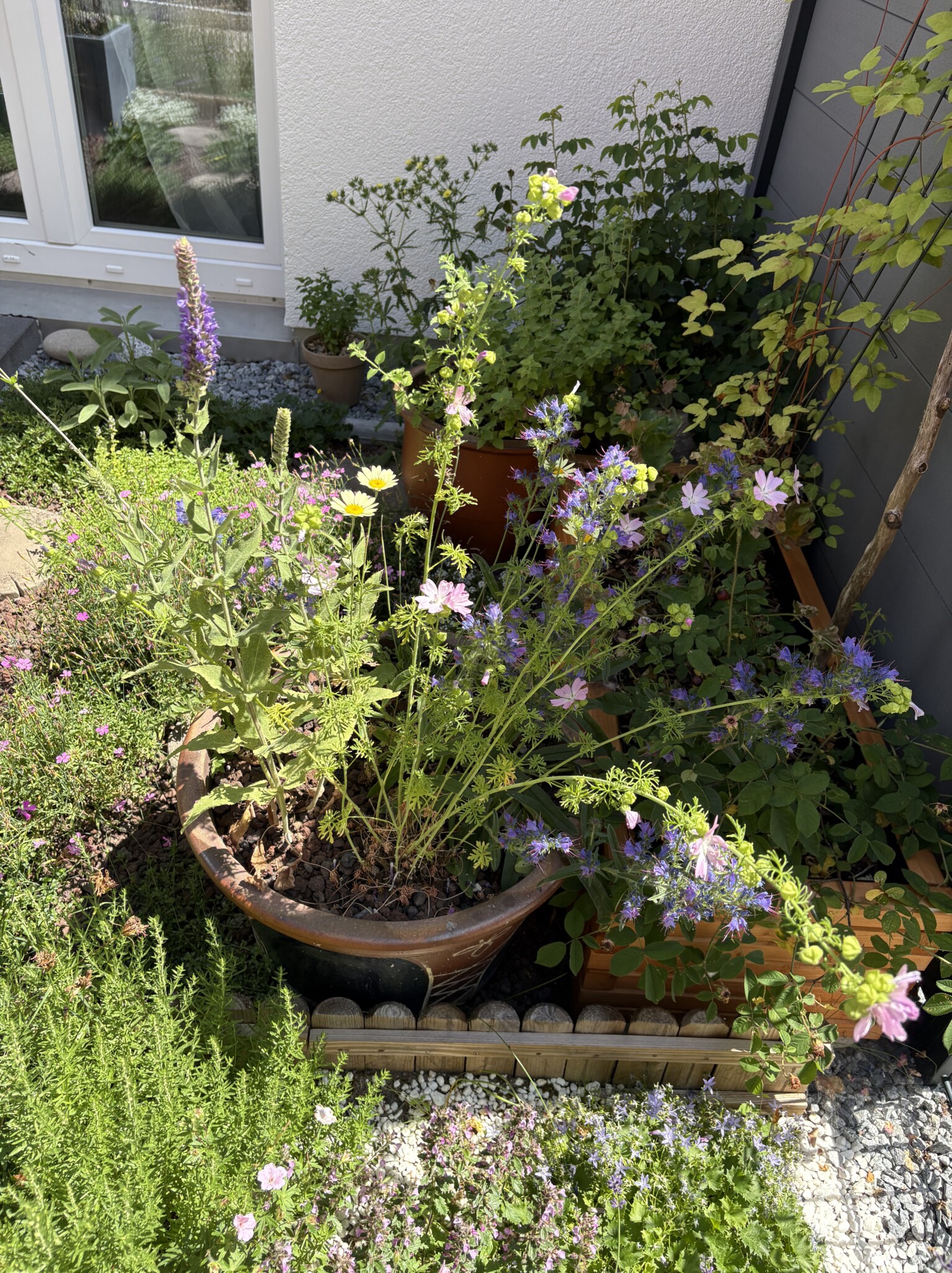 Die meiste Arbeit habe ich selbst gemacht, während ich zu Hause mit unserem Sohn war. Mein Mann hat auch beim Tragen geholfen obwohl ich mich erinnere, dass ich 125kg Kieselsteine selbst mobilisiert habe 6. Wochen nach dem Geburt unseres Sohnes 🙂 Die Stauden und weitere Gehölze sind im Herbst 2024 und im Frühjahr 2025 eingepflanzt worden – allmählich weil ich seit Oktober 80% arbeite. Ich konnte immer nur einen kleinen Teil machen, daher kommen manche Pflanzen nicht unbedingt von Bio-Gärtnereien, weil erstens gerade nicht verfügbar war was ich wollte zweitens hätte ich für 30-60euro bestellen sollen was ich nicht immer machen konnte bei kleinen Beete/Kübeln. Baumschule Horstmann hat inzwischen ein echt großes Sortiment von heimischer Stauden aber leider nicht Bio. Ich habe einige Stauden von der Lokalgärtnerei Braunlein geholt, ein Viertel des Sortiments sind heimische Wildstauden oder Sorten, ebenfalls nicht Bio. Meine zukünftige Gärtnerei wird aber die Bio-Gärtnerei Oberrieden, die ich leider nur im März 2025 entdeckt habe. Die verwendete Gartenerde ist torffrei.