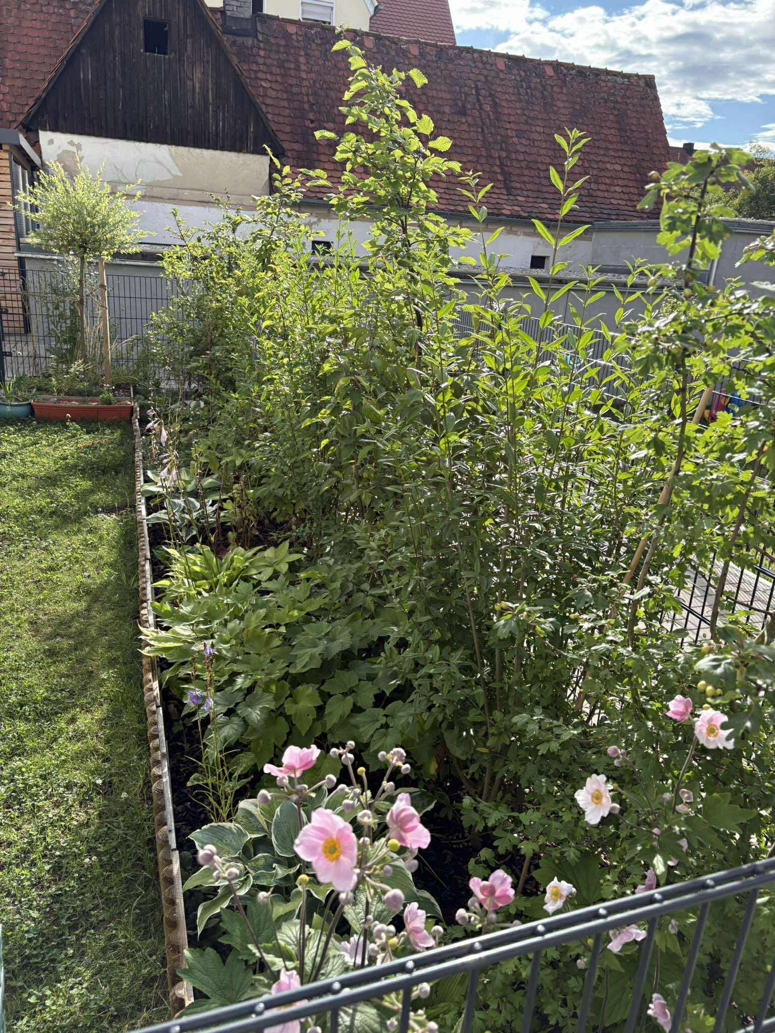 Einige Pflanzen stammen aus Ungarn, aus dem Garten meiner Eltern, dadurch habe ich ein Stück Heimat mitgepflanzt:) Initial habe ich noch nicht so viel Gedanken über Neophyten gemacht, ich wollte die gemischte Vogelschutzhecke(Forsythie, Bodnant-Winterschneeball…) nicht mehr ersetzen weil sie ein paar Monaten davor gesetzt wurden und wäre schwierig gewesen mit dem Tiefgaragensituation. Ich habe ohnehin keine Kapazität in den ersten Monaten neben meinem Sohn ohne Großeltern in der Nähe gehabt. Die Hortensien stammen auch aus Ungarn-die Chrysanthemen fand ich als “Lidl-Sortiment“ ausgeworfen auf der Straße. Diese habe ich vor in den folgenden Jahren langsam zu ersetzen. Ich habe vom Wettbewerb erst im März 2025 gehört, es spricht ein bisschen gegen meine Natur alles wegwerfen was gerade eben nicht heimisch ist. Manche kränkeln sowieso und ich bin eher faul was gärtnern angeht-außerhalb Kompost und Hornmehl müssen die Pflanzen ohne Hilfe zu Recht kommen und die Neophyten tun es schwer ohne viele Düngung😅