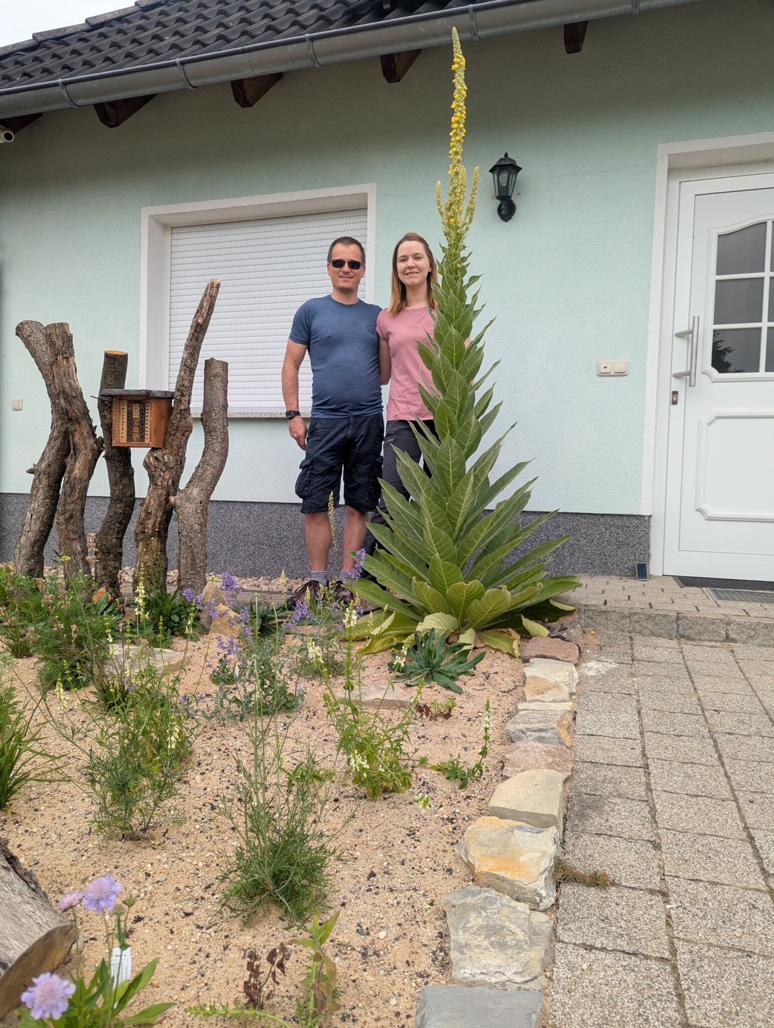 Wir haben sie liebevoll „Köni“ getauft und während der gesamten Bauarbeiten umsichtig geschützt. Jetzt, ein Jahr später, ist sie tatsächlich zur Königin des Beets geworden: beeindruckend hoch, wunderschön blühend und ein echter Blickfang am Eingang. ❤️🌼 Solche Momente zeigen uns immer wieder, wie wichtig es ist, der Natur nicht nur Platz zu geben, sondern ihr auch mit Respekt zu begegnen. Und das Mandelbäumchen haben wir übrigens erfolgreich umgepflanzt – es lebt nun im hinteren Garten weiter.