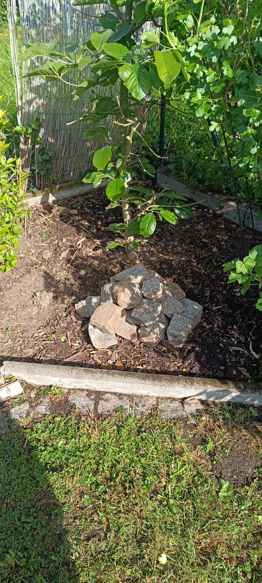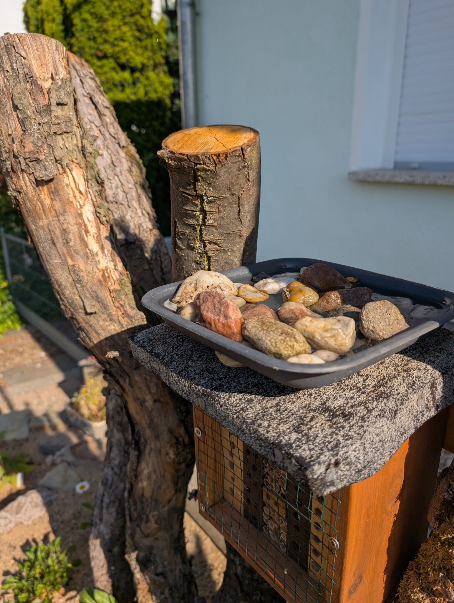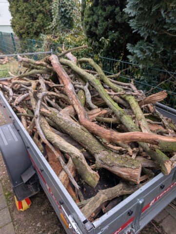 Uns war es wichtig, nicht einfach alles neu zu kaufen, sondern mit vorhandenen und geretteten Materialien zu arbeiten. Die Steine für die Mauer stammen aus der Region – zum Teil vom Acker eines befreundeten Landwirts, zum Teil über Kleinanzeigen von einem alten Mauerrückbau. Als wir die schönen Sandsteine sahen, war klar: Die bekommen ein neues Zuhause bei uns. Auch das Totholz wurde gerettet – aus dem nahegelegenen Park, bevor es im Holzhäcksler gelandet wäre. Mit Erlaubnis durften wir es mitnehmen. Mein Mann nennt diese Aktion übrigens liebevoll „Lebensraumretter“ – und das trifft es ziemlich gut. 🙂