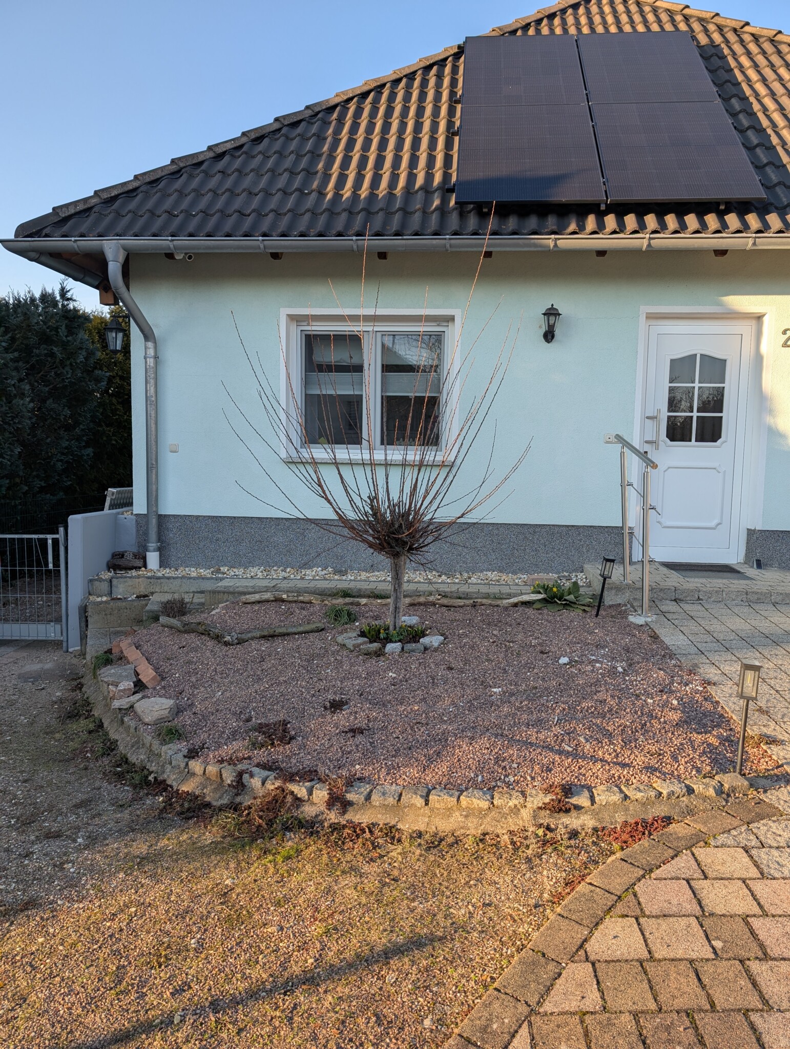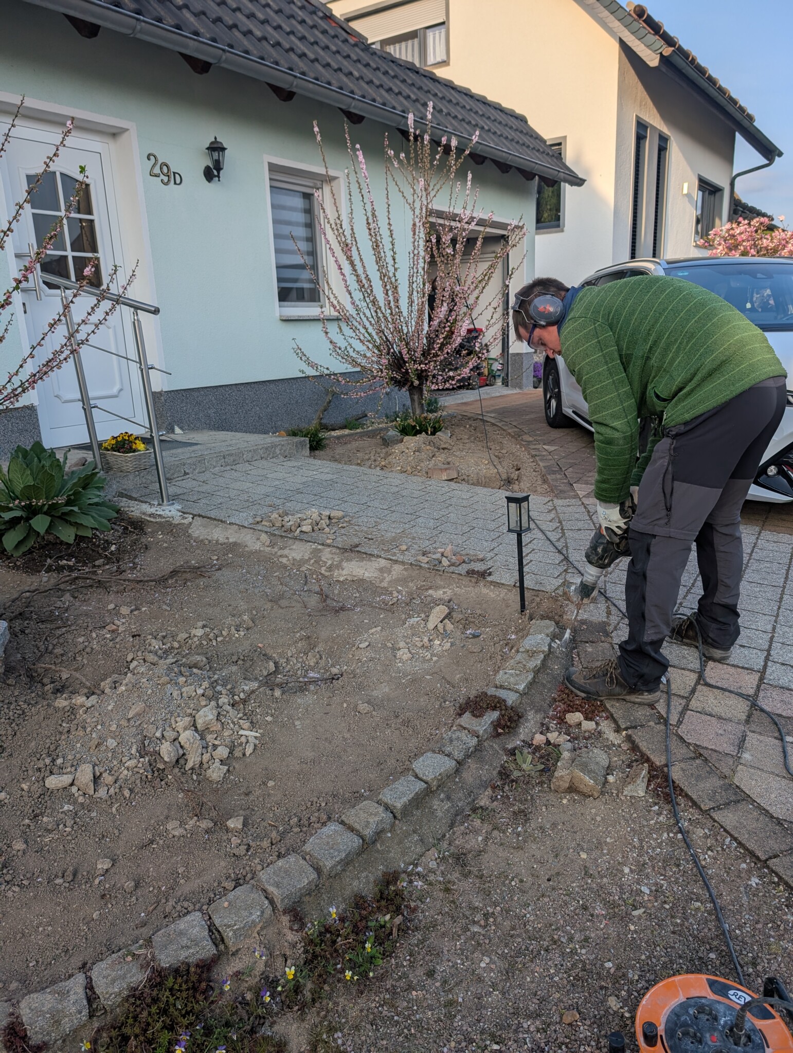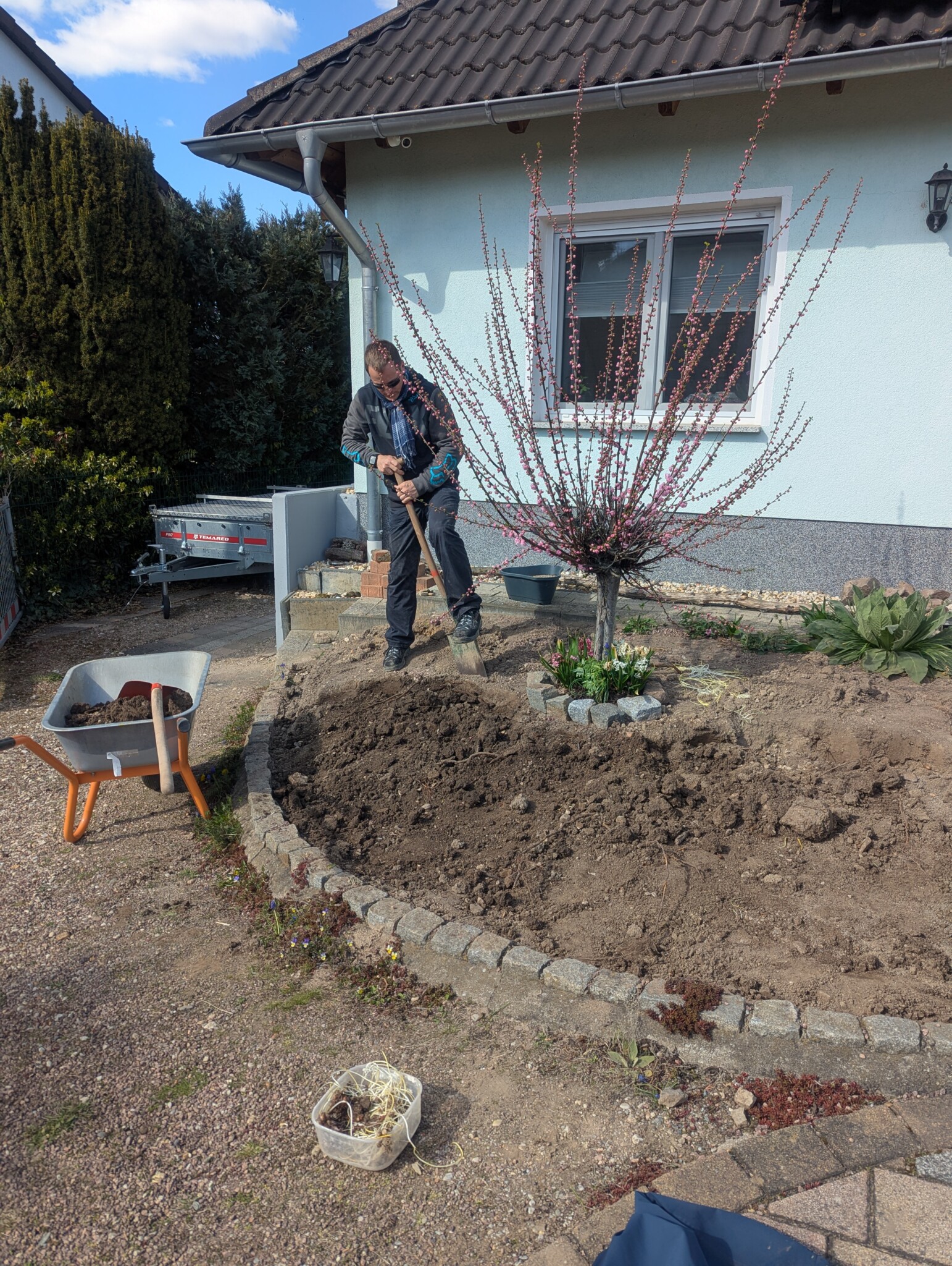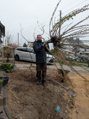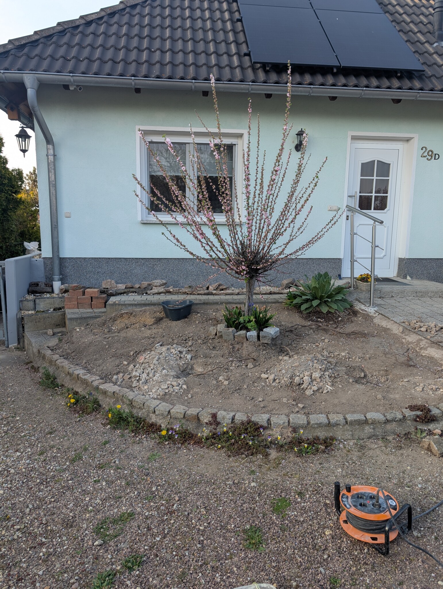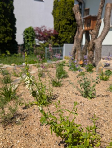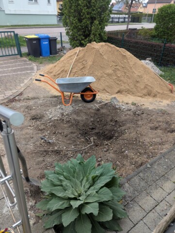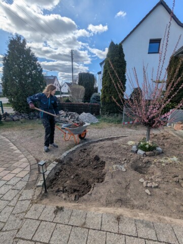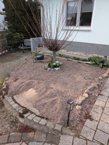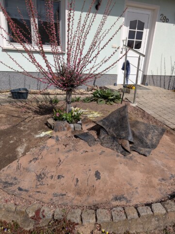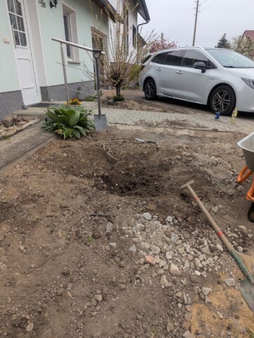 Als wir vor etwa einem Jahr unser Haus gekauft haben, war schnell klar: Der Vorgarten muss sich verändern – und zwar gründlich. Was wir vorfanden, war eine lebensfeindliche Splittlandschaft: angeschütteter Boden, ein einzelnes Mandelbäumchen, dicke Teichfolie darunter und eine Schicht aus Splitt obendrauf. Kein Grün, kein Leben – stattdessen ein Ort, an dem der Splitt abrutschte und sich sonst niemand wohlfühlte.