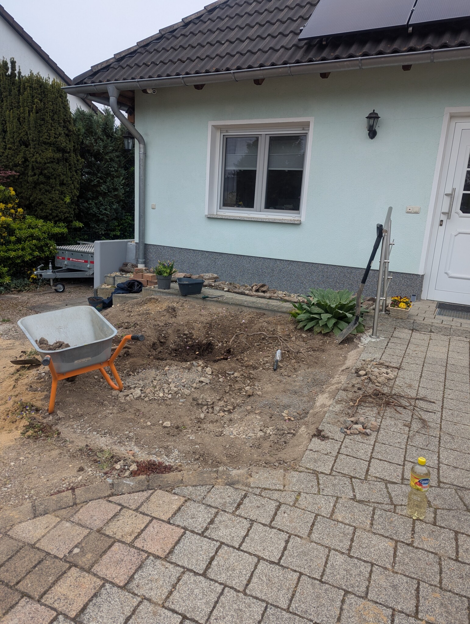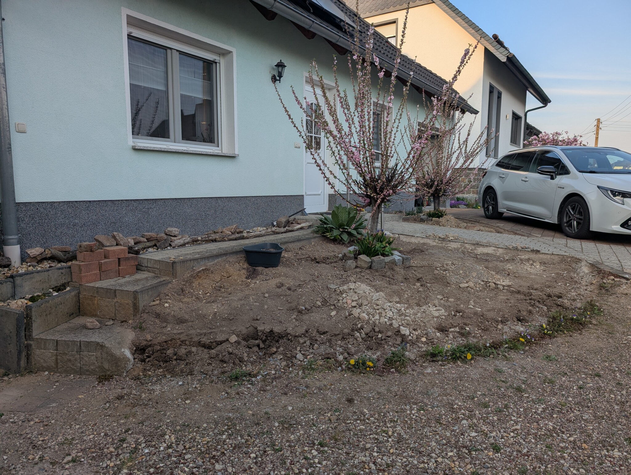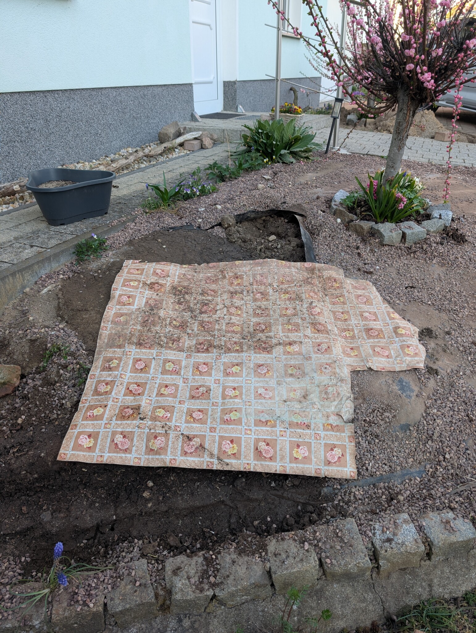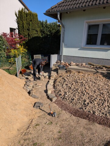 Im Frühjahr ging es dann ans Eingemachte: Der Splitt kam raus, darunter lag – Überraschung! – eine schwarze Teichfolie. Und darunter wiederum… eine Wachstuch-Tischdecke. Offenbar war hier alles erlaubt, was irgendwie abdichtet. Auch das alte Betonfundament musste weg – per Schlagbohrmaschine. Die Betonreste wurden direkt als Drainagematerial wiederverwendet. Beim Rückbau entdeckten wir sogar ein paar Überlebenskünstler: Blumenzwiebeln unter der Folie, die noch Lebenszeichen von sich gaben. Diese haben wir vorsichtig geborgen und in einem Eimer zwischengelagert – vielleicht blühen sie im nächsten Jahr wieder auf. Auch der weiße Mauerpfeffer, der sich zwischen den alten Steinen angesiedelt hatte, wurde natürlich gerettet und später wieder eingebaut. 🌸