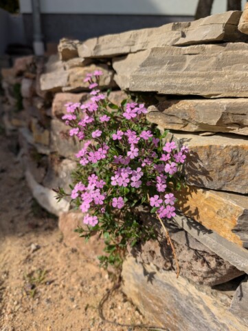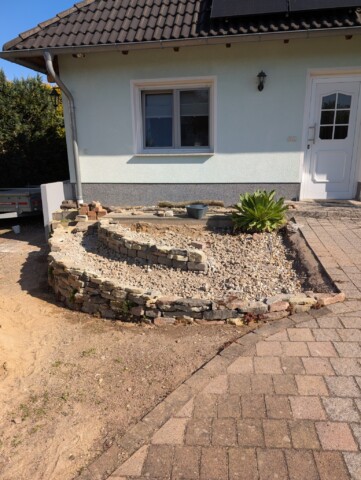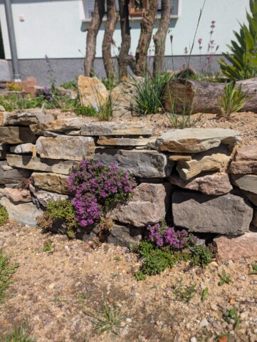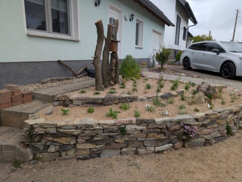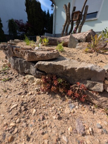 Den zuvor entfernten Splitt haben wir direkt sinnvoll weiterverwendet – für das Fundament der Mauer. Unten begannen wir mit den großen Brocken, darüber folgten Schicht für Schicht die kleineren Steine. Es waren gefühlt tausend Stück – und natürlich schien keiner auf Anhieb zu passen. Also hieß es probieren, schieben, fluchen, lachen – und weitermachen. 😉 Aber mit Geduld und Teamwork wuchs Stein für Stein unsere Mauer – auf die wir richtig stolz sind. 🤩 In die Lücken wurden direkt insektenfreundliche Pflanzen gesetzt – mit dem Ziel, dass es bald in jeder Ritze blüht, summt und brummt. 🐝 🌱🌸 Zur Abstützung der Rückseite kam Recyclingmaterial zum Einsatz. Eine zweite kleinere Mauer entstand zur Terrassierung, um den Höhenunterschied zum Haus auszugleichen – auch hier wurde der alte Mauerpfeffer wieder eingesetzt.