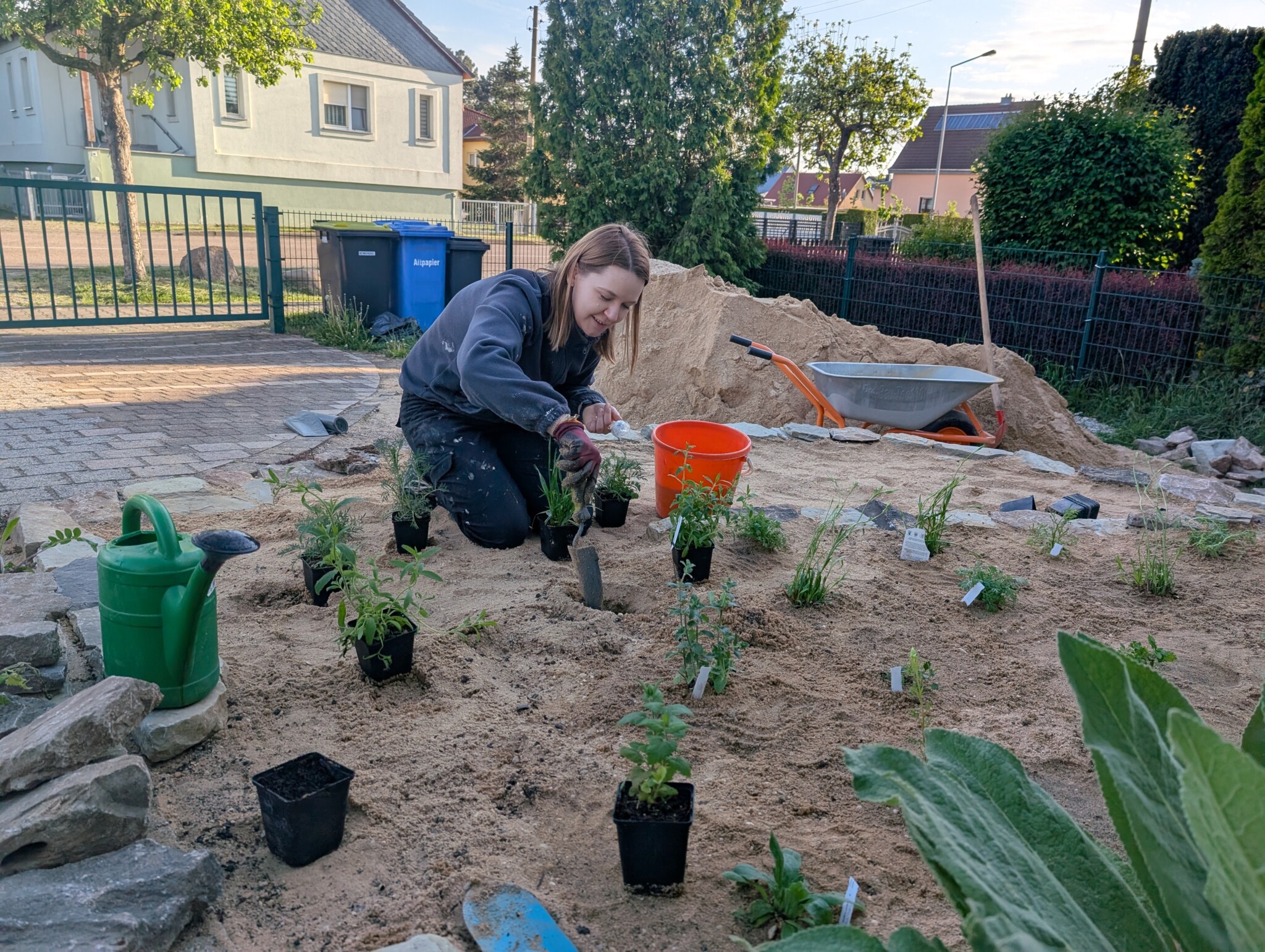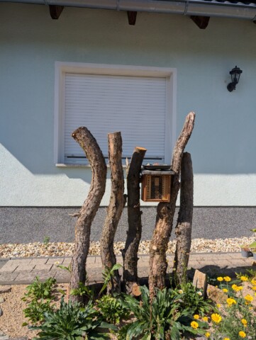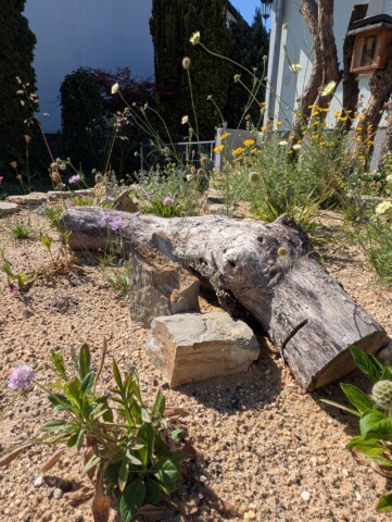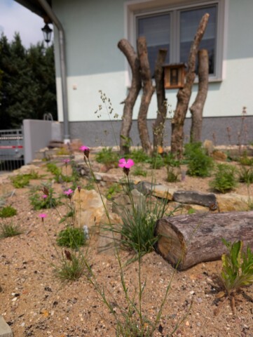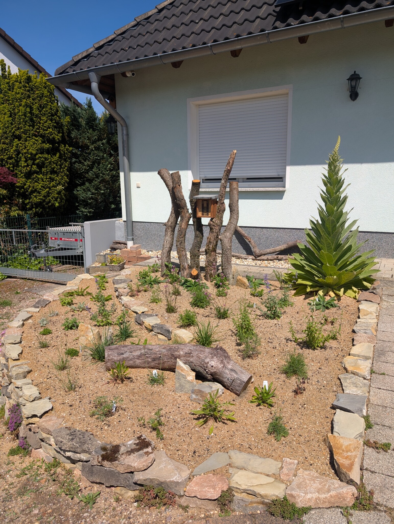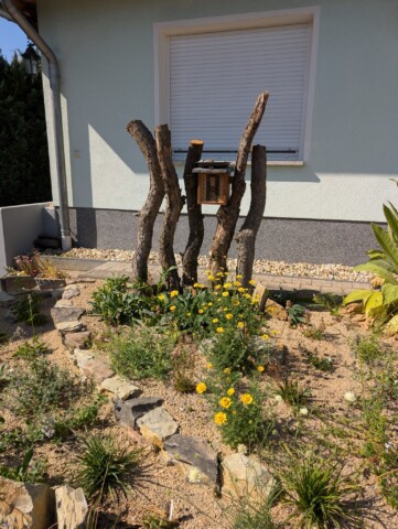 Auf das vorbereitete Beet kam dann eine rund 30 cm starke Schicht Kiessand (0/8), ergänzt mit einer dünnen Kompostlage für die Wasserspeicherung. Herzstück: das stehende Totholz. Es stammt von unserer Schwägerin, die bei der Kulturstiftung arbeitet – die Stämme waren zur Entsorgung vorgesehen, wir durften sie retten. Damit sie sicher stehen, wurden sie mit Bewehrungsstahl und einem Querholz verankert. Zwischen zwei Stämmen haben wir eine Insektennisthilfe eingebaut. Mulch gibt’s bei uns nicht – der offene Sand bleibt bewusst frei, damit bodennistende Wildbienen graben können. Und siehe da: Schon während der Bauphase kamen erste „Besucher“ vorbei und testeten unseren Sandhaufen. 🐝😊