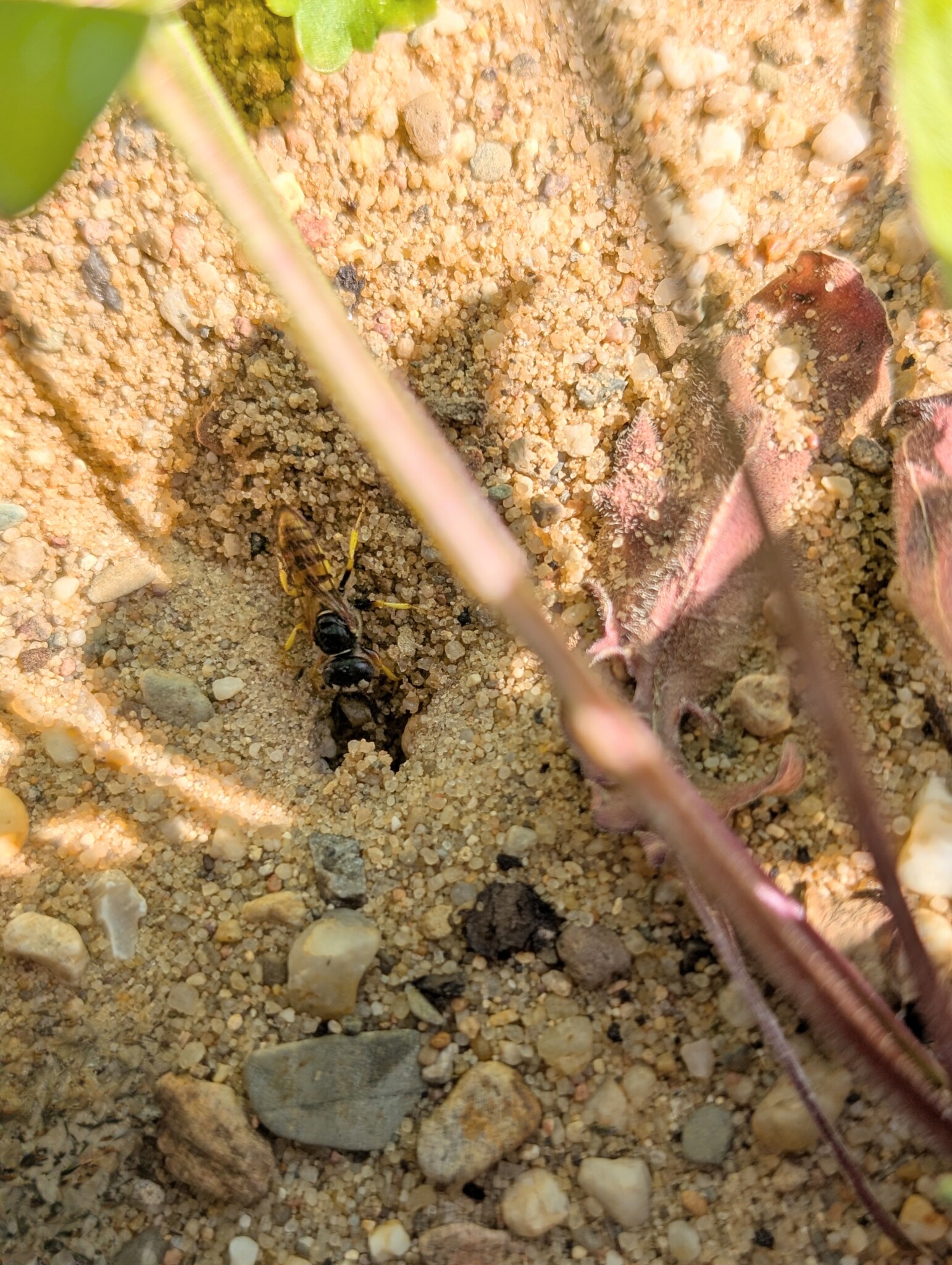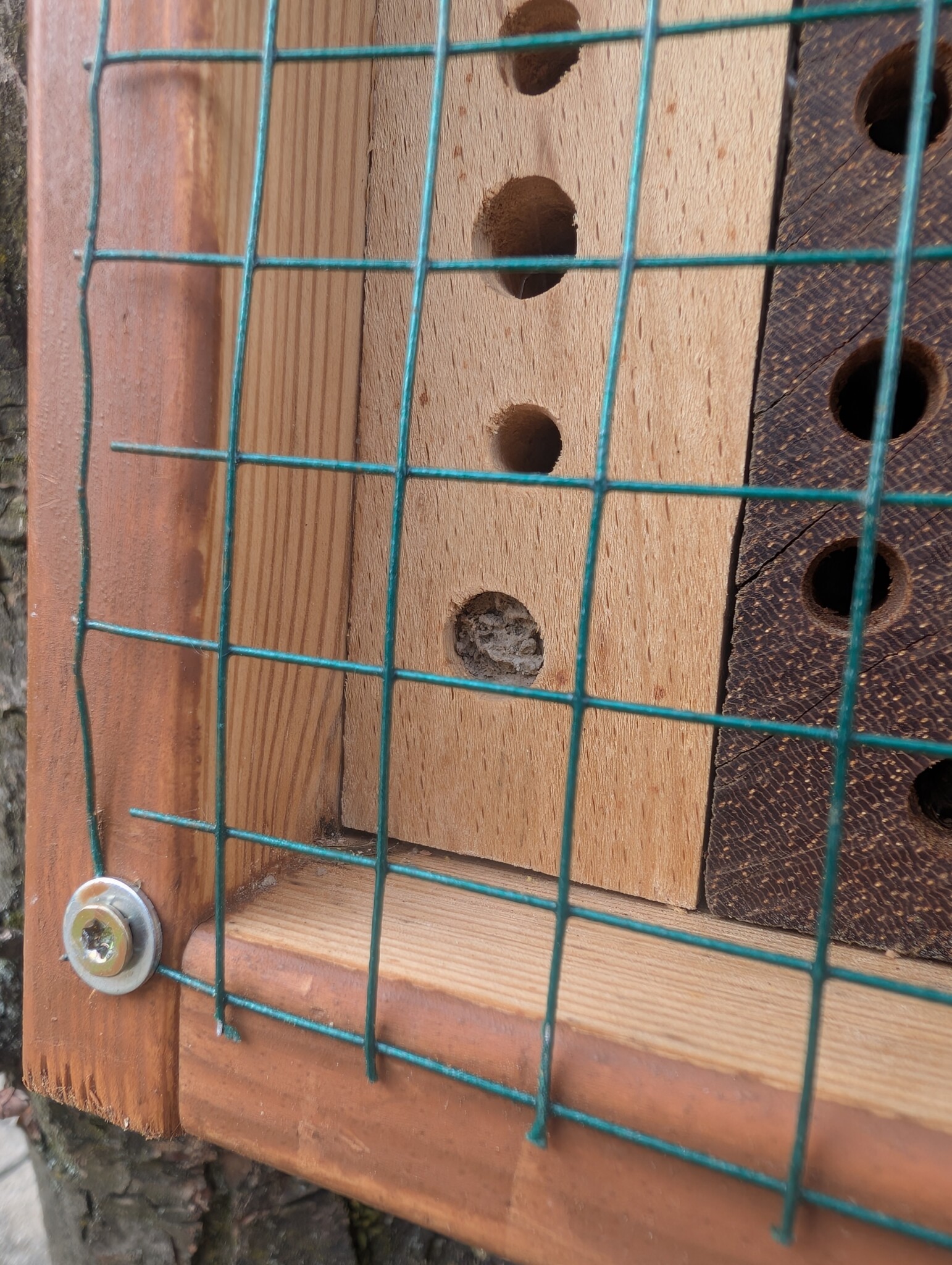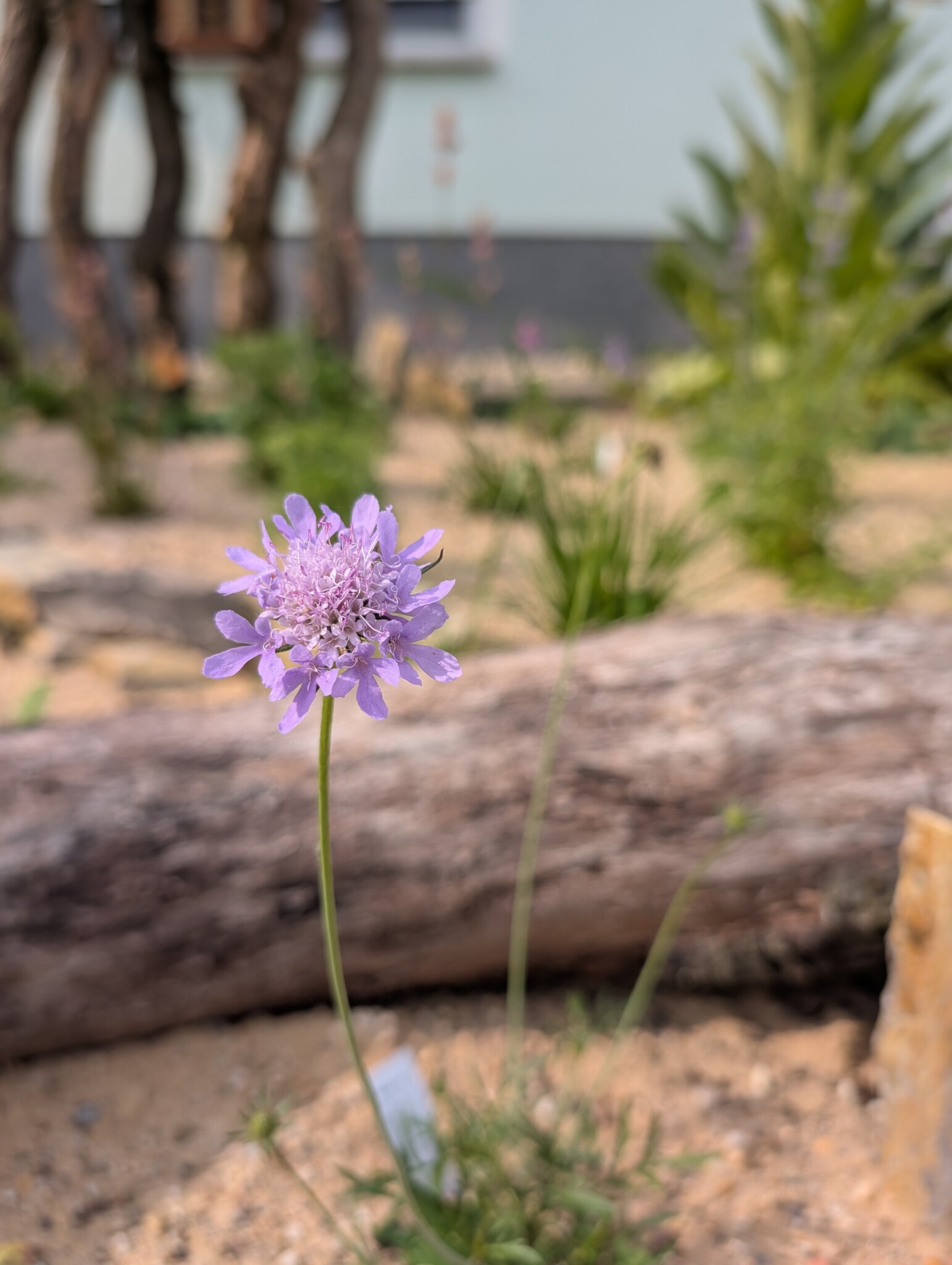 Auf das vorbereitete Beet kam dann eine rund 30 cm starke Schicht Kiessand (0/8), ergänzt mit einer dünnen Kompostlage für die Wasserspeicherung. Herzstück: das stehende Totholz. Es stammt von unserer Schwägerin, die bei der Kulturstiftung arbeitet – die Stämme waren zur Entsorgung vorgesehen, wir durften sie retten. Damit sie sicher stehen, wurden sie mit Bewehrungsstahl und einem Querholz verankert. Zwischen zwei Stämmen haben wir eine Insektennisthilfe eingebaut. Mulch gibt’s bei uns nicht – der offene Sand bleibt bewusst frei, damit bodennistende Wildbienen graben können. Und siehe da: Schon während der Bauphase kamen erste „Besucher“ vorbei und testeten unseren Sandhaufen. 🐝😊