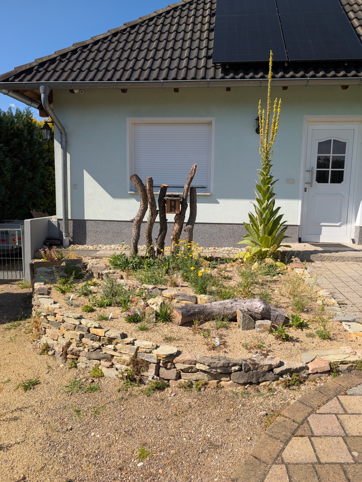 Nach sorgfältiger Auswahl wurden schließlich heimische Wildstauden und Gräser gesetzt – nicht ganz exakt nach Plan, aber mit viel Liebe. Denn während der Baumaßnahmen habe ich mich an der linken Hand verletzt und konnte nur mit „halber“ Kraft mitwirken. Das war echte Teamarbeit. Ein weiterer Totholzstamm fand als dekoratives Element und zusätzlicher Lebensraum noch Platz, ebenso wie einzelne Akzentsteine für Sonnenplätze und Sitzmöglichkeiten für Insekten. Im Herbst sollen noch Frühblüher einziehen, um das Nahrungsangebot zu erweitern. 🌱🌸 Außerdem soll die Fläche rechts vor dem Haus auch noch umgestaltet werden. Dort sorgen dann ein Steinhaufen, Totholz und heimische Stauden für Leben und schmücken die Fläche ganz natürlich. 😊🌸