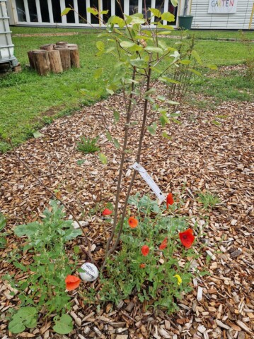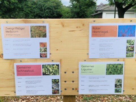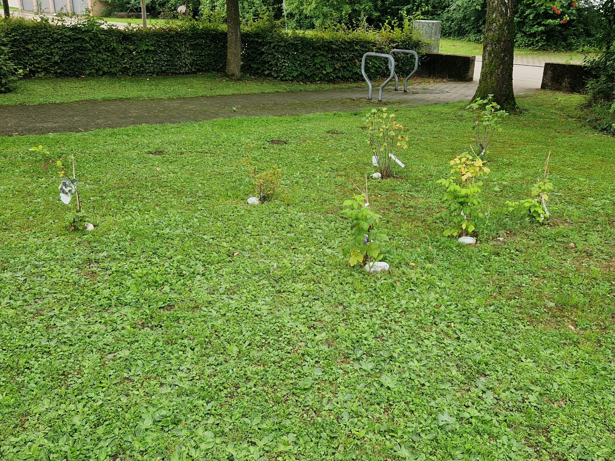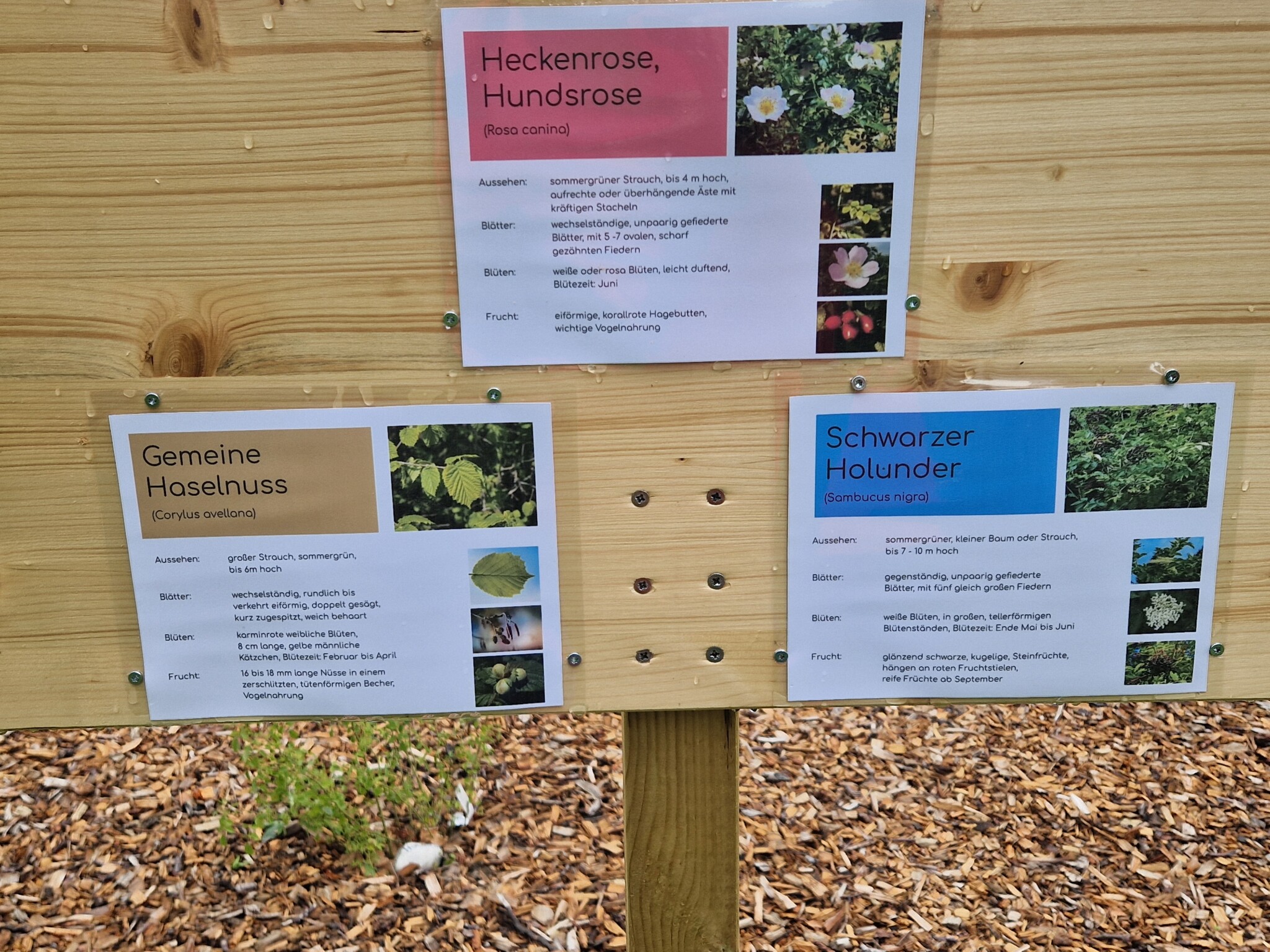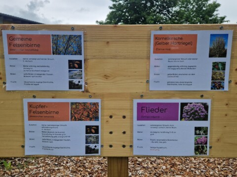 Die Klassen 4a und 4b pflanzten rund um den Sitzbereich sorgfältig ausgewählte heimischen Sträucher, die nach ausführlicher Recherche mit Informationstafeln versehen wurden. In einem Teilbereich des grünen Klassenzimmers wurden zusätzlich verschiedene Beerensträucher zum Naschen gepflanzt.