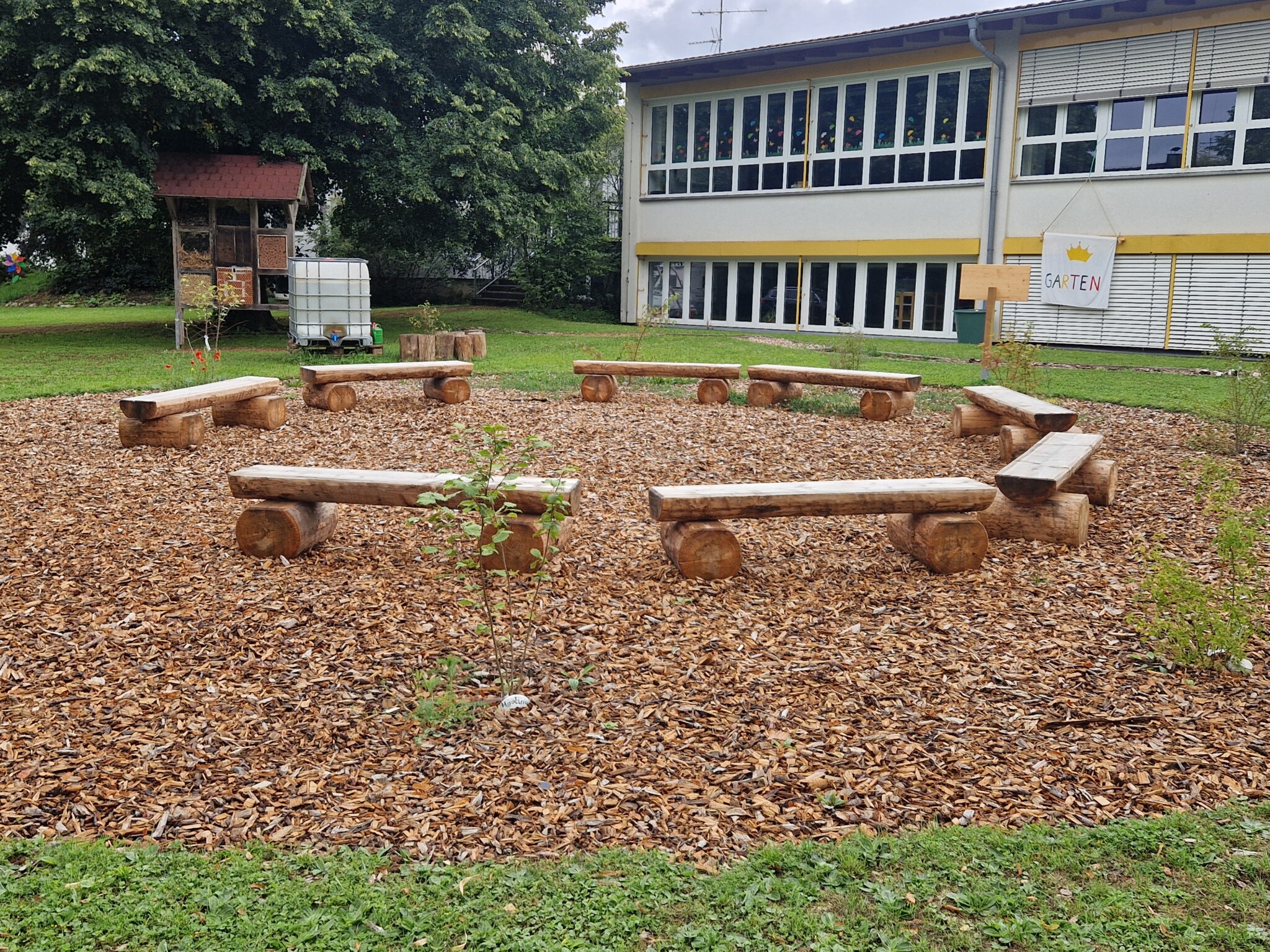 Die dritte Klasse übernahm die Vorbereitung des Bodenbereichs für die neue Sitzgelegenheit des grünen Klassenzimmers. Nach dem Verlegen von Unkrautvlies und dem Ausbringen von Holzschnitzeln wurden acht Holzbänke, gefertigt und gespendet von der Schreinerei Walter, aufgestellt. Zusätzlich gestalteten die Kinder im WG-Unterricht fantasievolle Baumgesichter zur weiteren Verschönerung des Bereichs.