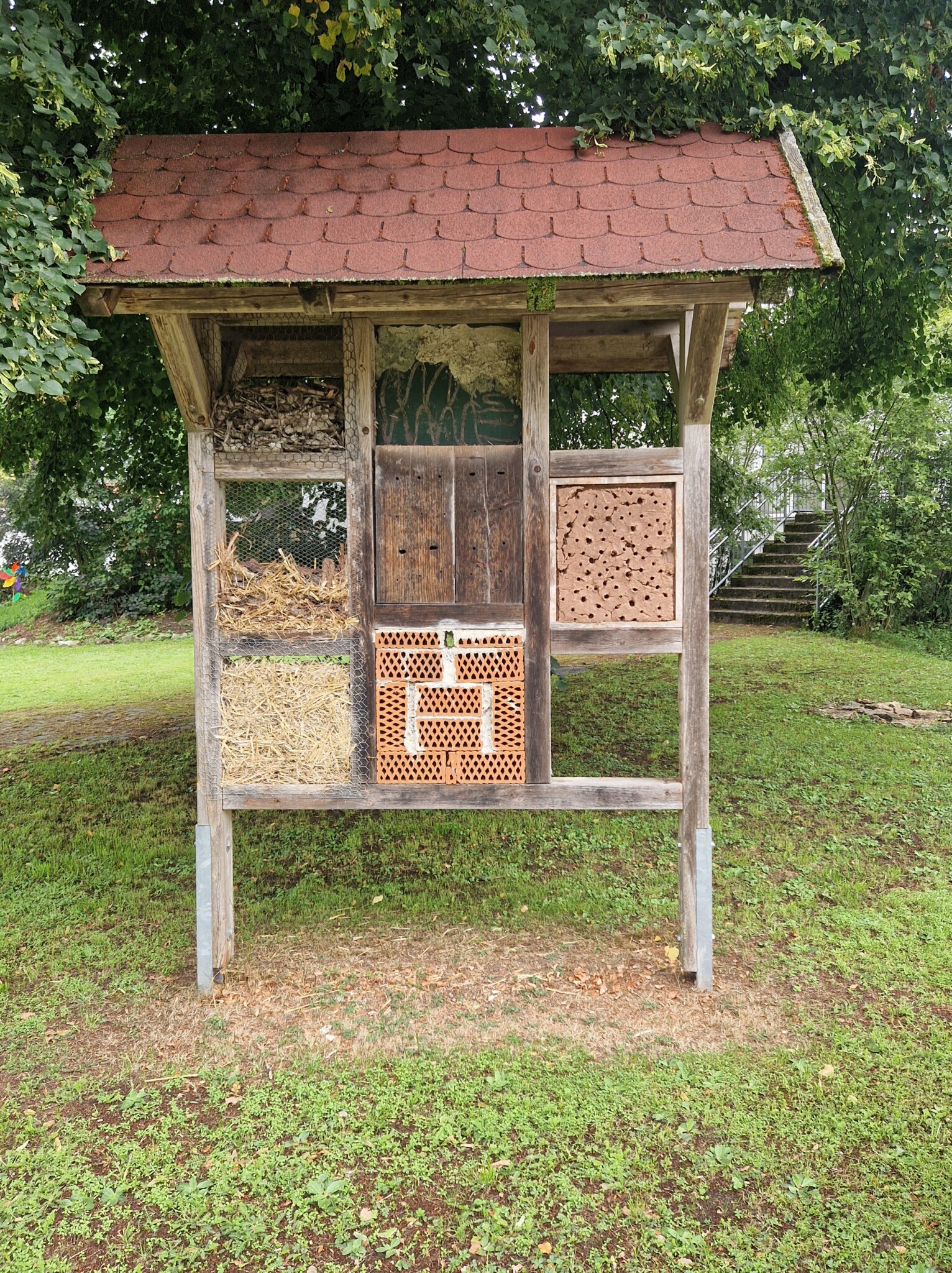 Die Klasse 2a gestaltete den Bereich rund um das schulinterne Theatrum neu, pflanzte verschiedene Kräuter und Zwergspieren und renovierte die Römerfiguren auf dem Pausenhof durch frische Anstriche. Das große Insektenhotel wurde renoviert und neu befüllt. Um die Insekten mit Nahrung zu versorgen und einen Lebensraum zu schaffen, wurde eine Blühwiese abgesteckt, die von der Klasse 2c mit kleinen Insektenhotels in Form von Bienen verziert wurde.