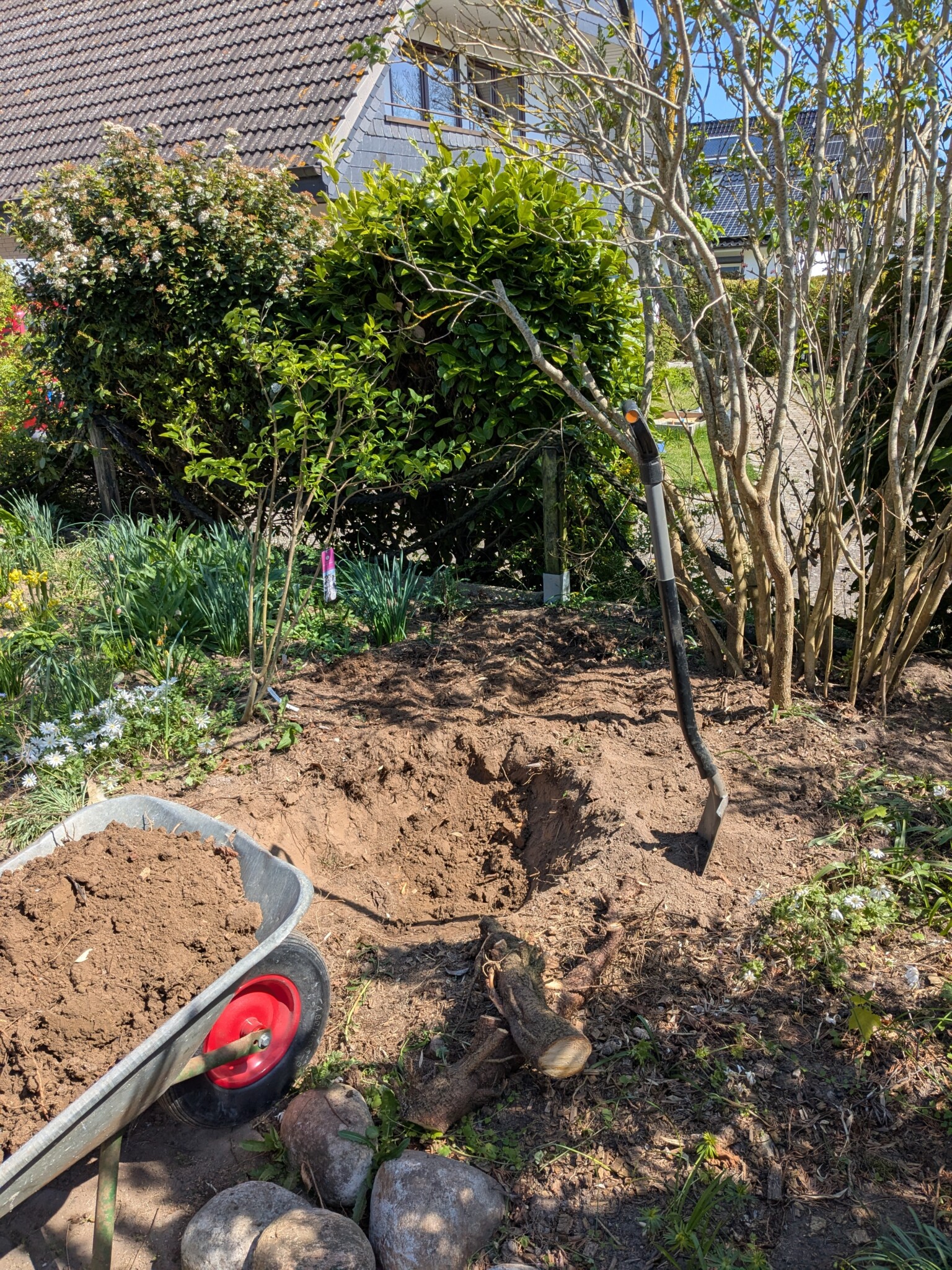 Als erstes entstand ein Sandarium: Dafür haben wir die Erde etwa 50 cm tief ausgehoben und eine Drainageschicht aus Kies eingebracht. Anschließend füllten wir das ausgehobene Loch mit Füllsand aus einer nahegelegenen Sandkuhle. Der Sand hat eine Körnung von 0–8 mm, enthält Lehmanteile und eignet sich somit bestens als Nistgrundlage für bodennistende Wildbienen und andere Insekten. Mit einem Durchmesser von etwa 1 Meter bietet das Sandarium eine ausreichend große Fläche für verschiedene Arten.